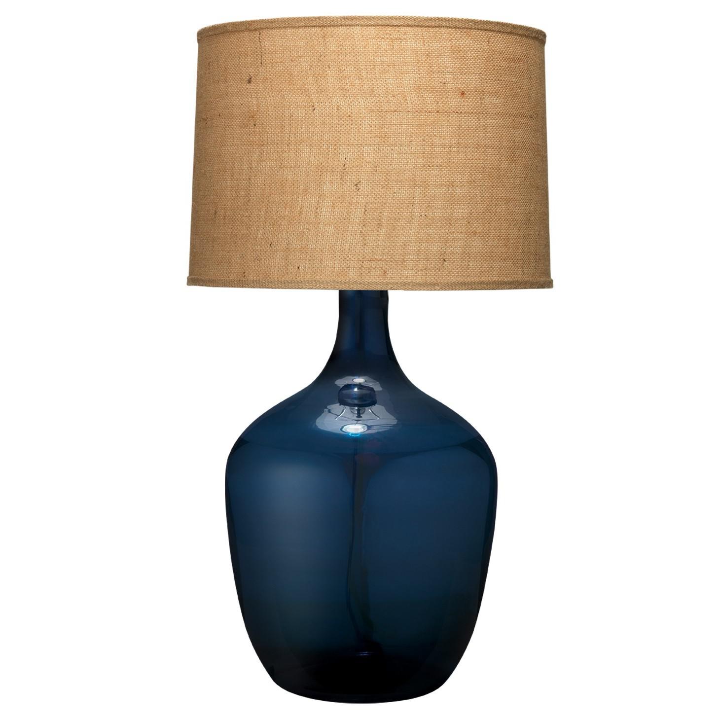 Design Plus Gallery presents a pair of Extra Large Plum Jar Table Lamps by Jamie Young. Elegant glass adds sophistication and character to any space. This perfect pair of navy blue glass accents nautical and glamorous décor alike! Accompanied with a natural burlap drum shade.