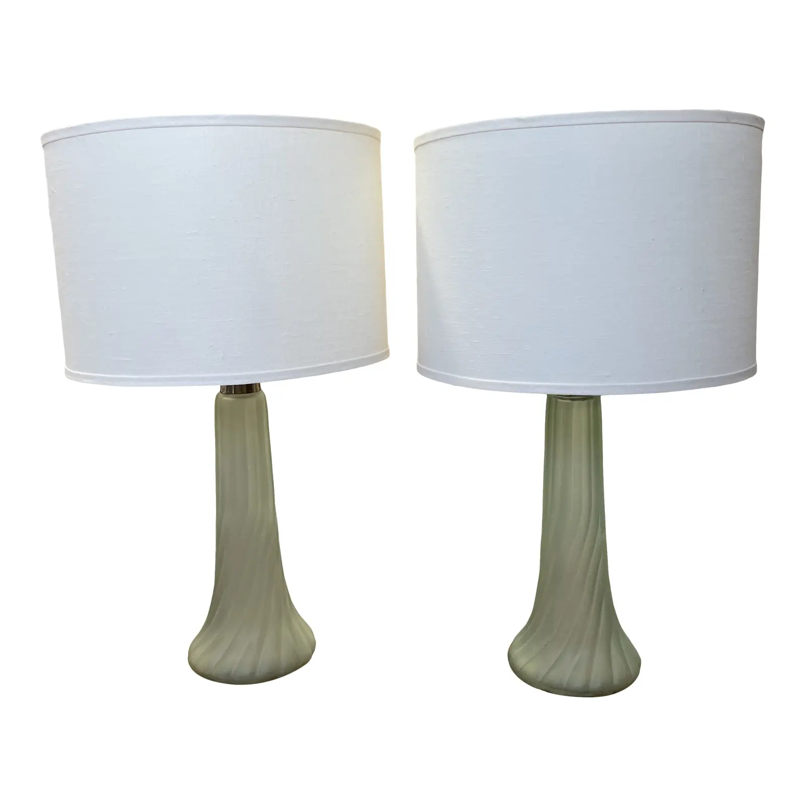 Design Plus Gallery presents a pair of Jamie Young Fluted Sea Foam Green Table Lamps. Made in India. Frosted glass is fluted and twists from the base to the top. Comes with coordinating final of same glass. Two linen barrel shades are in good condition. Minor wear. Tone of glass is similar to sea glass.