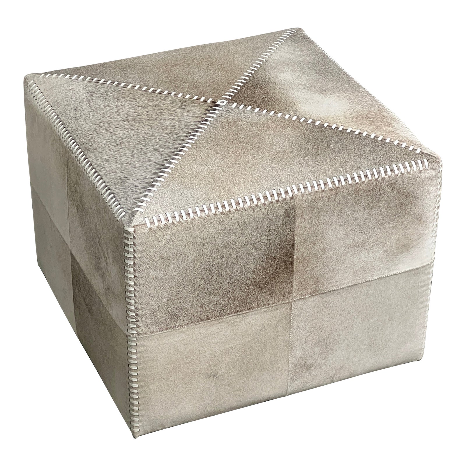 Design Plus Gallery presents a Large Ottoman by Jamie Young. Beautiful natural gray hide and white hide finishes create this collection.Great for rustic, modern, lodge, urban or country environments. This assortment of art brings great natural textures inside the home. In good condition, minimal wear form usage. Made in India.