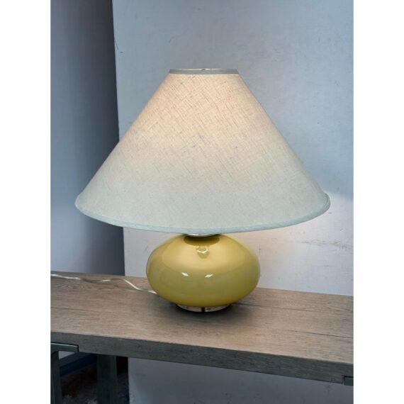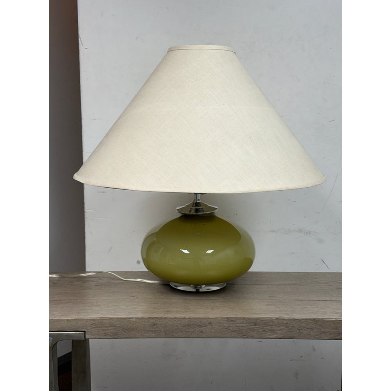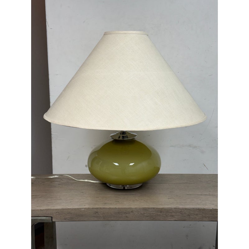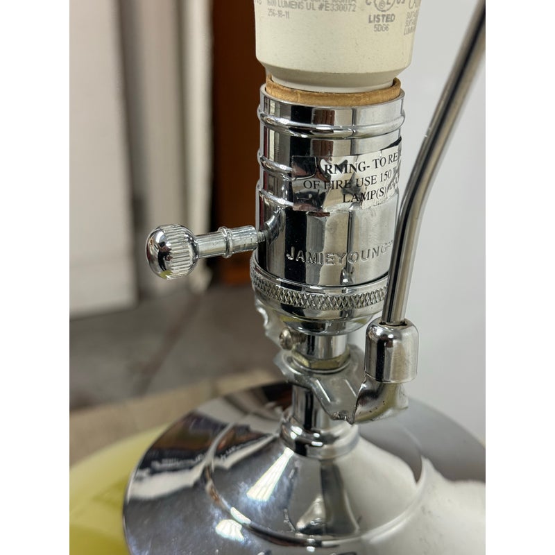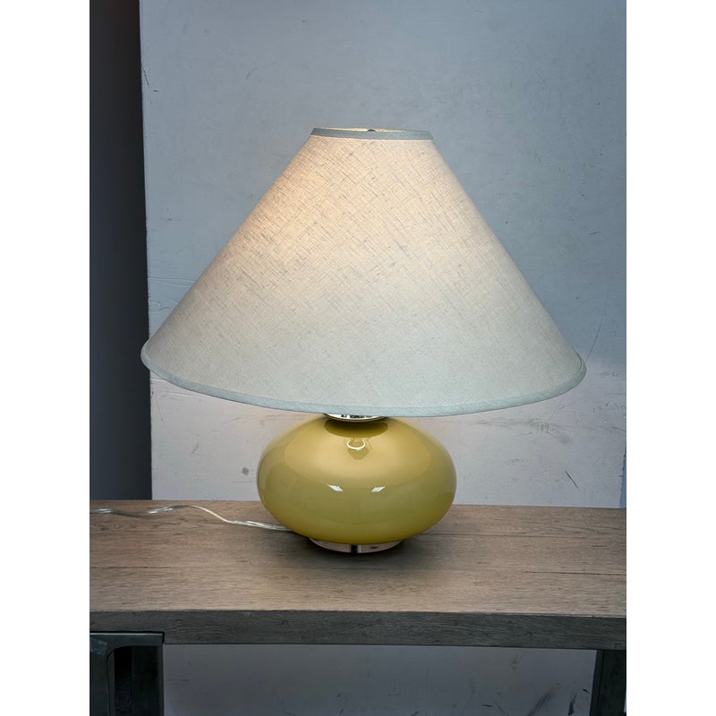 Design Plus Gallery presents a Mid Century Table Lamp from Jamie Young. Channeling mid-century cool with a playful pop of color, this lamp features a ceramic saucer-shaped body in vibrant chartreuse. A polished chrome cap adds sleek contrast, while a clear round acrylic base lends a light, floating effect. Topped with an off white coned shade, the silhouette feels both retro and refined—perfect for adding a statement moment to a console, bedside, or reading nook. Bold yet balanced, it’s a chic way to brighten the room and the mood. In good condition, visible and minimal wear.
