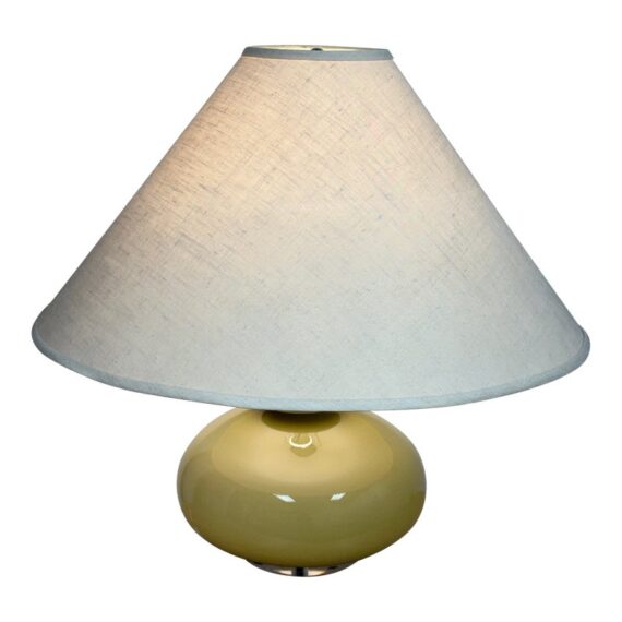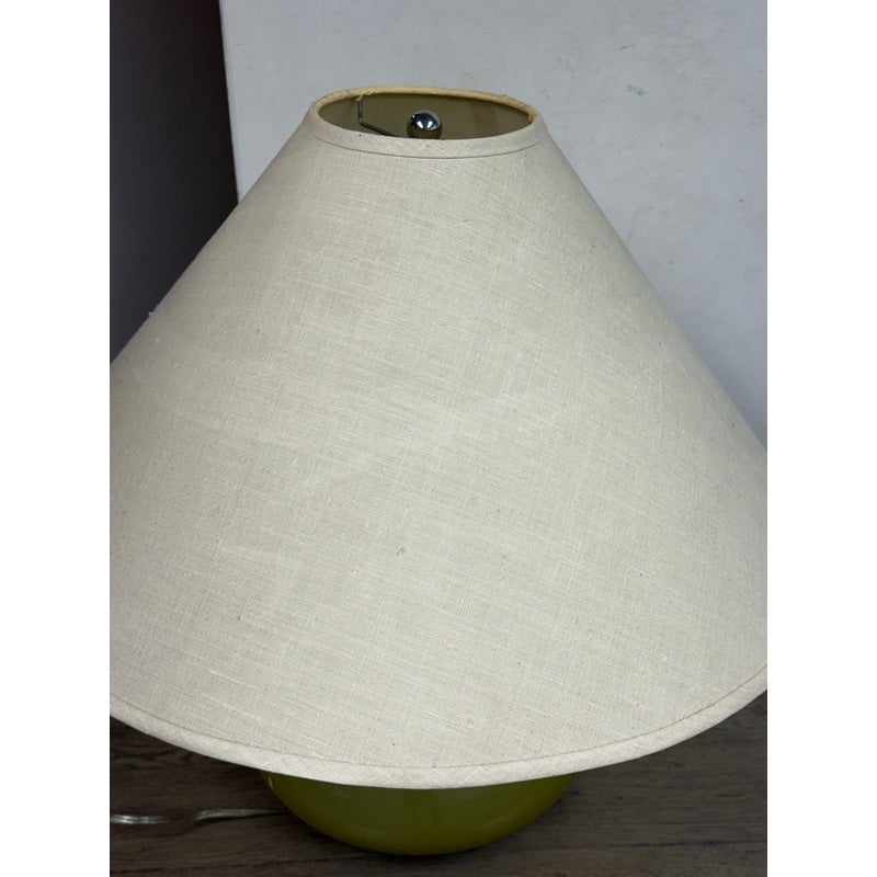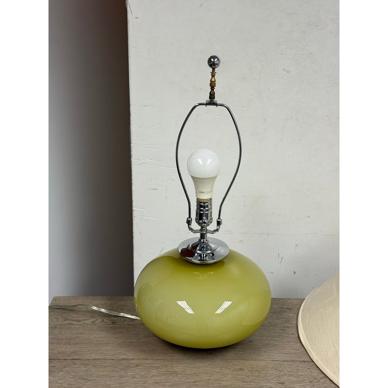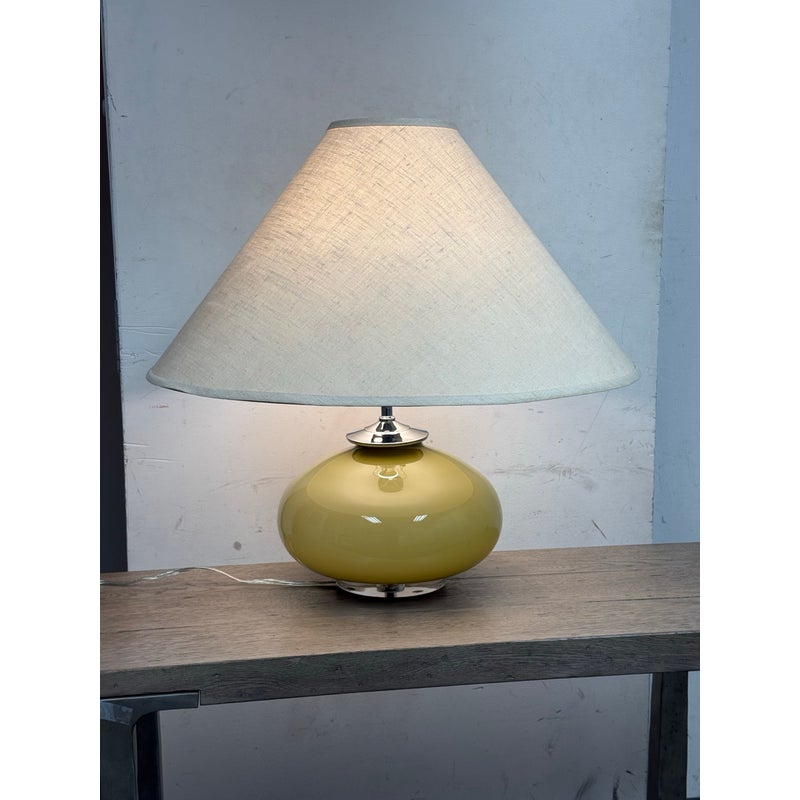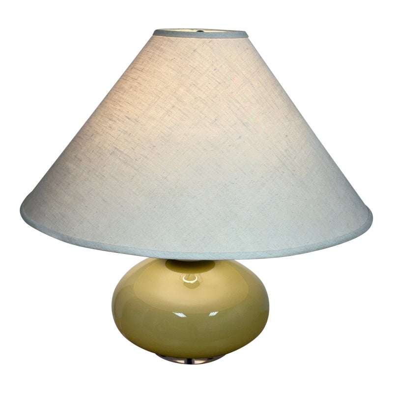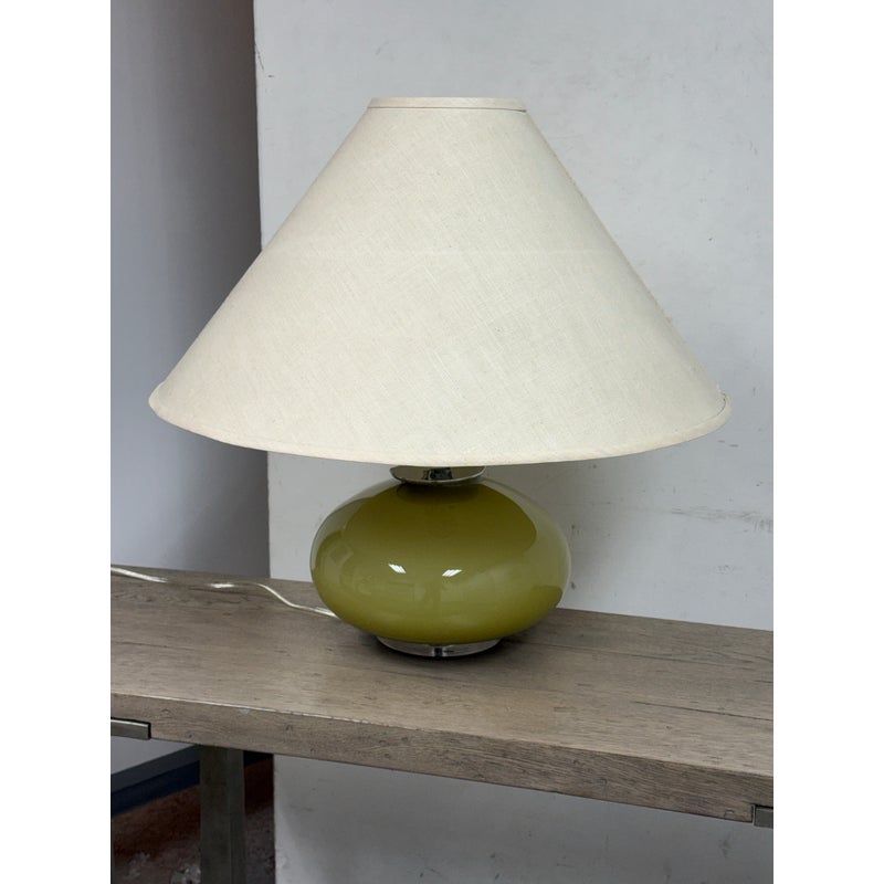 Design Plus Gallery presents a Mid Century Table Lamp from Jamie Young. Channeling mid-century cool with a playful pop of color, this lamp features a ceramic saucer-shaped body in vibrant chartreuse. A polished chrome cap adds sleek contrast, while a clear round acrylic base lends a light, floating effect. Topped with an off white coned shade, the silhouette feels both retro and refined—perfect for adding a statement moment to a console, bedside, or reading nook. Bold yet balanced, it’s a chic way to brighten the room and the mood. In good condition, visible and minimal wear.