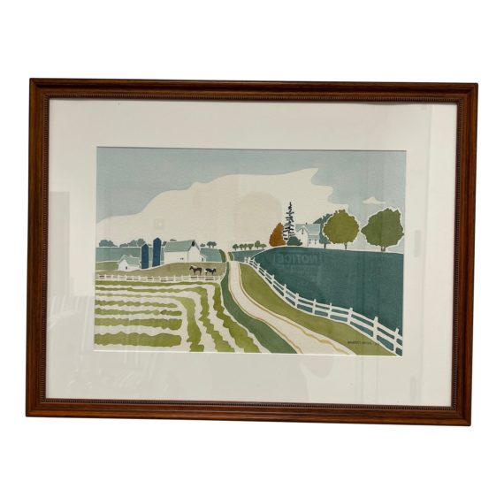 Design Plus Gallery presents a Watercolor of Farm Scene by Jane Vanderlinden. The artist focuses on simplicity in order to grasp the depth of wonder through expansion and advancement of the arts. Her piece here is the embodiment of rural farm life in Iowa, where she is a member of the artist movements in her home state. In good condition, with certification + receipt.
