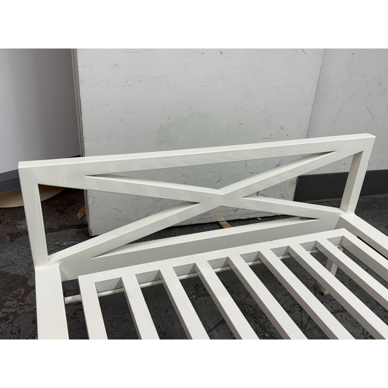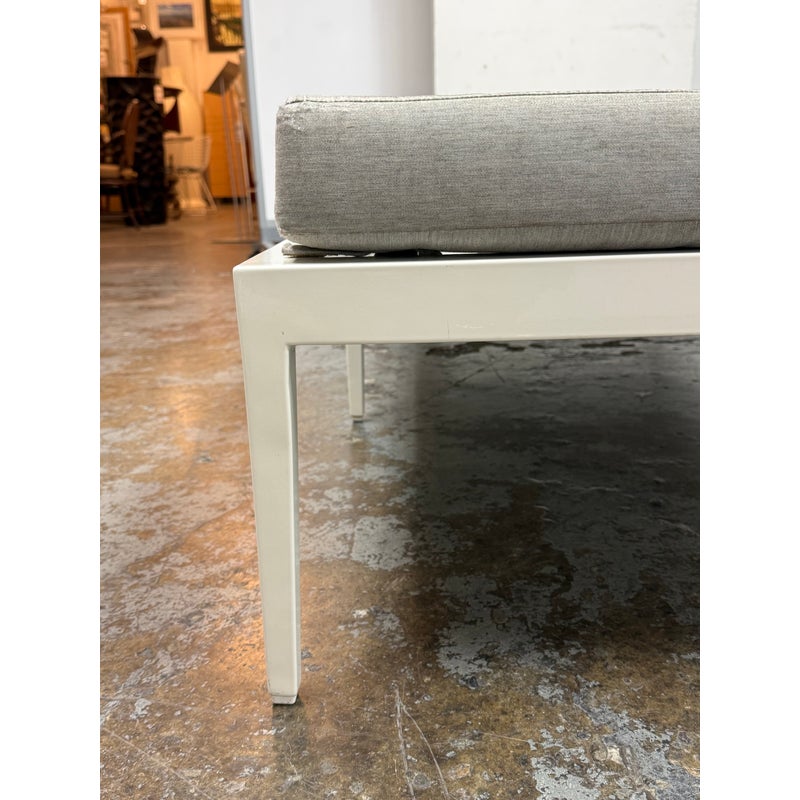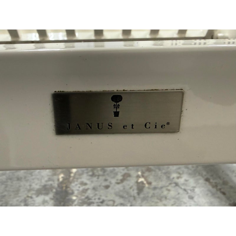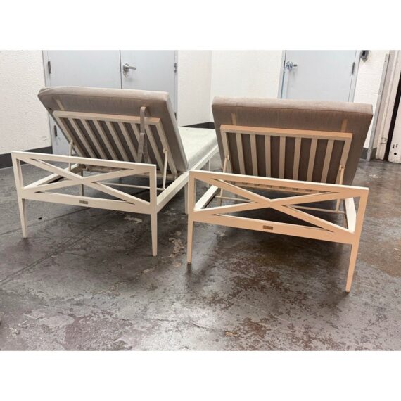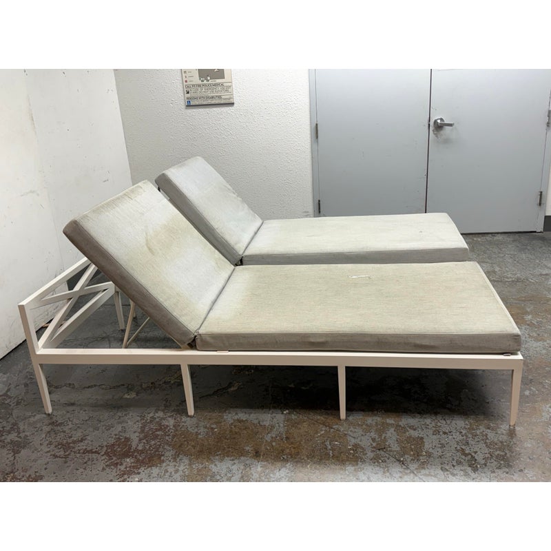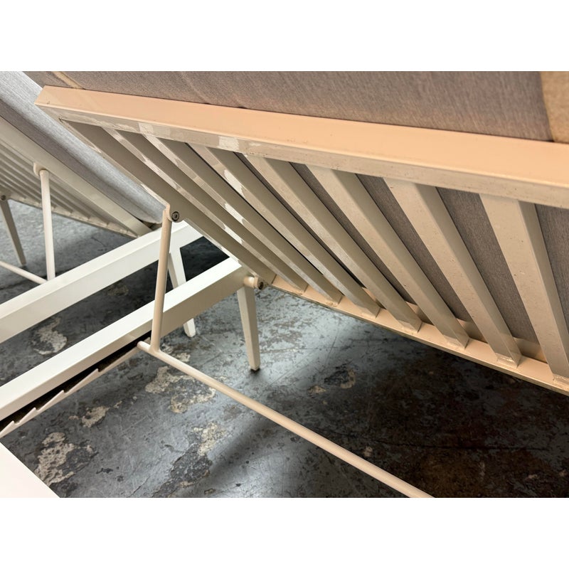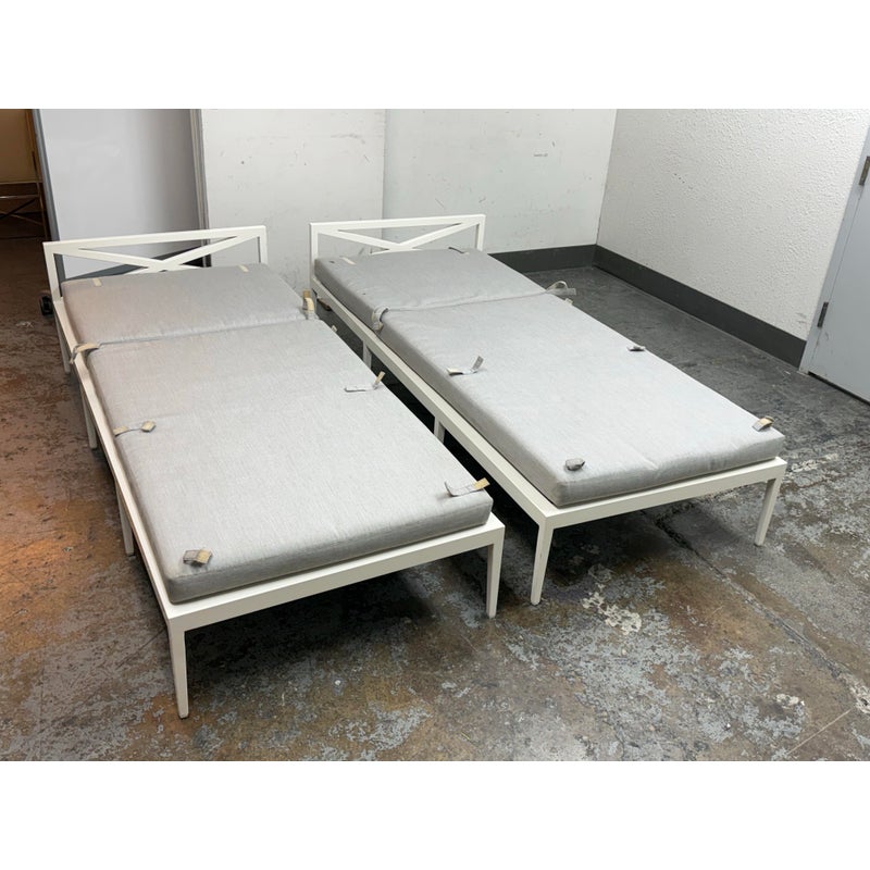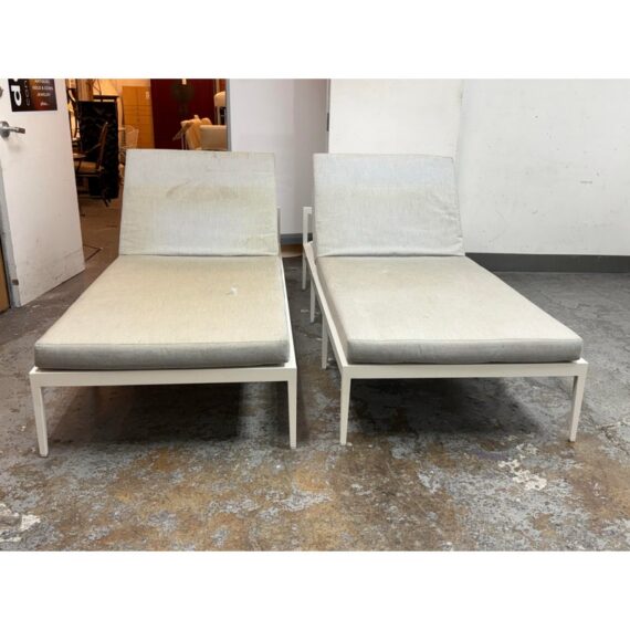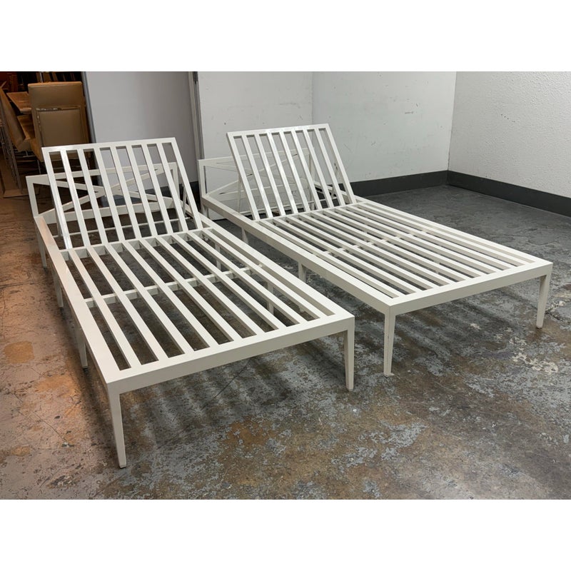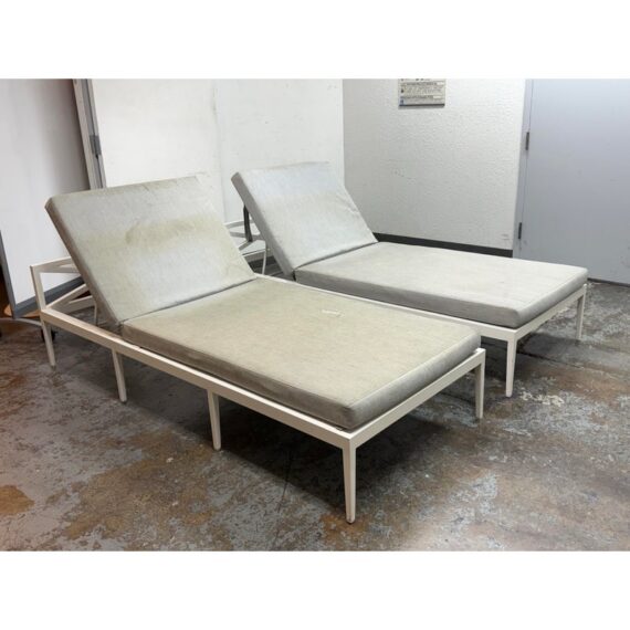 Design Plus Gallery presents Janus Et Cie Chaise Lounges. The Sun Chaise Lounges are simply elegant and radiates glamour with a casual modernist vibe. The straight lines and transitions are details requiring exacting precision and the workshop’s highest level of hand finishing. The culmination of years of experience in building performance furniture, this is the iconic contemporary chaise lounge. The brand is well renowned for the highest quality of patio furnishings, and this style is no longer in production with the brand. It is in good condition for its usage with wear that is consistent with usage. Made in the USA.