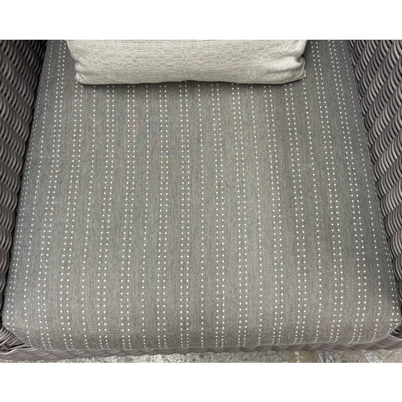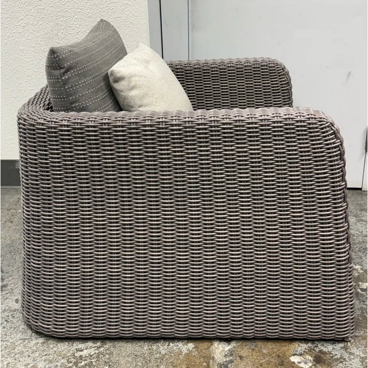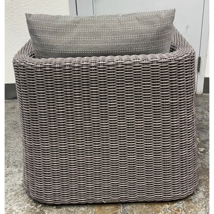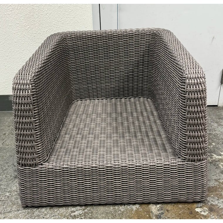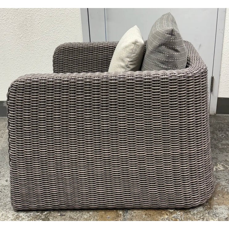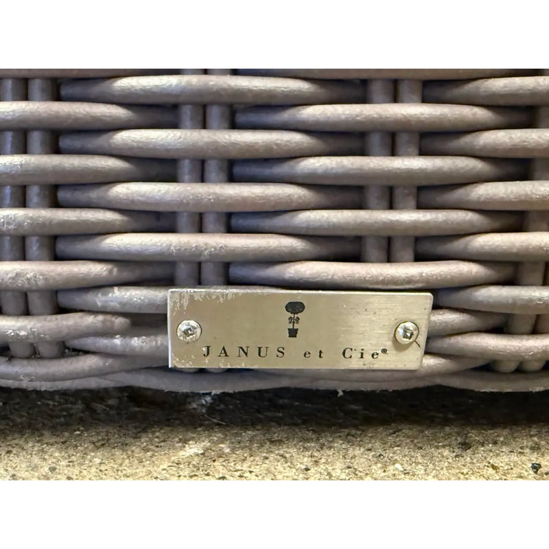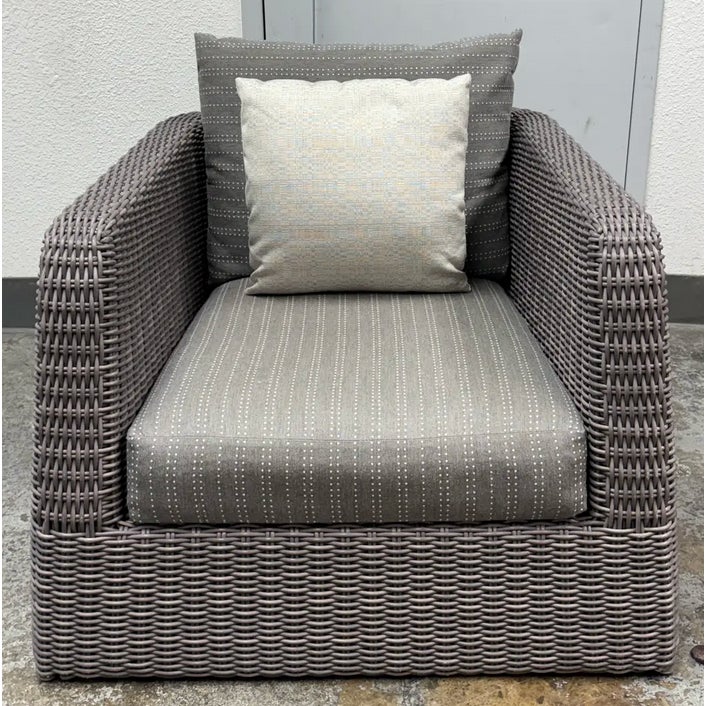 Design Plus Gallery presents the Zeya Collection Lounge Chairs from JANUS et Cie. The Zeya collection takes inspiration from vintage European design and updates it with an American spirit with generous proportions. The rattan is woven with gracefully rounded arms to soften otherwise angled silhouettes. Zeya is handwoven from their proprietary JANUSfiber in their Acacia finish. Two loose cushions with matching pattern for seat and back, with one solid throw pillow. There is a brand plate on the chair. Is in good condition for its usage.