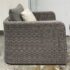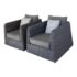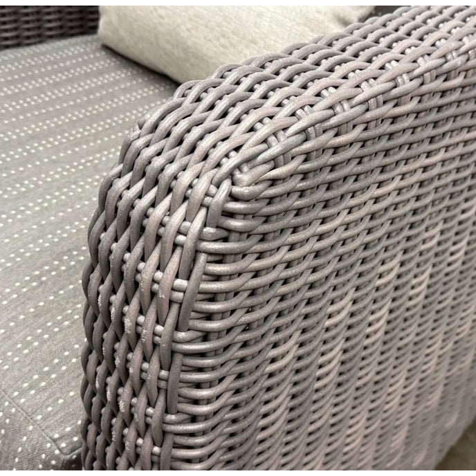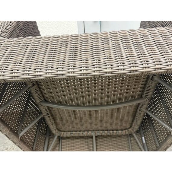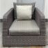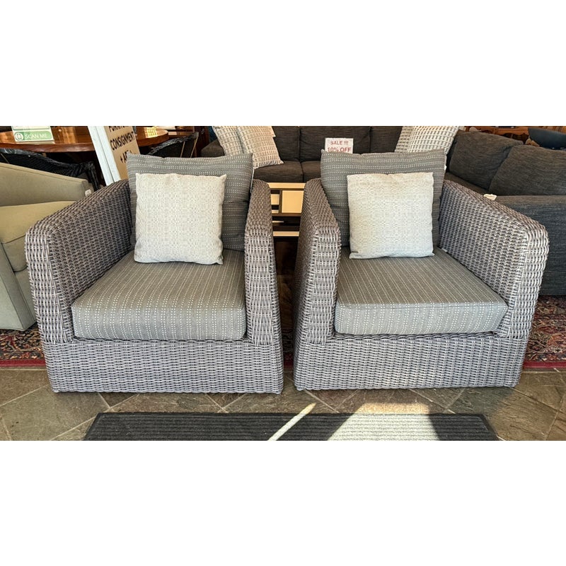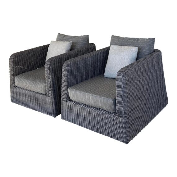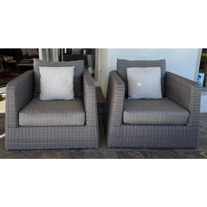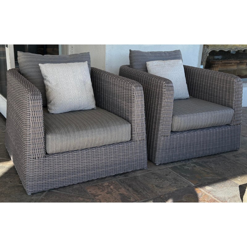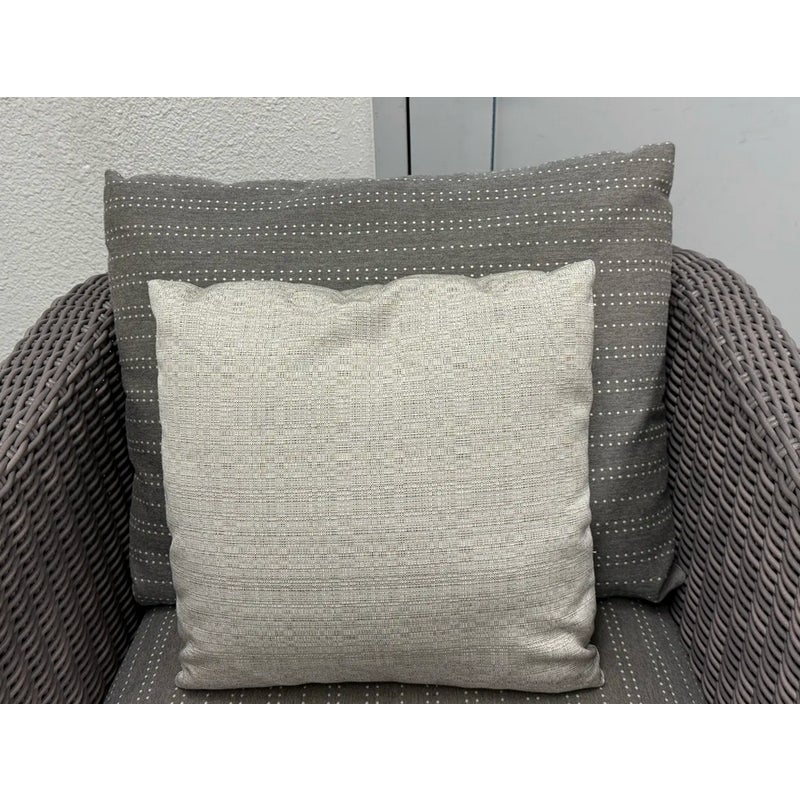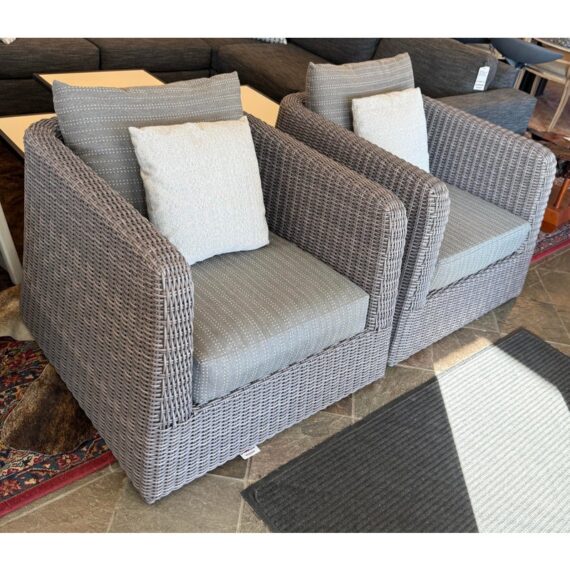 Design Plus Gallery presents the Zeya Collection Lounge Chairs from JANUS et Cie. The Zeya collection takes inspiration from vintage European design and updates it with an American spirit with generous proportions. The rattan is woven with gracefully rounded arms to soften otherwise angled silhouettes. Zeya is handwoven from their proprietary JANUSfiber in their Acacia finish. Two loose cushions with matching pattern for seat and back, with one solid throw pillow. There is a brand plate on the chair. Is in good condition for its usage.
