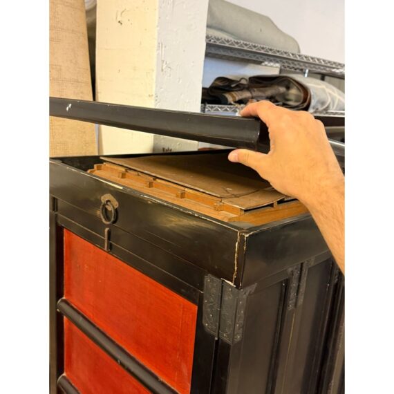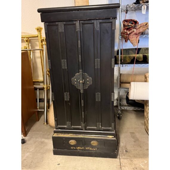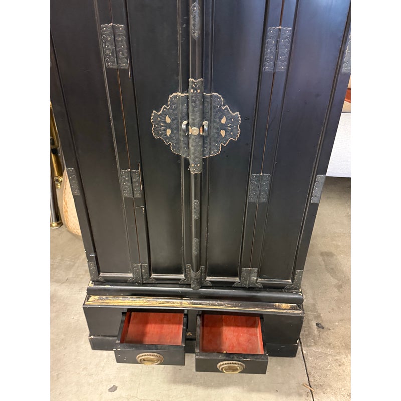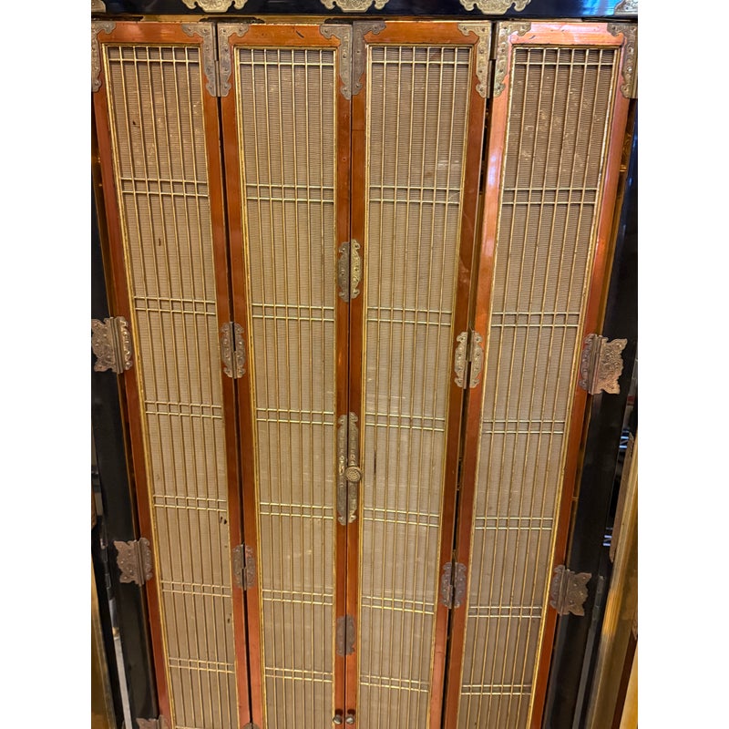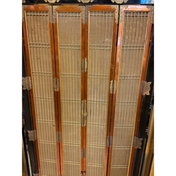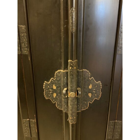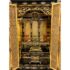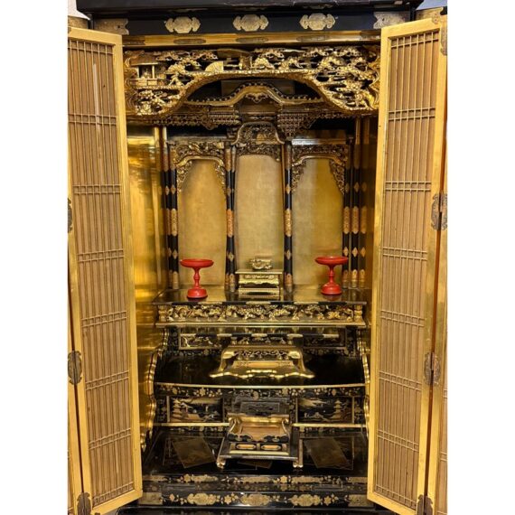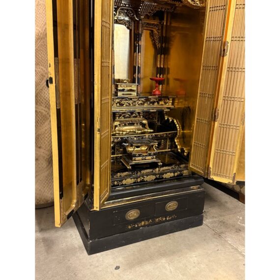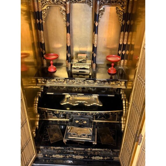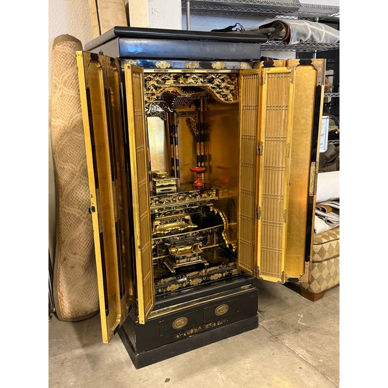 Design Plus Gallery presents a Japanese Black Lacquer Butsudan Shrine, Meiji Period (1868-1912). It is known to be a focus for religious ritual and contemplation. The case with two doors opens to interior “screen” doors, ornately carved and gilded interior. The lower case has two drawers upon a platform base. Visible wear is present but overall is in good condition for its vintage age + use.