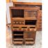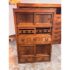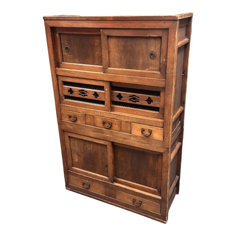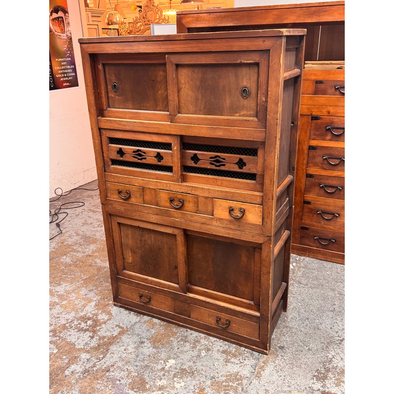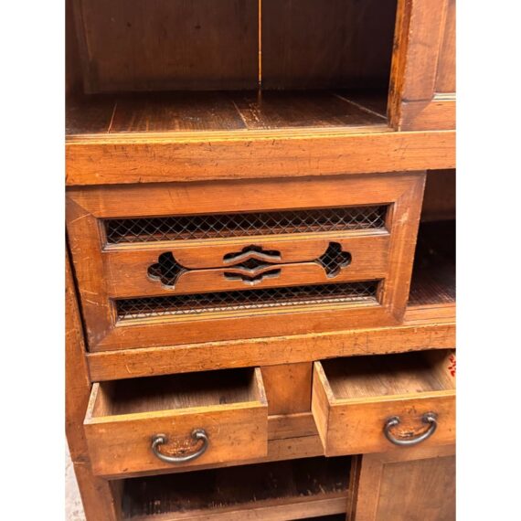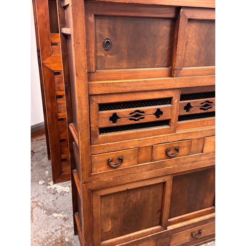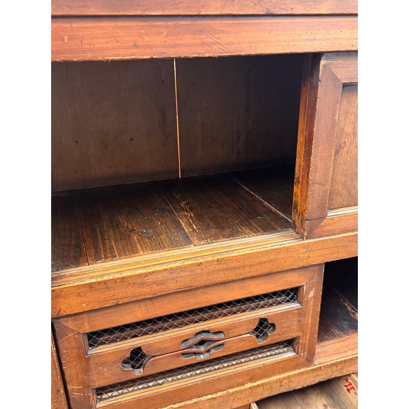 Design Plus Gallery presents a Mizuya Tansu Wood Storage Cabinet from Japanese Origin. The storage cabinet is made from a combination of wood. It has sliding doors with multiple drawers and all of its original hardware. The front is detailed with sliding panel doors, ventilated lattice panels with mesh backing, and multiple drawers fitted with iron bail pulls. The wood shows natural grain variation and patina, with hand-cut detailing along the lattice fronts and framed panel construction throughout. It is in good condition with visible and minimal wear from usage.