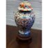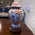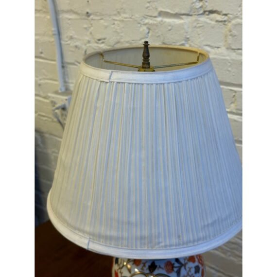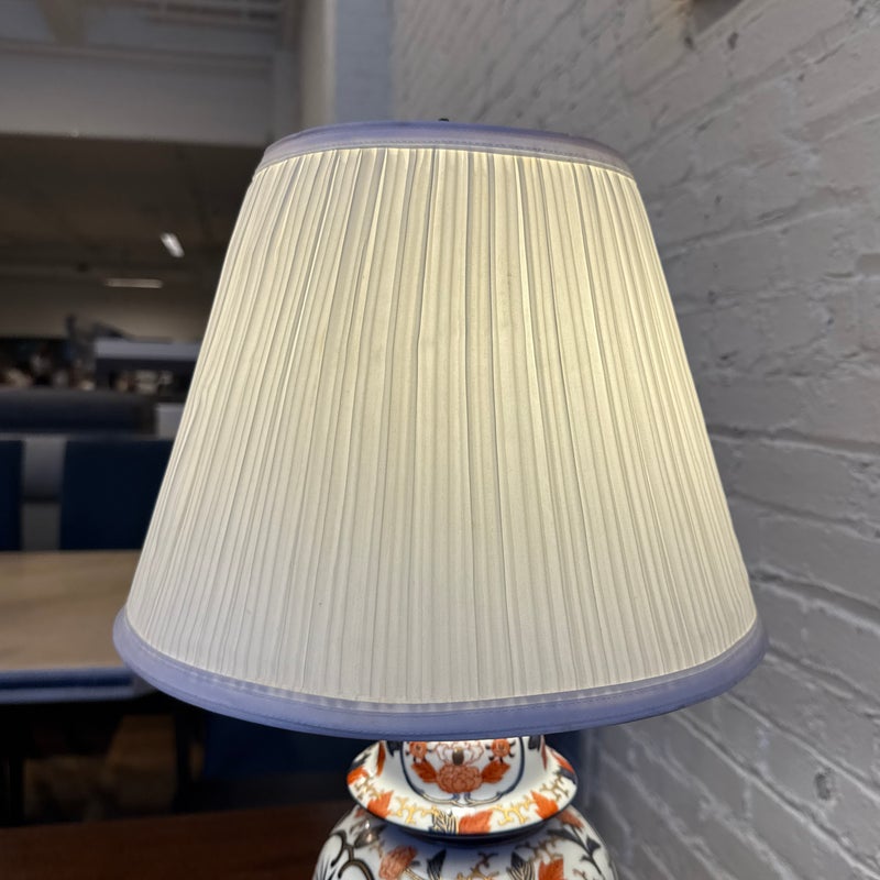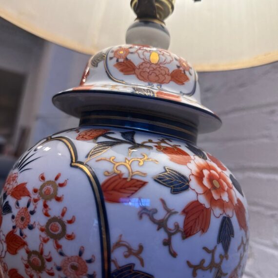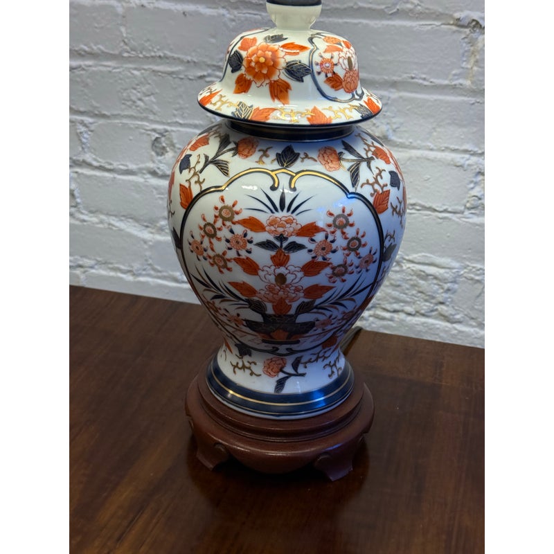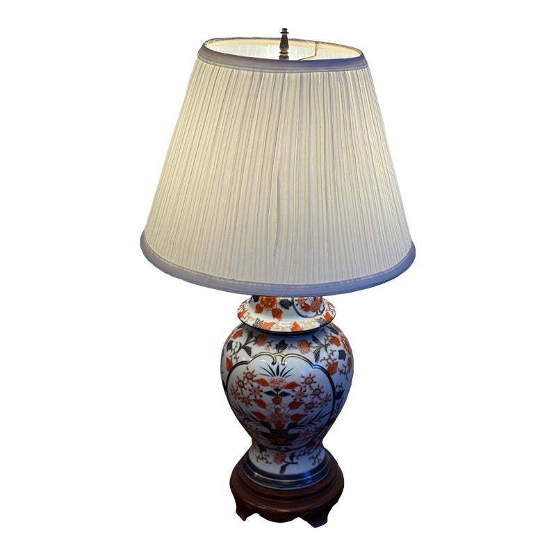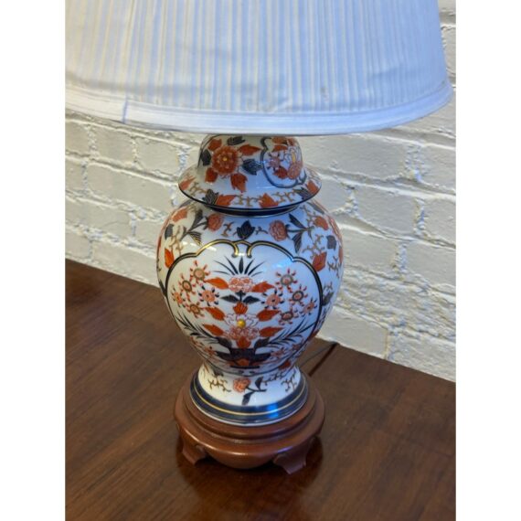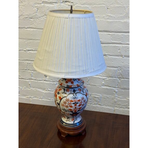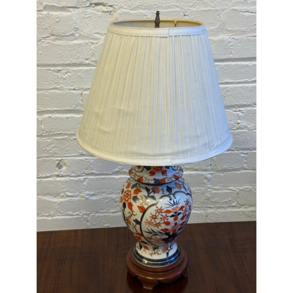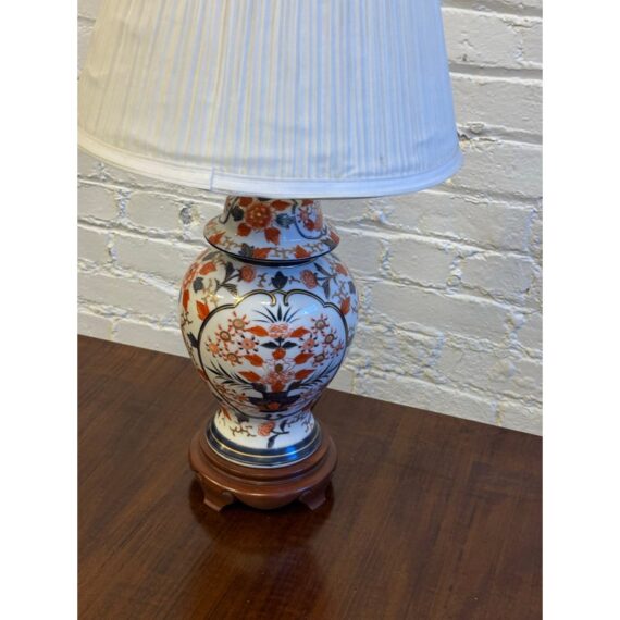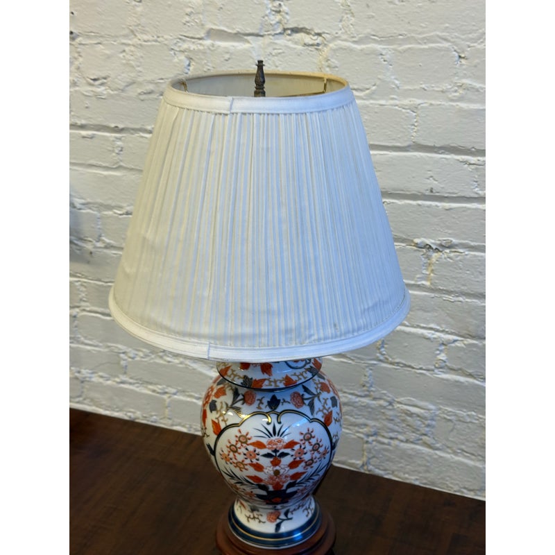 Design Plus Gallery presents an Imari Table Lamp. This lamp is traditionally produced in Arita, Saga Prefecture, and named after the Port of Imari, from which they are typically exported. The Imari porcelain is known for its distinctive patterns and vibrant colors this one showing mostly oranges and dark blues outlined in gold against its crisp white background. It stands on a base of wood to prevent chipping and add stability to its design. Comes with a white pleated shade and pointed finial. Is in good condition for its usage.