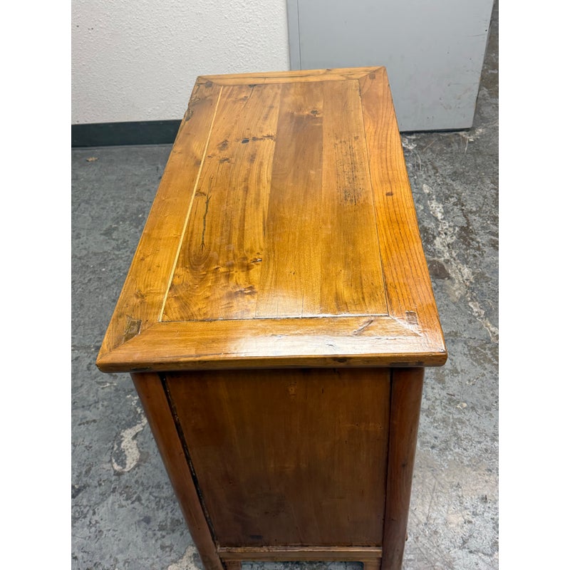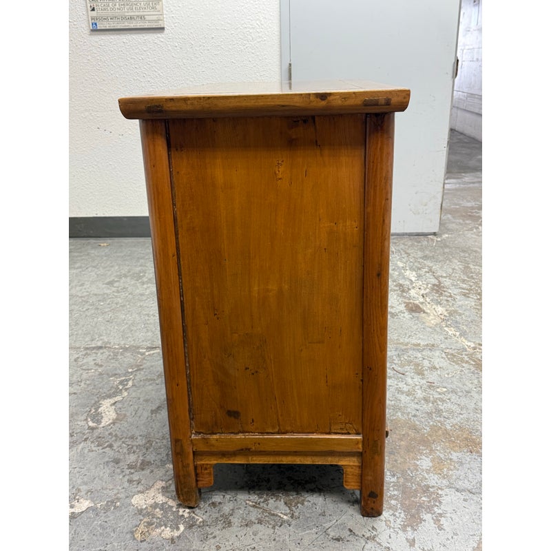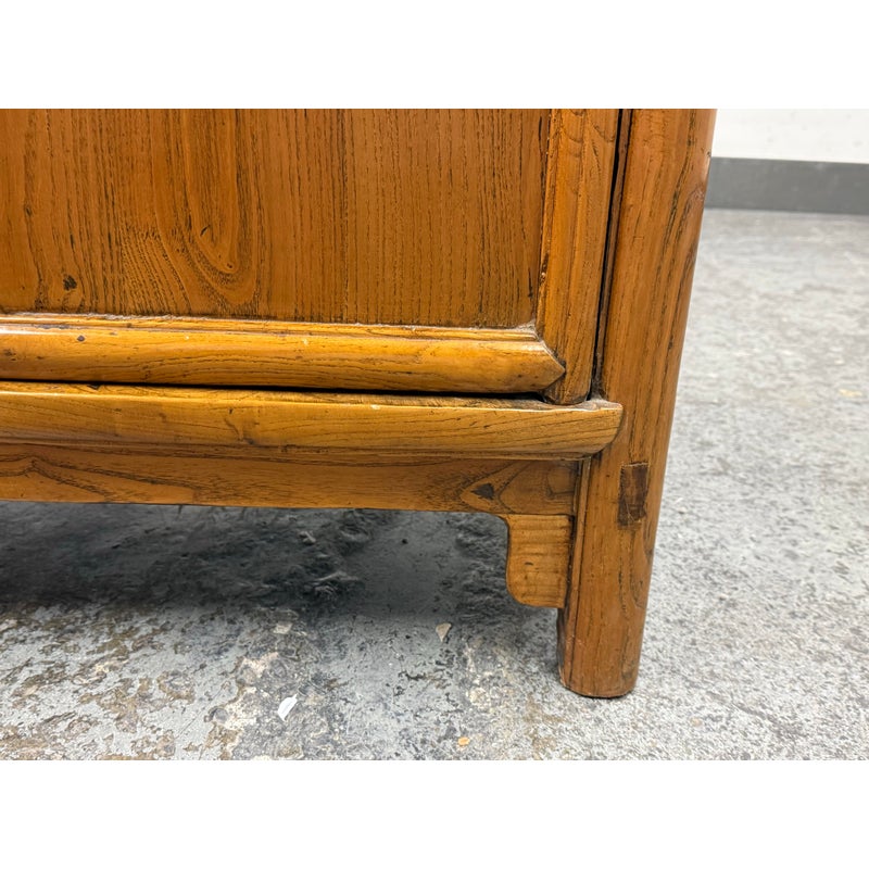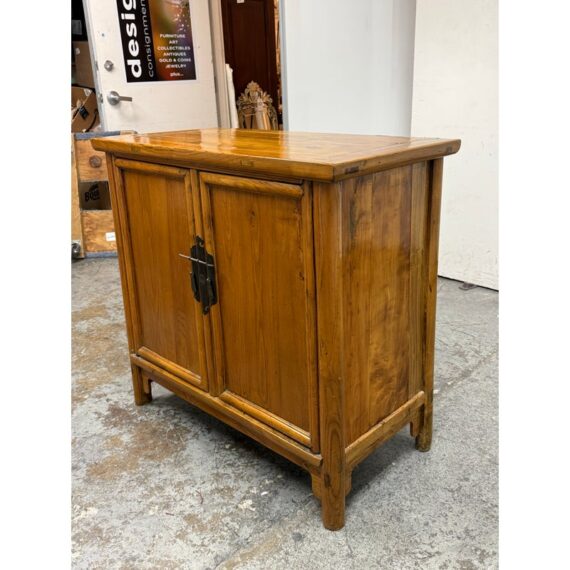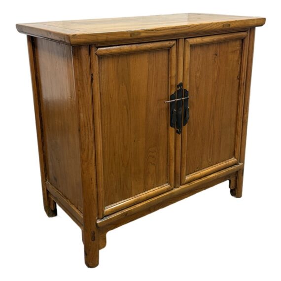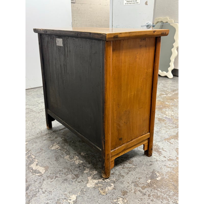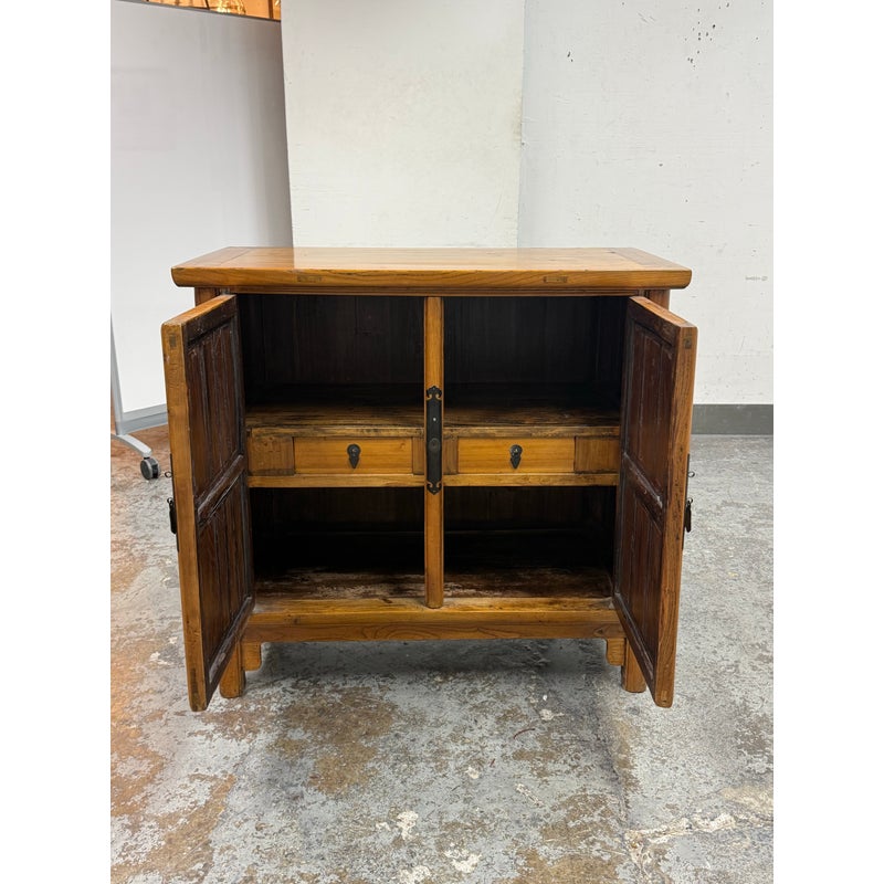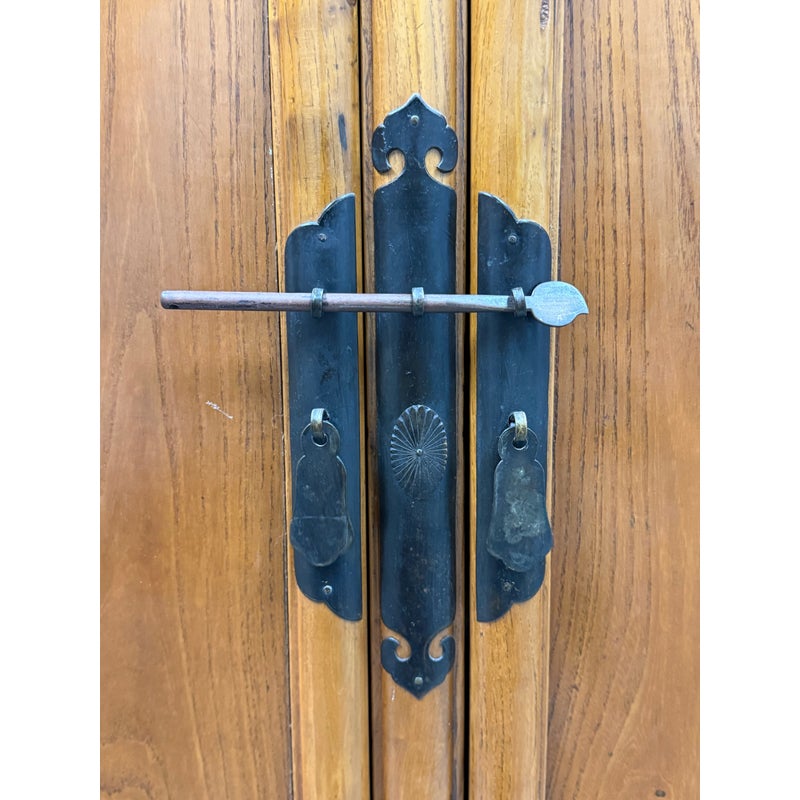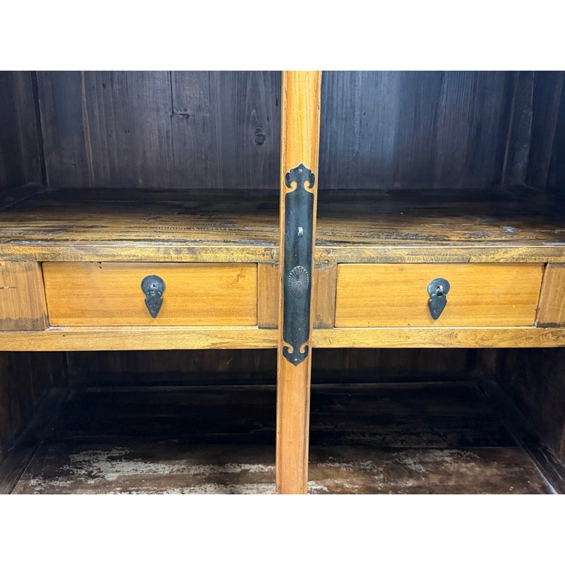Design Plus Gallery presents a Two Door Tansu Cabinet with Interior Drawers of Japanese Styling. The tansu has iron hardware to hold the door closed and with a locking pin. When the storage cabinet is open the piece has two center drawers with iron pulls and empty storage cavity space above and below. The cabinet is in good condition overall with wear that is consistent with its usage.
