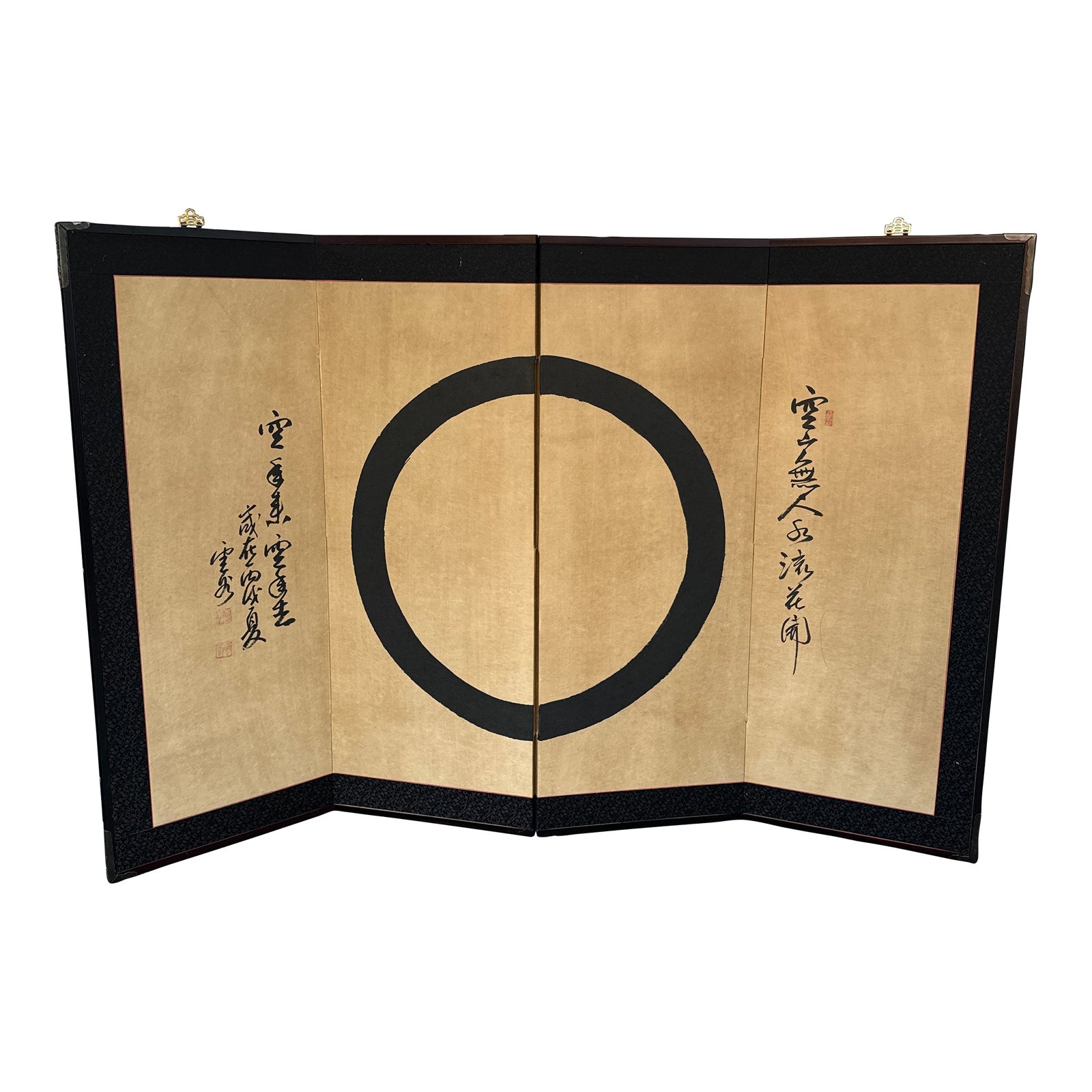 Design Plus Gallery presents a Folding Wall Screen that Doubles as a Fine Art Piece. The divider has four panels that fold into one another with brass hardware that is also found on all four edges. The screen has a beautiful clear semicircles in the two middle panels, completing a circles. Japanese script is found on the outer panels. Is in good condition for its vintage age.