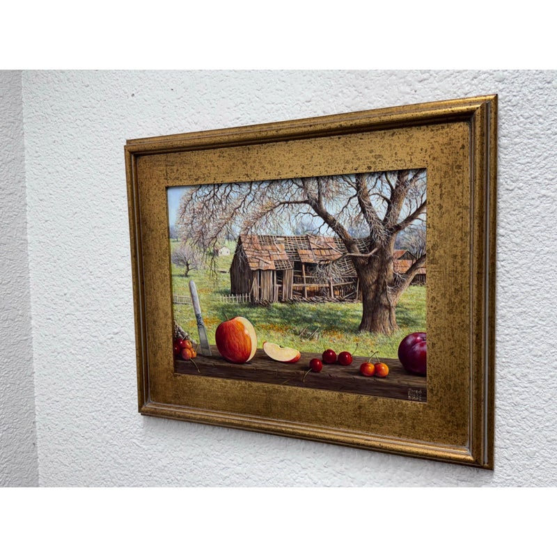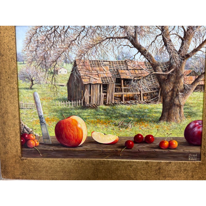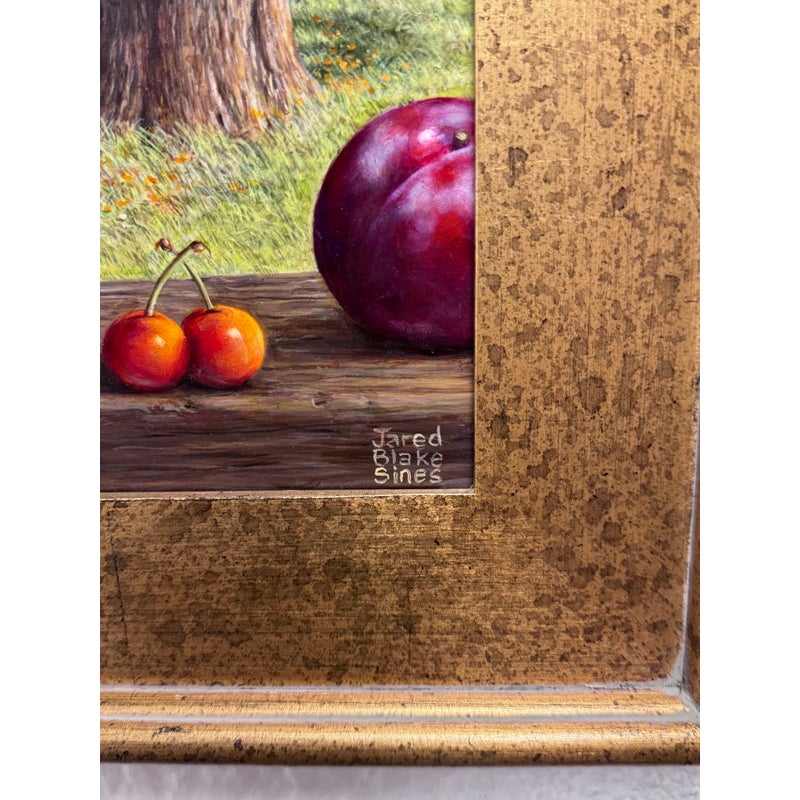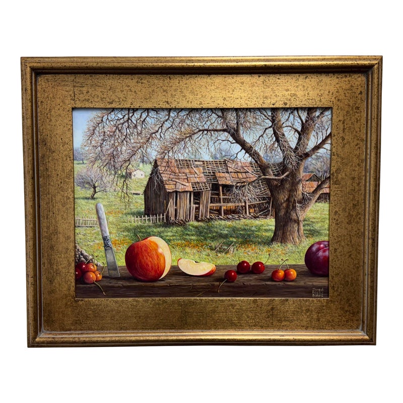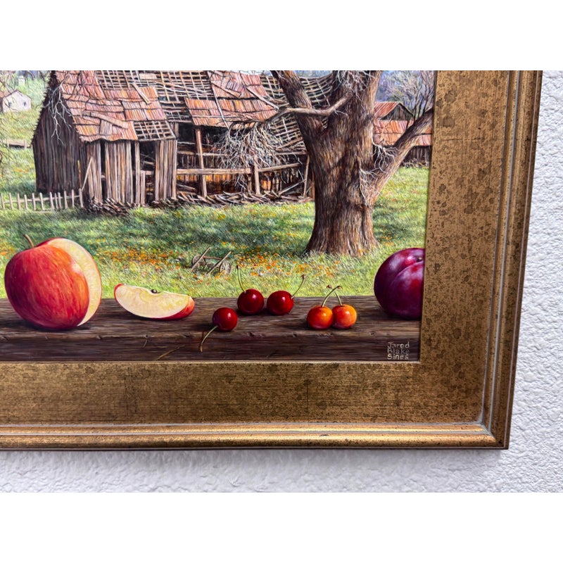 Design Plus Gallery presents a Still Life by Artist Jaren Blake Sines, Purchased from the Garden Gallery in Half Moon Bay, California. The composure of the still life is finely executed oil painting on canvas. The painting gives a crisp glimpse into the luxury of quiet country life. In the foreground a line up of cherries, an apple + a plum have been laid out with a knife having just cut a slice of apple before retiring into the wooden beam. The background has a dilapidated barn set within withering trees with a clear blue sky overhead and a blanket of green grass. The artwork is signed in the lower right corner + set in a wide antiqued bronze frame. Overall the painting is in good condition with minimal wear for its usage.