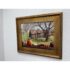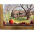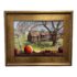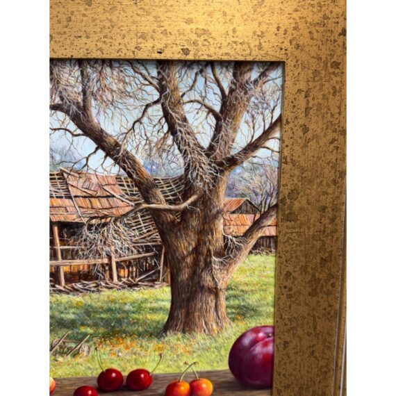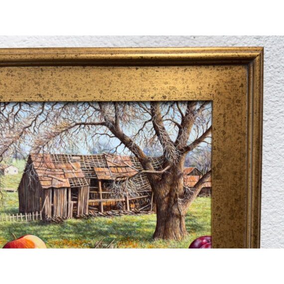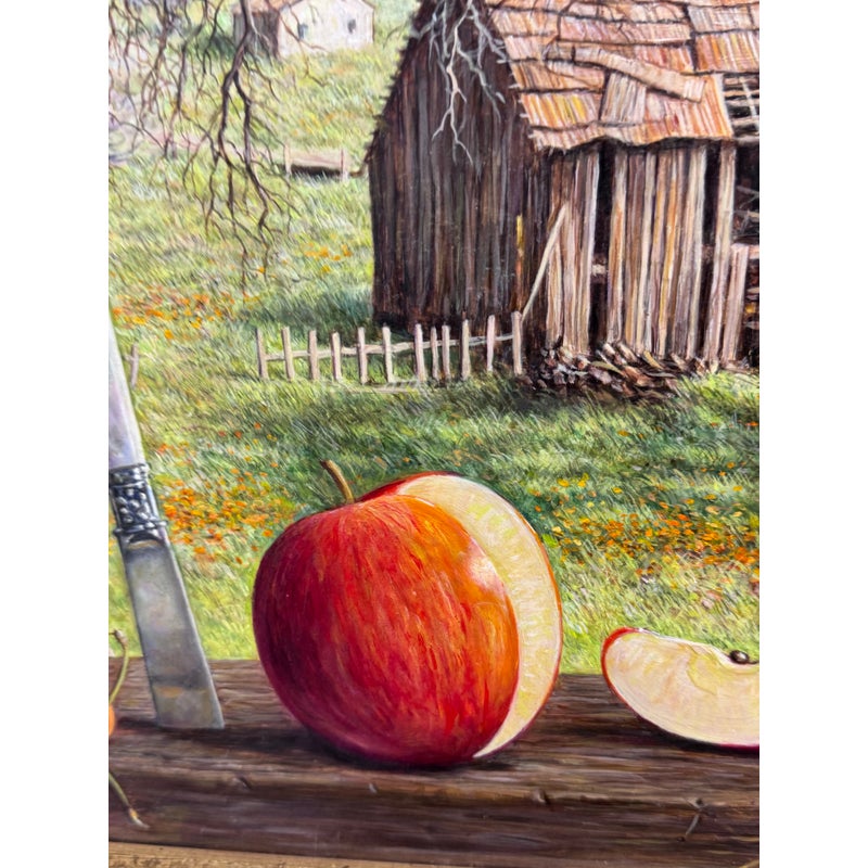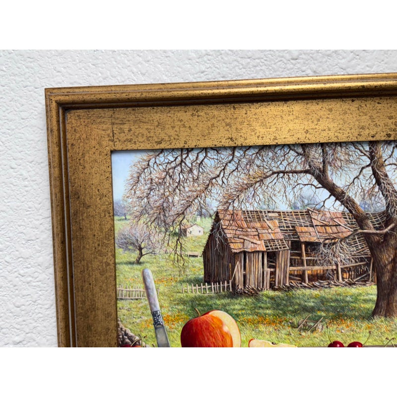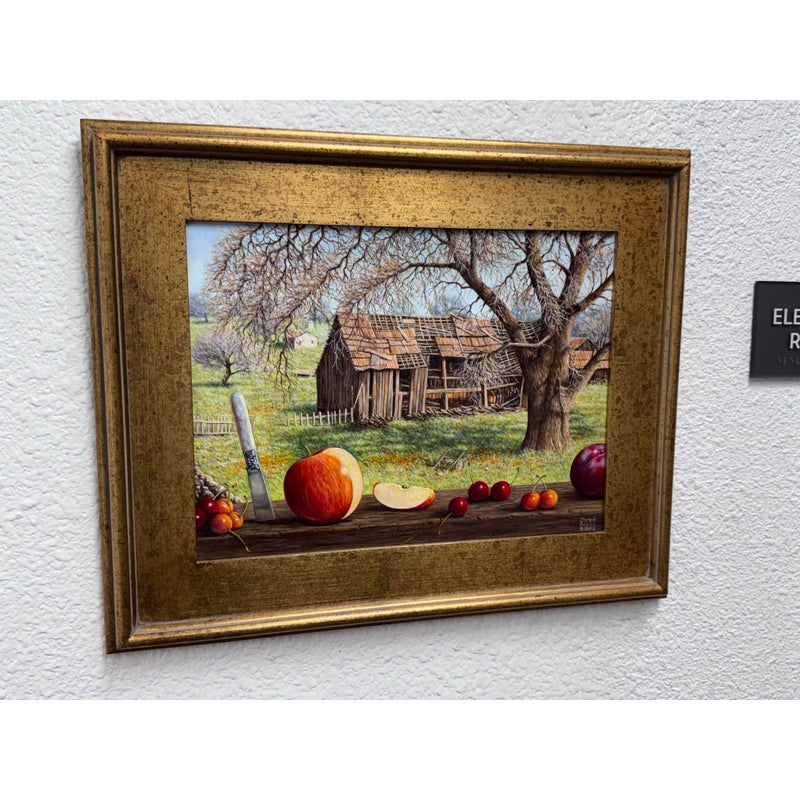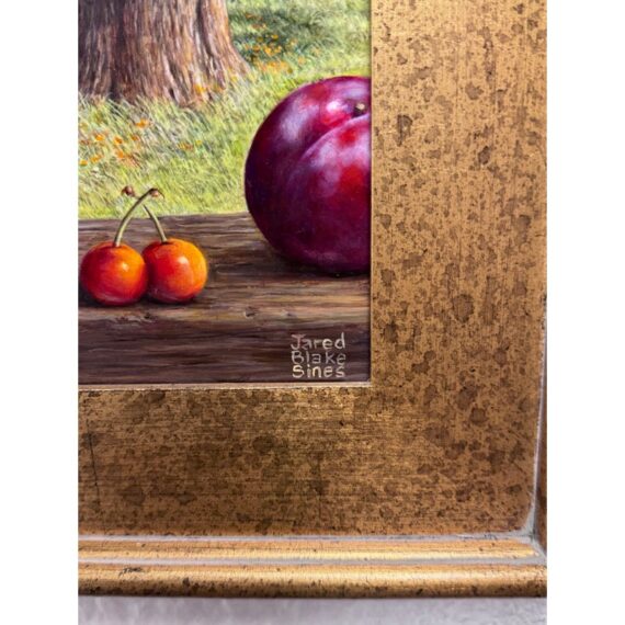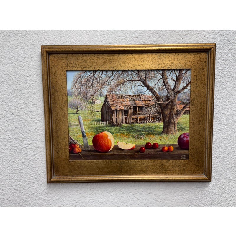 Design Plus Gallery presents a Still Life by Artist Jaren Blake Sines, Purchased from the Garden Gallery in Half Moon Bay, California. The composure of the still life is finely executed oil painting on canvas. The painting gives a crisp glimpse into the luxury of quiet country life. In the foreground a line up of cherries, an apple + a plum have been laid out with a knife having just cut a slice of apple before retiring into the wooden beam. The background has a dilapidated barn set within withering trees with a clear blue sky overhead and a blanket of green grass. The artwork is signed in the lower right corner + set in a wide antiqued bronze frame. Overall the painting is in good condition with minimal wear for its usage.