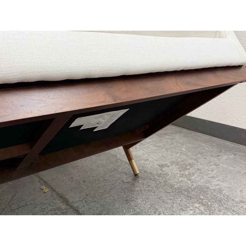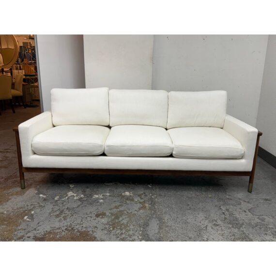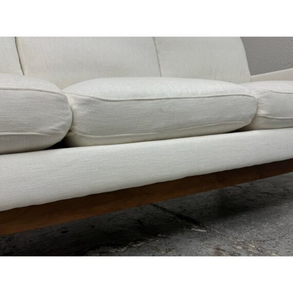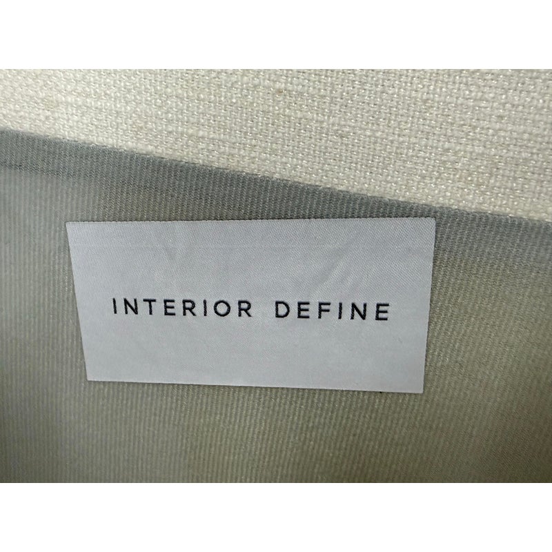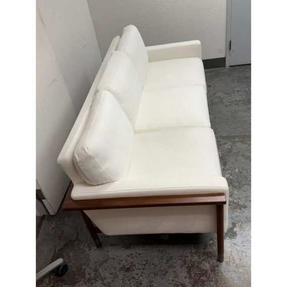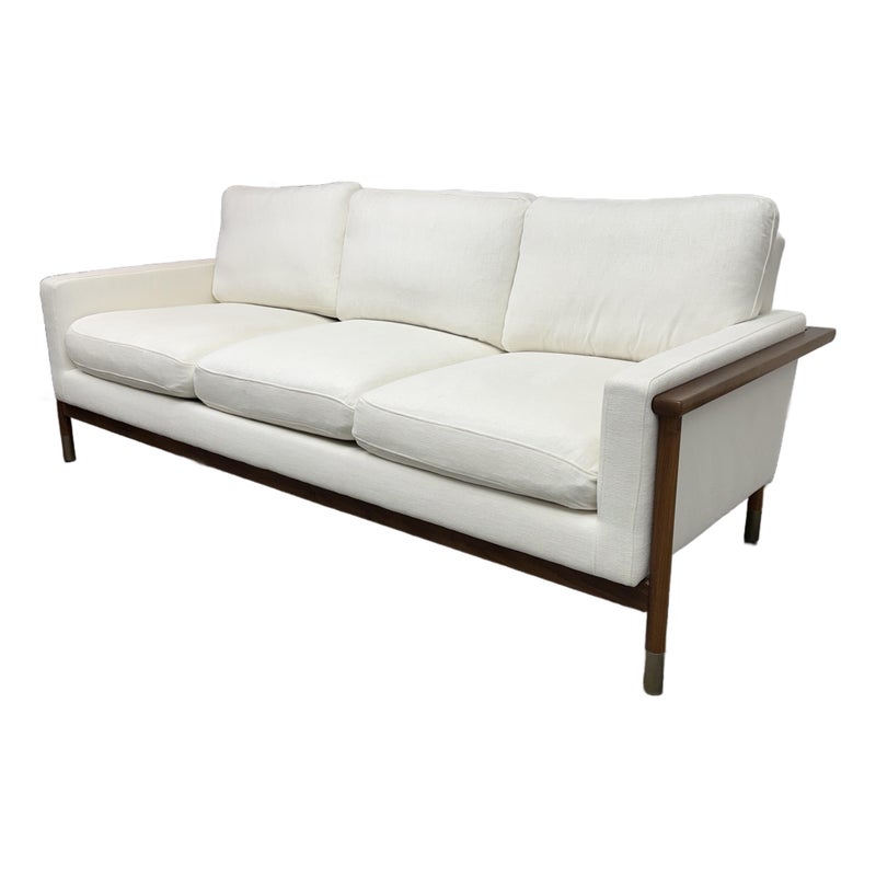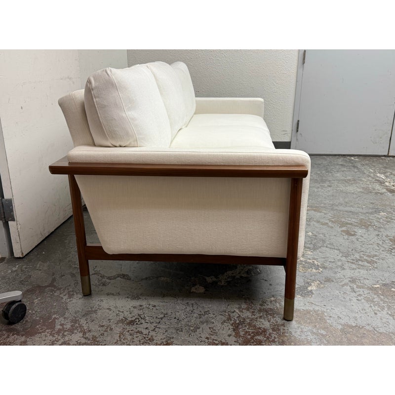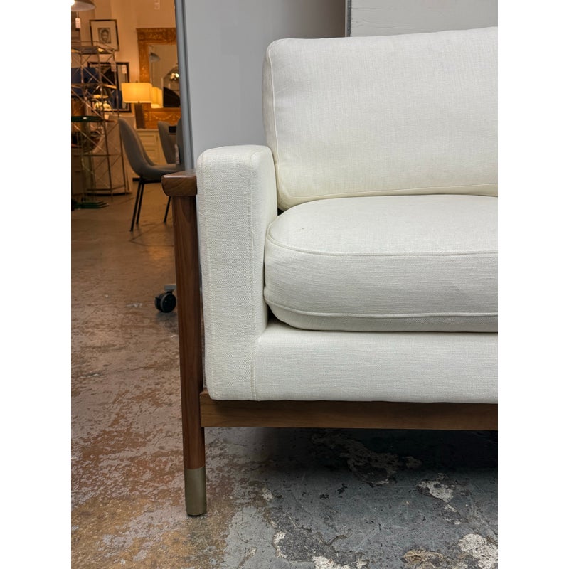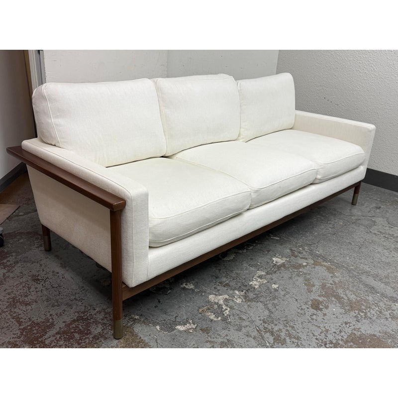 Design Plus Gallery presents the Jason Wu Sofa from Interior Define. Fashion designer Jason Wu partnered with Interior Define for his collection of exposed wood-frame sofas inspired by the mid-century modern era. This three seat sofa has top and bottom cushions in their Performance Basket Weave fabric in Pearl (machine washable) that are removable and plushy firm for your comfort. The exposed wood is in a medium brown stain of walnut. Inspired by the ever-popular midcentury modern design style, the pieces are timeless and sleek—exactly what you would expect from the talented designer. It is in good condition for its usage.