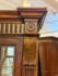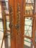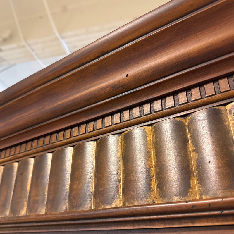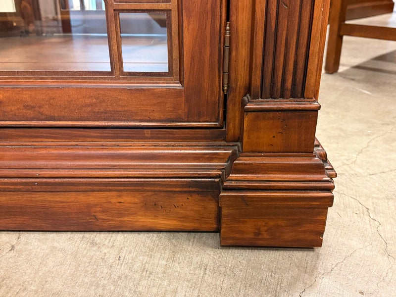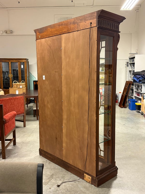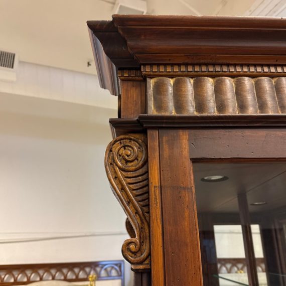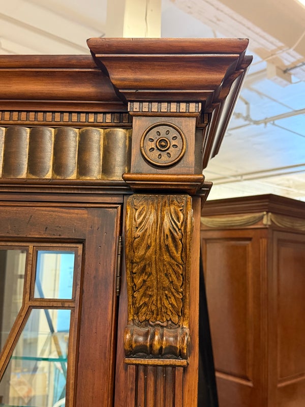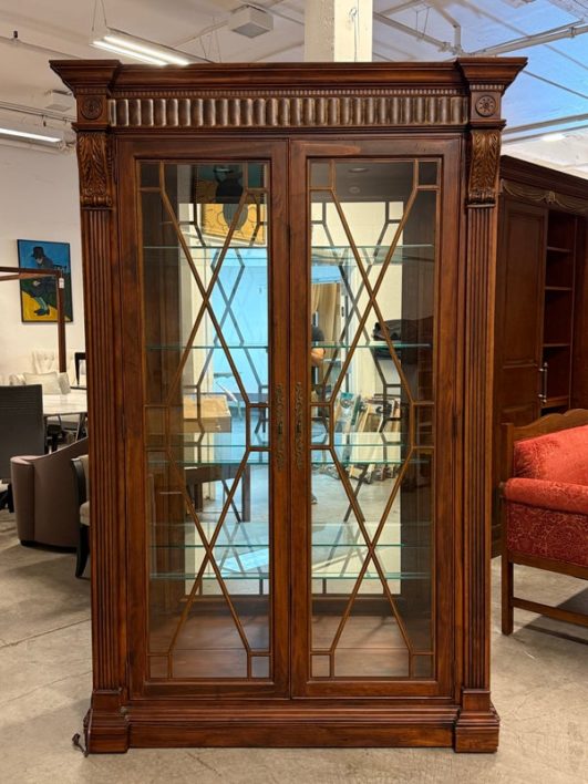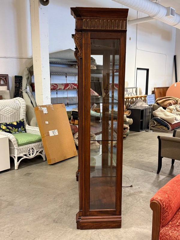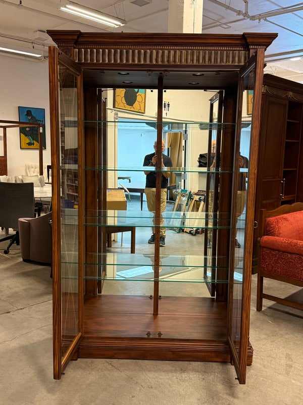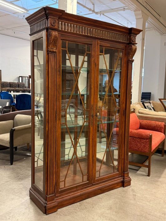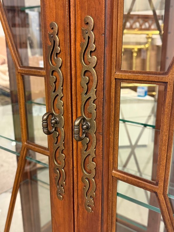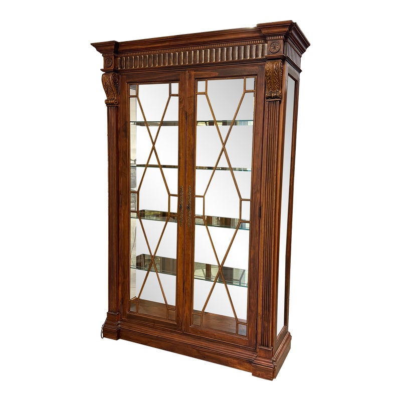 Design Plus Gallery presents an Arlington Pine Glass Curio Cabinet by Jasper Cabinet. Plenty of good looking details in this showman’s cabinet to fill with your collectibles and objects of achievements. The cabinet doors have a latticed fretwork that bends with superb craftsmanship. Acanthus leaves are showcased in multiple placements, within and around the upper and lower mantles and antiqued brass hardware. The cabinet inside has four glass shelves and a mirrored back, plus lights atop to really allow the items placed inside to strikingly stand out. The cabinet does show signs of wear but overall is in good condition for its usage. Made in Jasper, Indiana, USA.