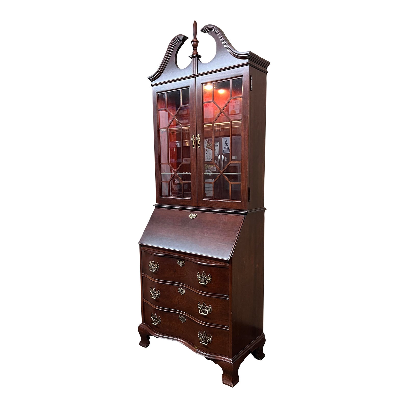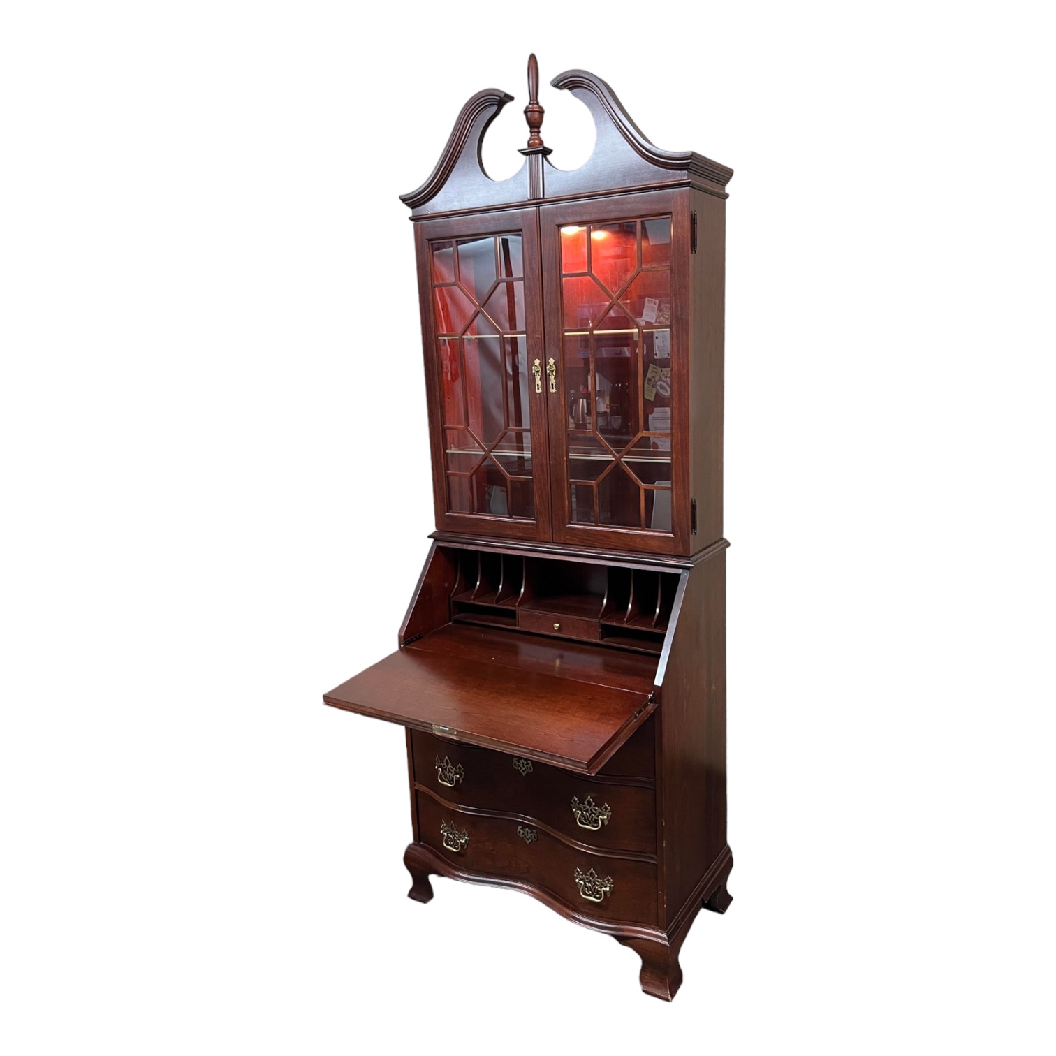 Design Plus Gallery presents a Chippendale Secretary by Jasper Cabinet Company. The red mahogany beauty is multifunctional with fretwork glass doors to showcase lighted treasures on adjustable glass shelves, a drop front writing surface with accoutrement storage, as well as three serpentine front, dove-tailed drawers. So much in such a compact unit. Model 2830. Light surface wear consistent with age and use.