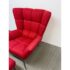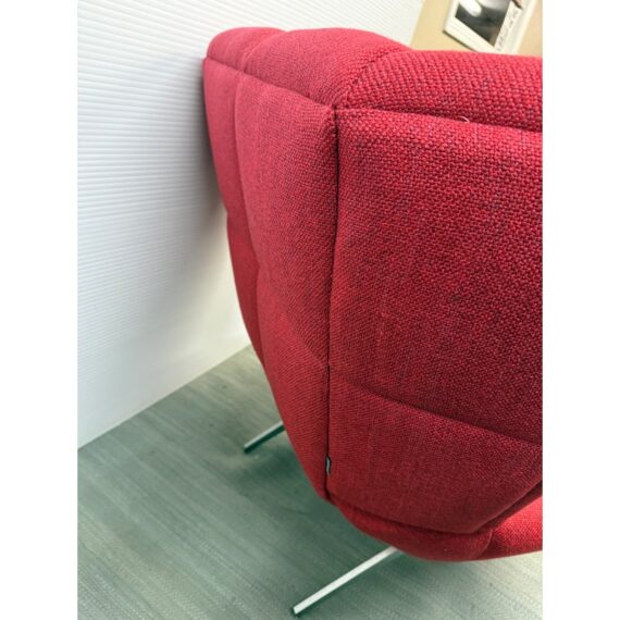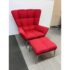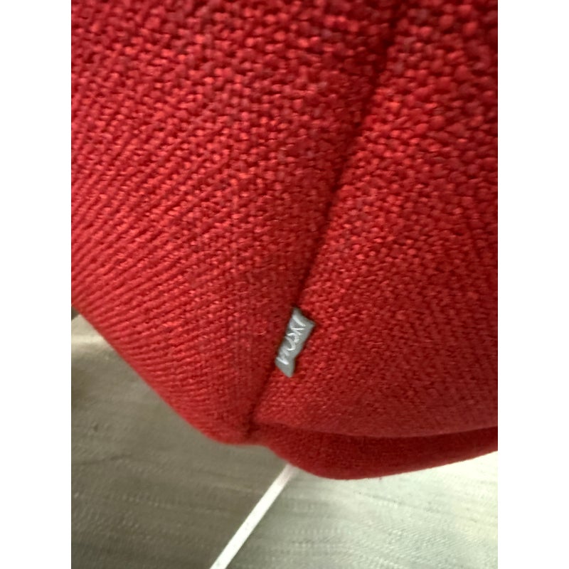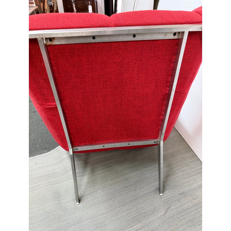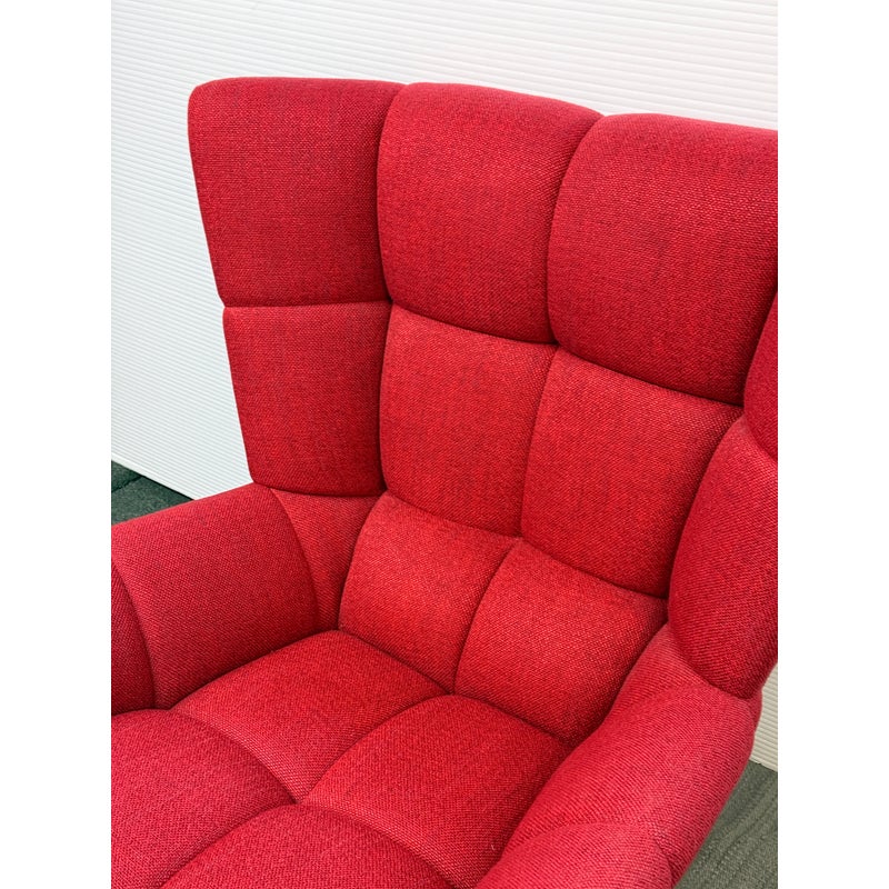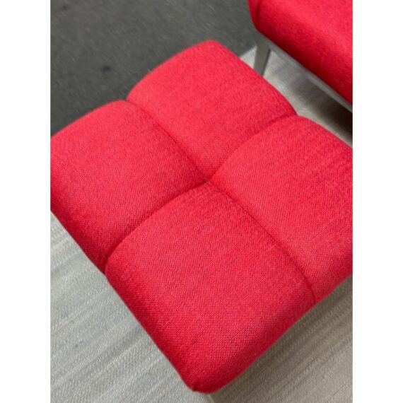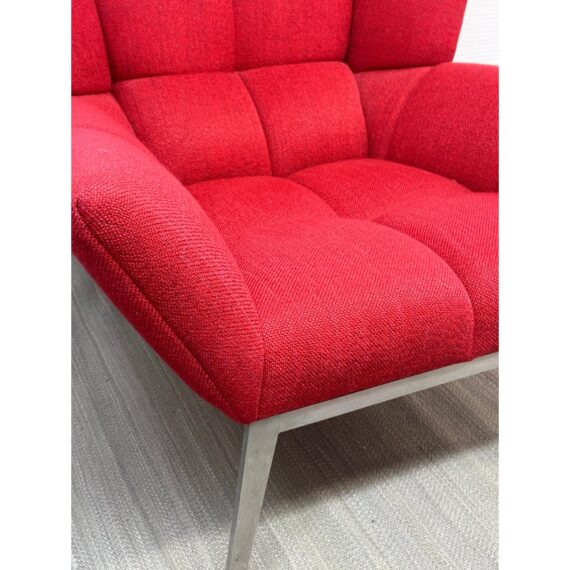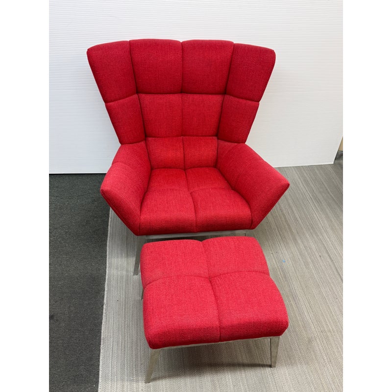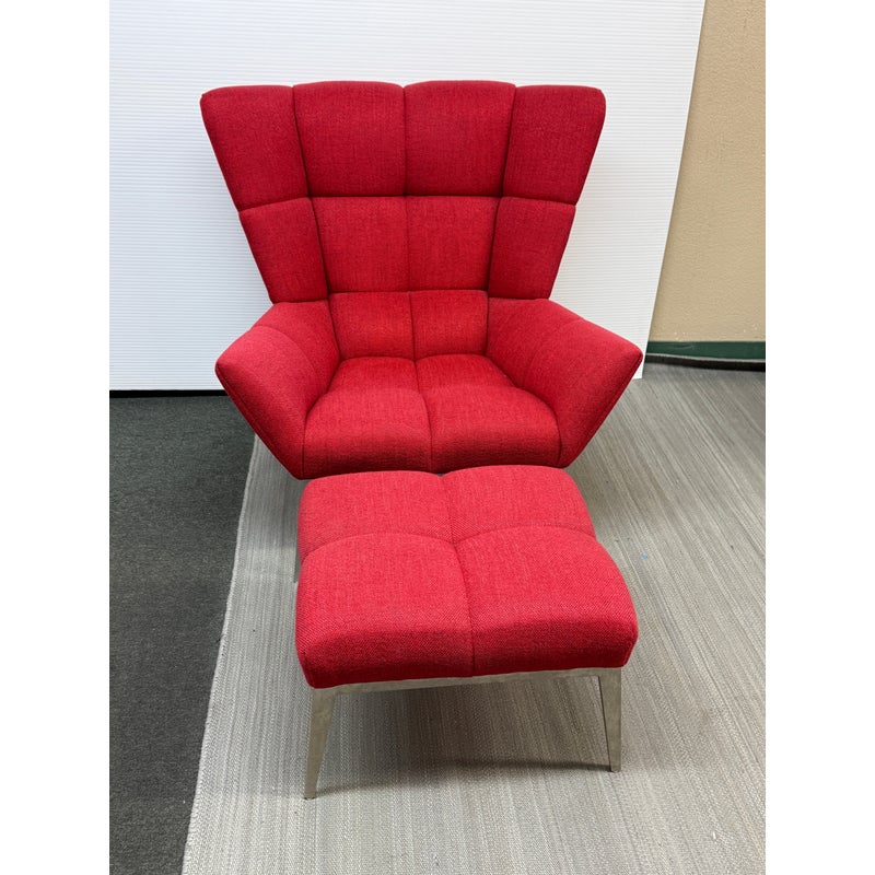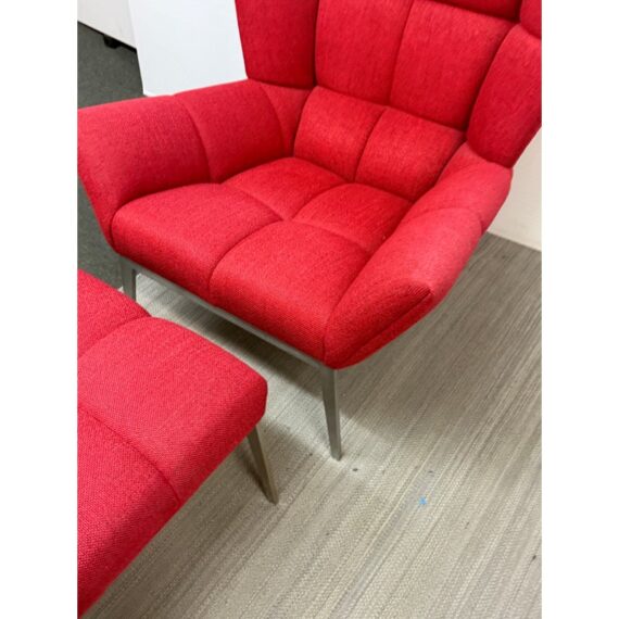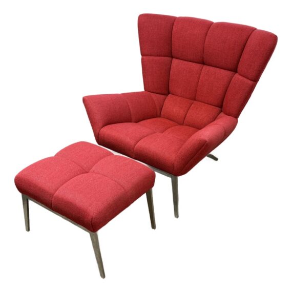Design Plus Gallery presents the Tuulla Chair + Ottoman from Vioski Furniture. Both pieces are upholstered in a vibrant red fabric that boasts proportioned tufts creating a sculpted form that is both visually appealing Beyond its looks, there is a built-in lumbar support with varying densities of high-quality foam that contribute to its exceptional comfort. It is made from solid alder wood framing then reinforced with metal brackets for added strength. The chair gives great comfort with its sinuous springs on both the seat and backs that provide stability and preventing sagging. The steel tapered legs are given a satin chrome finish. They are both in good condition with light wear from usage.