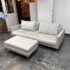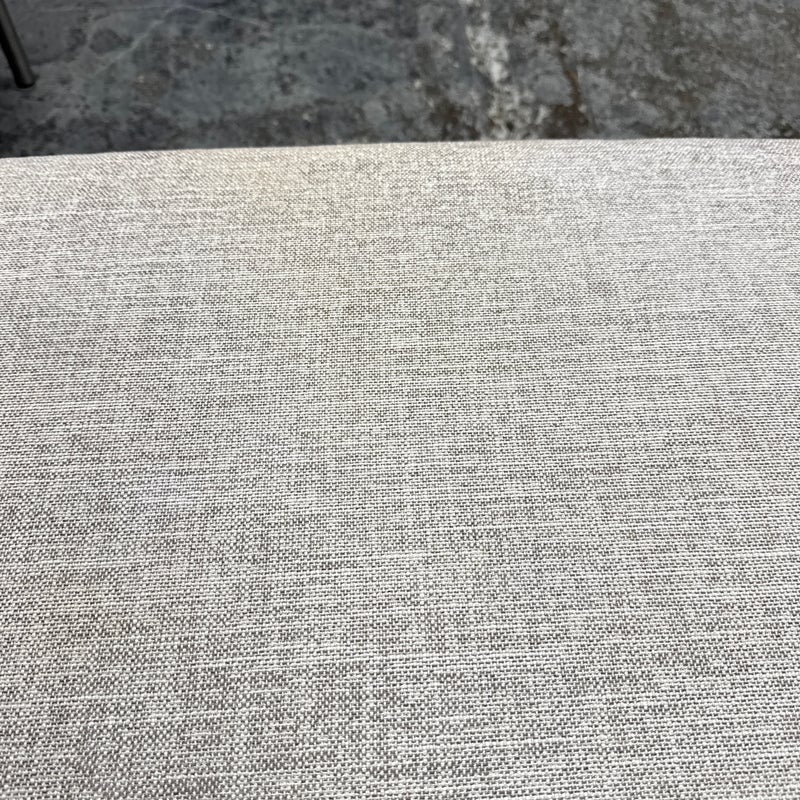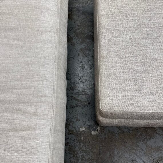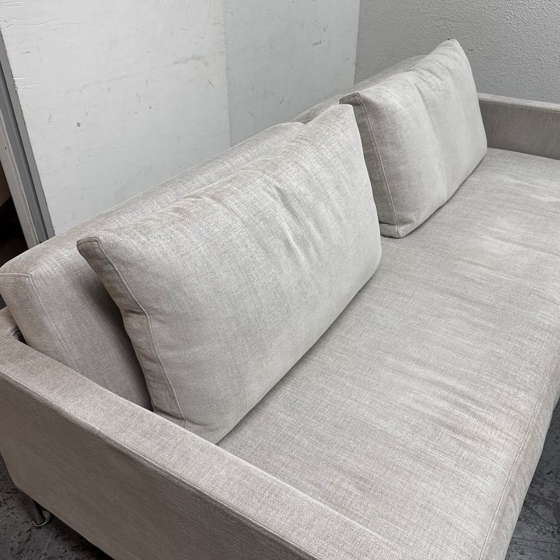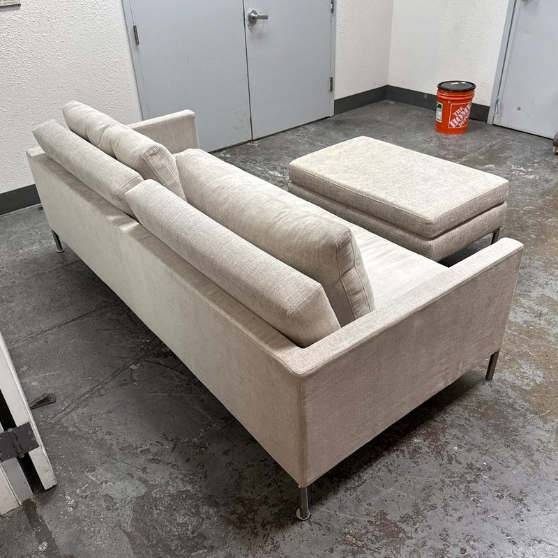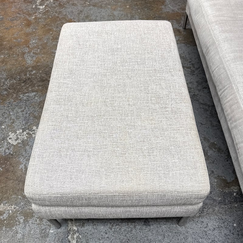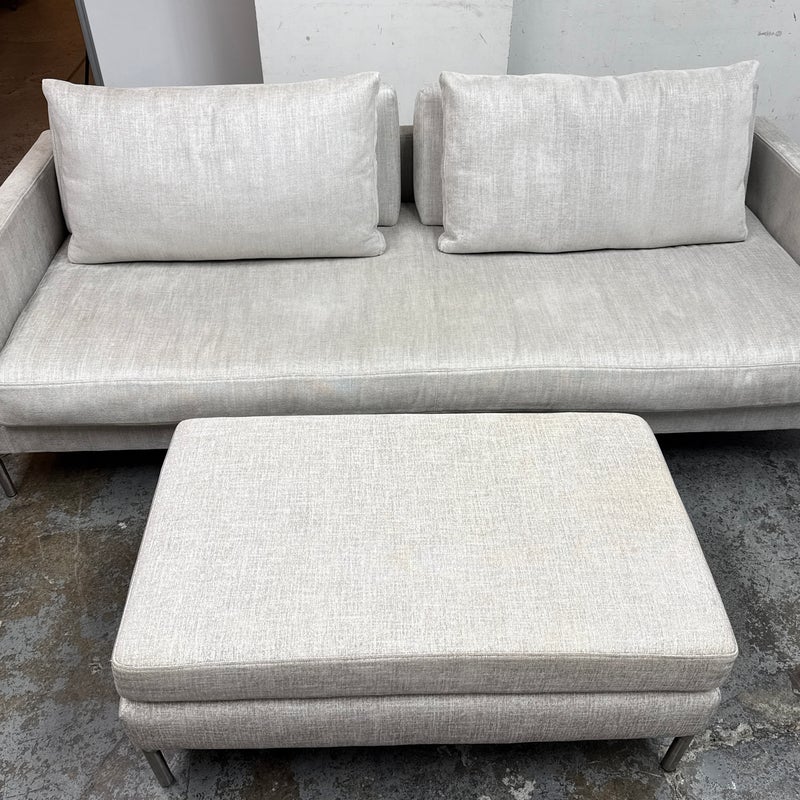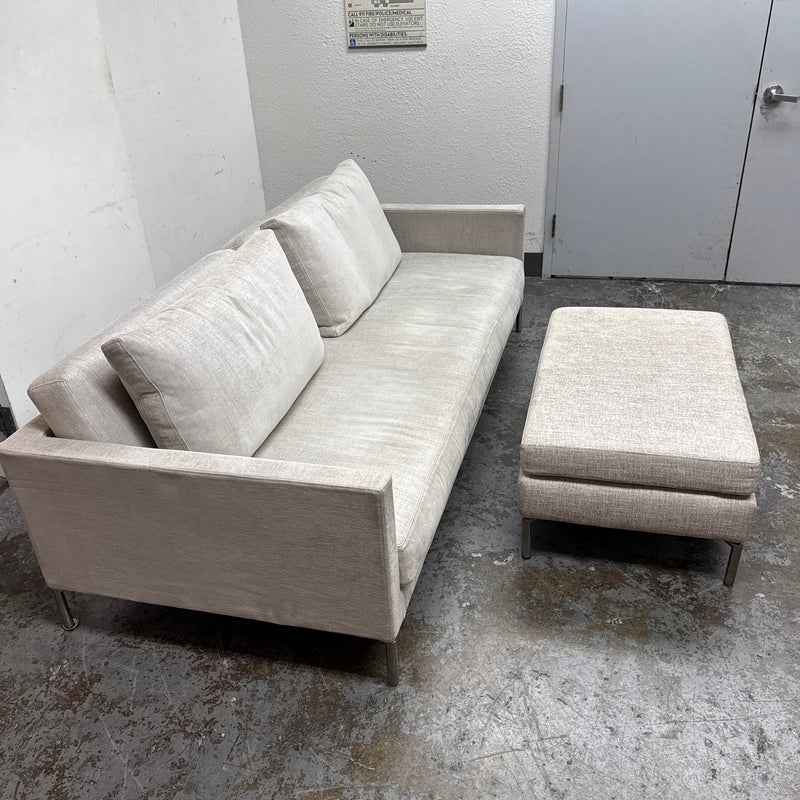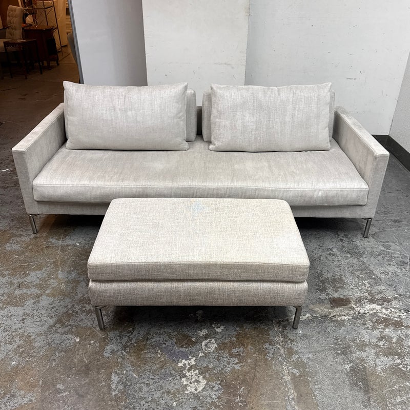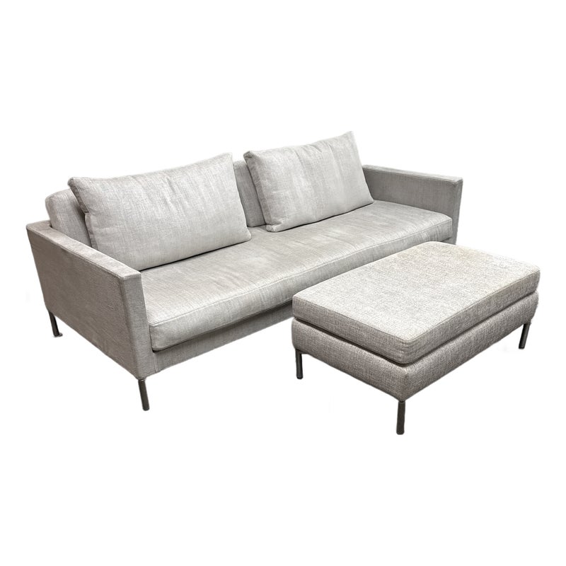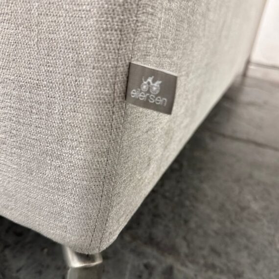 Design Plus Gallery presents a Plano Sofa + Ottoman from Eilersen. Designed by Jens Juul Eilersen. For decades, Eilersen has been known for their lounger sofas, which in line with modern trends have been getting increasingly weightier. Instead, Plano rises up with a lightness that almost makes it seem to float and the result is a Scandinavian version of the modern sofa lounger. Features a timeless and minimalist design characterized by clean, straight lines. It is upholstered in alight gray fabric, complementing a variety of interiors and decor styles. The sofa offers a single, generously proportioned bench seat that provides a seamless and comfortable seating area. Two loose back cushions add a touch of relaxed elegance and can be easily adjusted for optimal comfort. Supporting the sofa are sleek metal legs in a matte silver finish, enhancing the modern aesthetic. Accomapnied the sofa is a rectangular frame ottoman. In good condition, with visible wear from usage that adds a hint of character without compromising its functionality or appeal. Would benefit with a professional cleaning. In good condition, visible and minimal wear from usage.