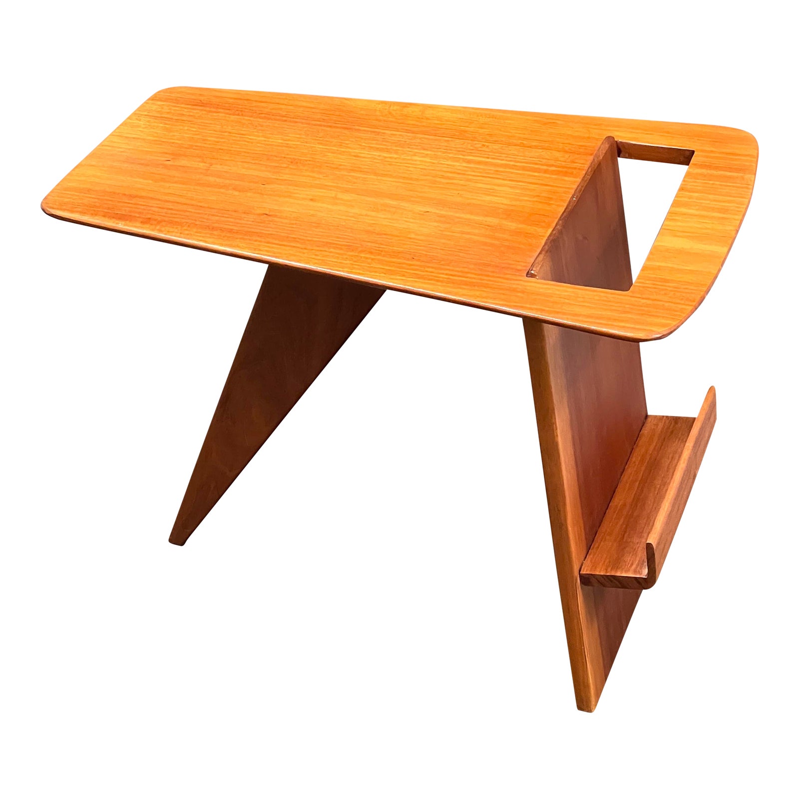 Design Plus Gallery presents a Modernist Magazine Table by Jens Risom. Original model T.539 crafted in Teak. Architectural silhouette is clean and modern. Wedge-shaped top features the teak woodgrain. Magazine (or album) displays on small storage shelf. Little evidence of wear; consistent with age and use. Designed by Jens Risom in 1949.
