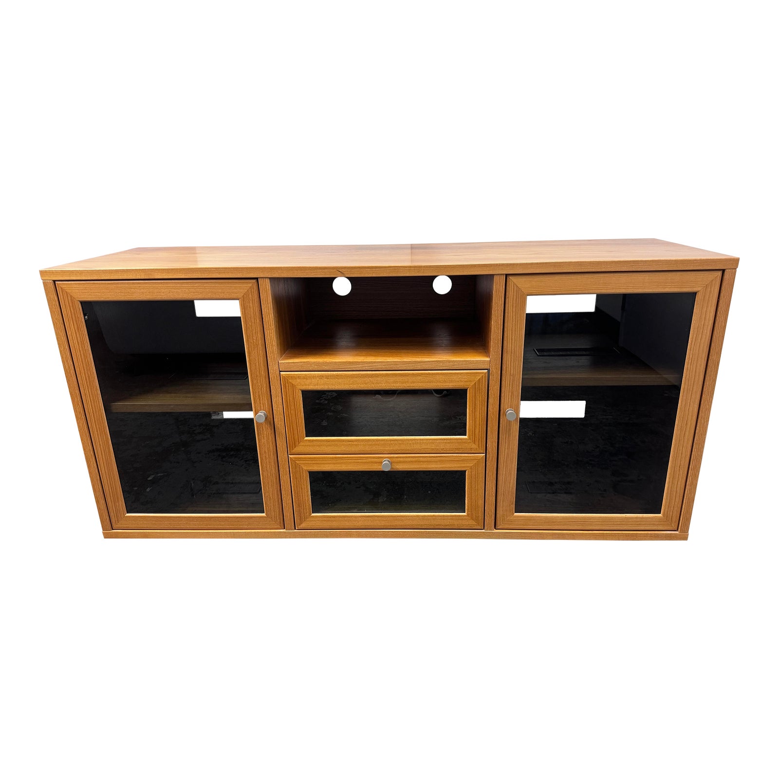 Design Plus Gallery presents a Media Stand by Jesper. All constructed in an elegant teak wood and glass doors. The center console in the middle of the unit is a spacious drawer that you can store all your media needs. Two glass panel doors to reveal inner shelving. Cutouts on backing for wire passage. In good condition, visible and minor wear from usage + age. There is discoloration on surface and frame from sun exposure.