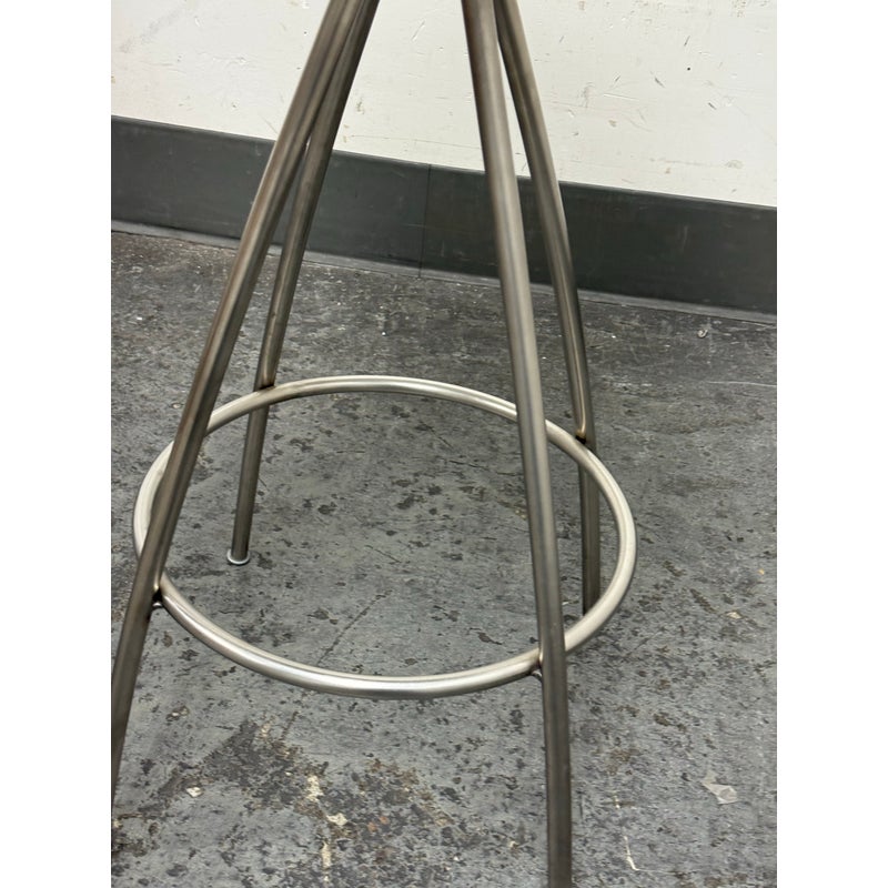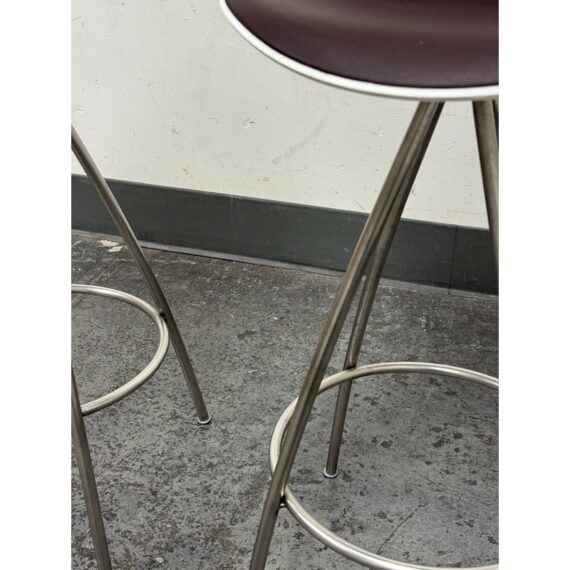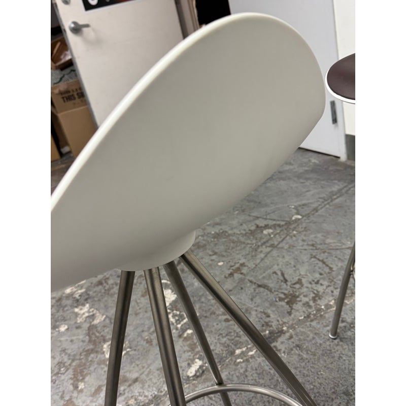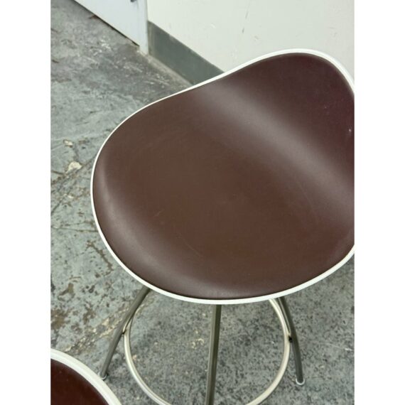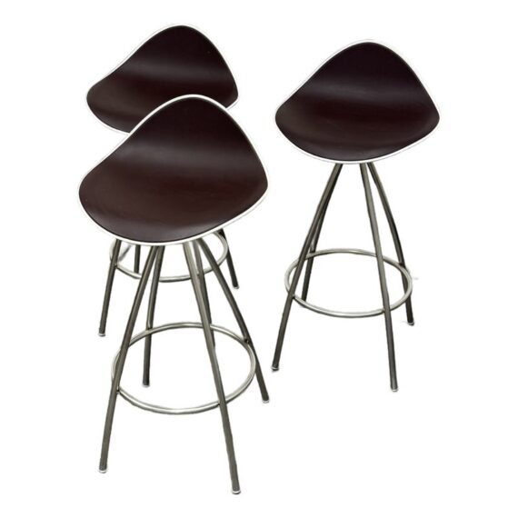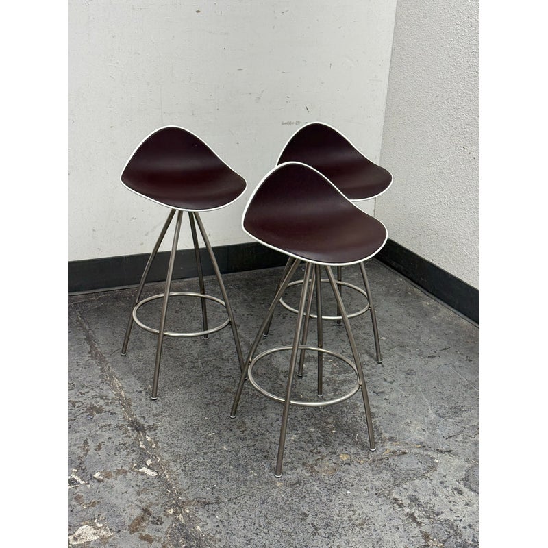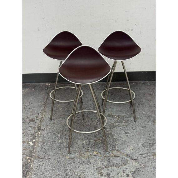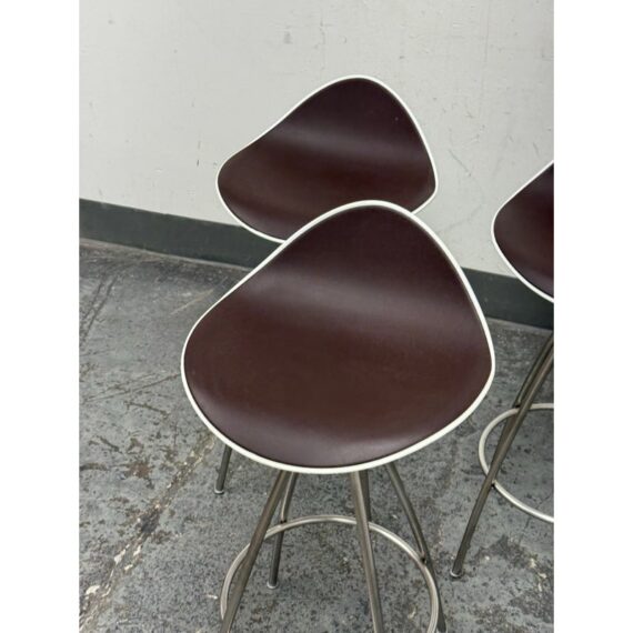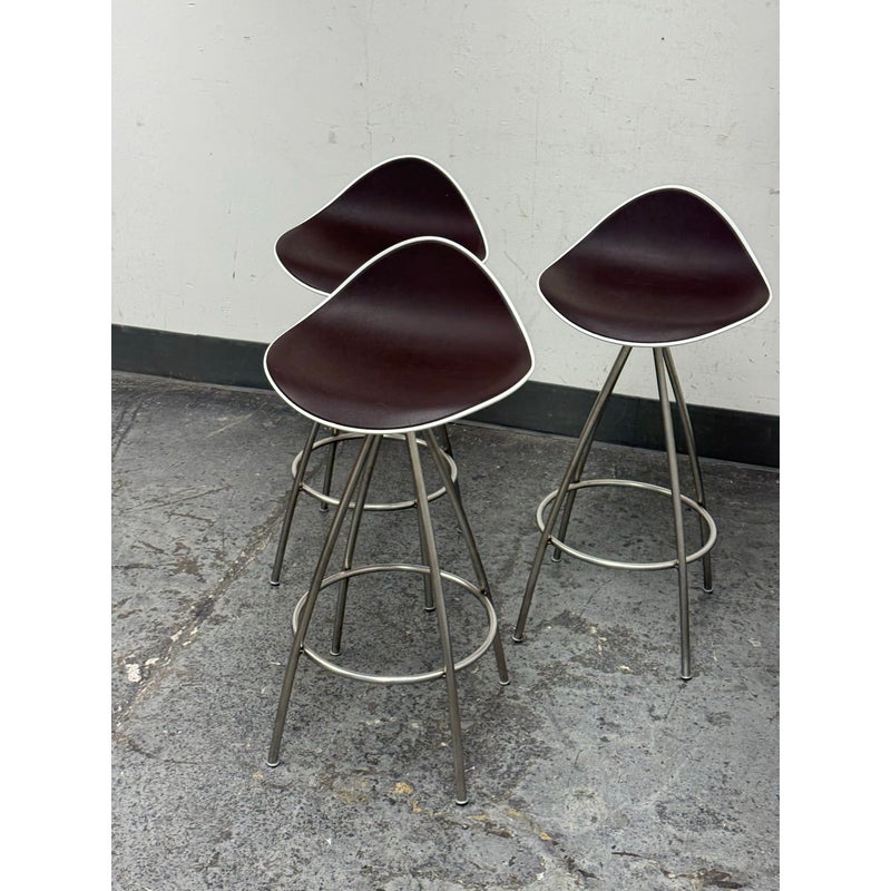 Design Plus Gallery presents a Set of Three Onda Counter Stools Designed by Jesus Gasca for Design Within Reach. With a wave-like seat that mimics the curves of the human form and hugs your lower back, these Onda Stools deliver surprising lumbar support for a low-back stool. The four-legged steel base is impressively stable while also being both visually and literally lightweight. A 360-degree crossbar provides leg support while you swivel. Made in Spain.