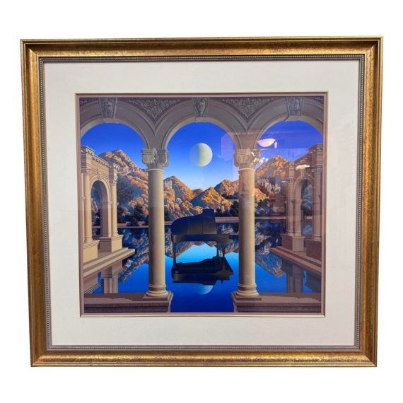 Design Plus Gallery presents “Dreamers Awaken” #59/300 Limited Edition Seriagraph by Jim Buckels. Jim Buckels is a delightful anomaly: An artist more driven by his inner visions than by fashions and trends. His work possesses an innate sophistication that places it prominently within the post-modern mainstream. In fact, Buckels is a Neo-Surrealist of a peculiarly American Breed: a creator of dream-like images, rendered in a meticulous, modern airbrush technique with the crystalline clarity of a Colonial limner. He began his career as a freelance illustrator, becoming known for his stylized landscapes as well as by the primitive dreamscapes of the great French painter, Henri Rousseau. This unique confluence of influences also informs the acrylic paintings, lithographs, and serigraphs for which Jim Buckels is now best known. Their visionary vistas and fantastic architectural details offers the viewer a restful respite from reality. For this reason as well as for his outstanding technical skills, Buckels has emerged as a contemporary master whose work will continue to enthrall us for many years to come. The print and framing are both in good condition with minimal wear.