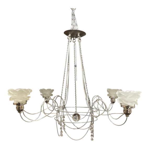 Design Plus Gallery presents a Jim Misner Custom “Light Opera” Four Arm Chandelier. Chain links, crystal and wire are welded into a traditional silhouette in modern materials and nickel finish. Frosted glass florets encapsulates each arm. Little evidence of wear. Chandelier is in good condition.