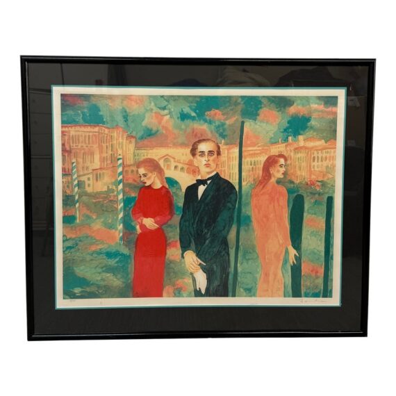 Design Plus Gallery presents a “Venice” a Limited Edition Serigraph by Joanna Zjawinska. Oh the intrigue, oh the drama that surrounds the trio, with a dreamy cityscape as backdrop. The limited edition print of 34 vibrant colors, is dated 1987, and signed by the artist. Professionally matted and framed. Condition is good. Certificate of Authenticity included.