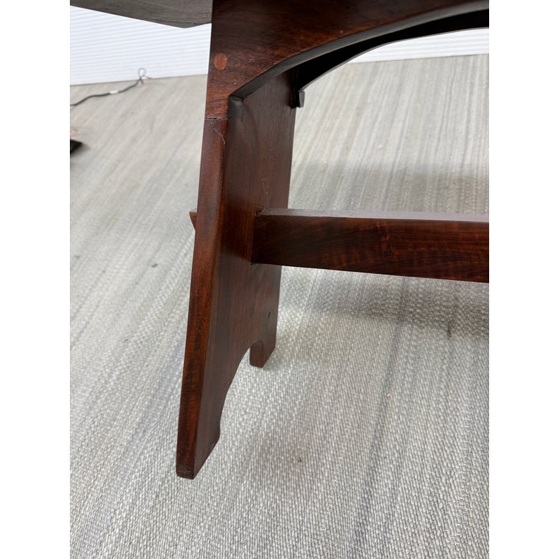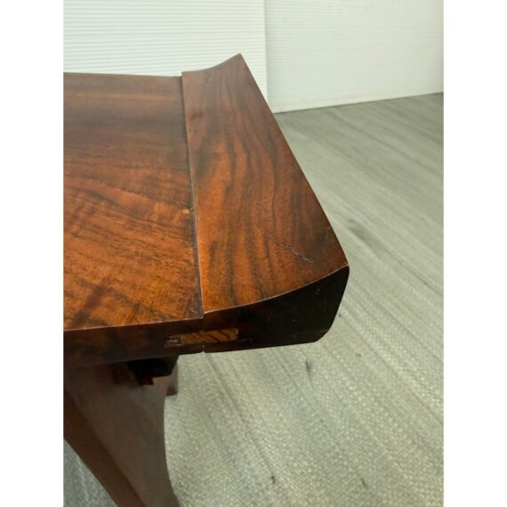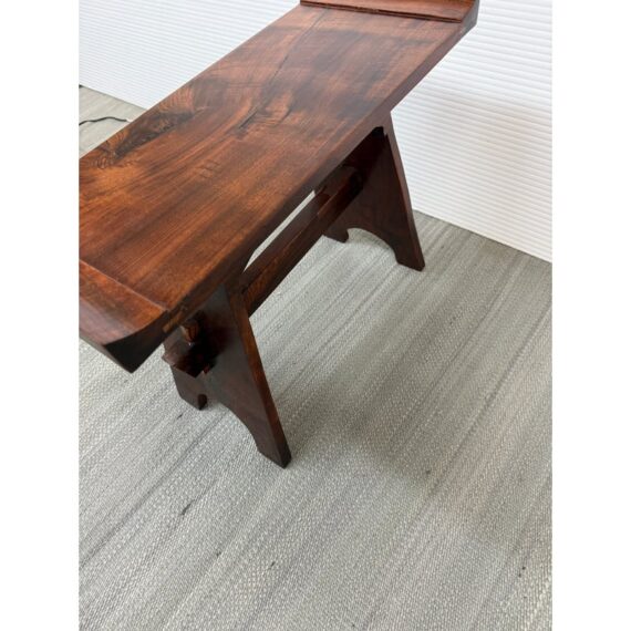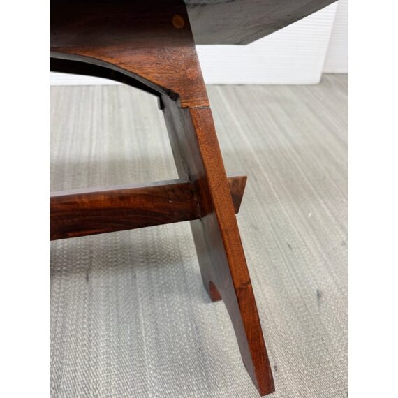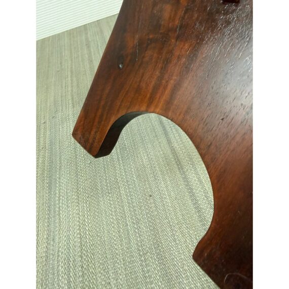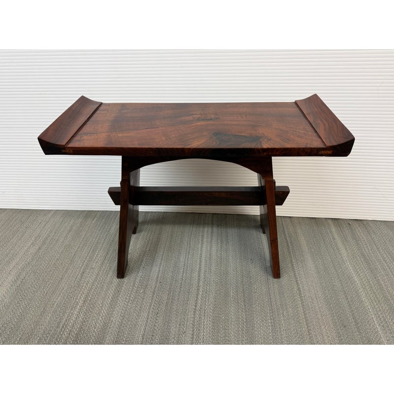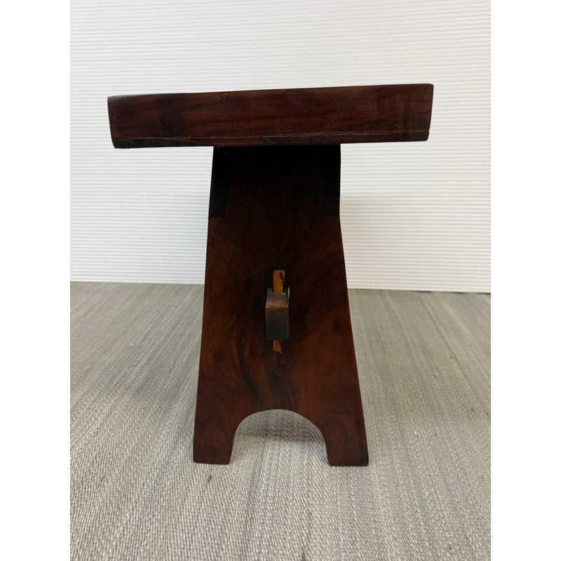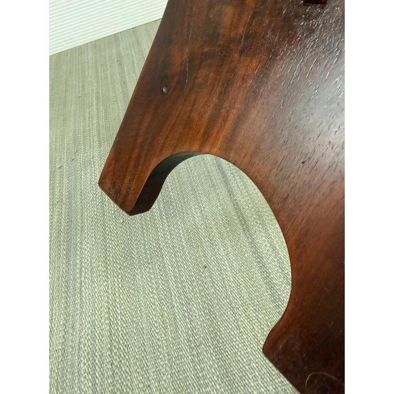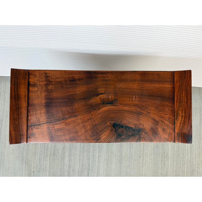 Design Plus Gallery presents a Wabi Stool crafted by California Artist/Woodworker John Borden. The unique stool is hand made of solid walnut wood with a semigloss finish. The material is what is known as Claro Walnut that is known for its rich, often highly figured grain patterns and captivating colors ranging from light to dark chocolate brown, sometimes with hints of gray, purple, or red. It can also feature lighter golden markings and contrasting near-white sapwood. Is in good condition for its minimal usage. The surface is finished at every angle with precision cut base of the same wood grain. Is in good condition with minor visible wear that is consistent with minimal usage; missing varnish in spots on base. Made in USA.