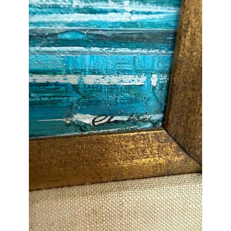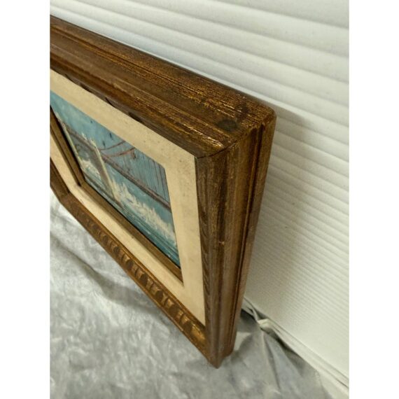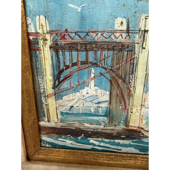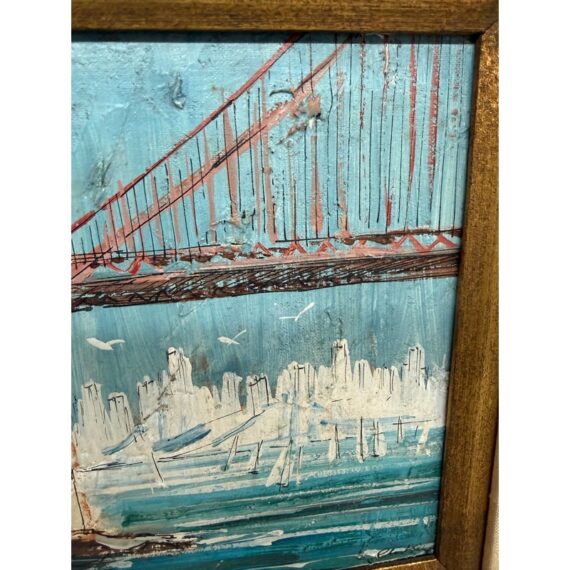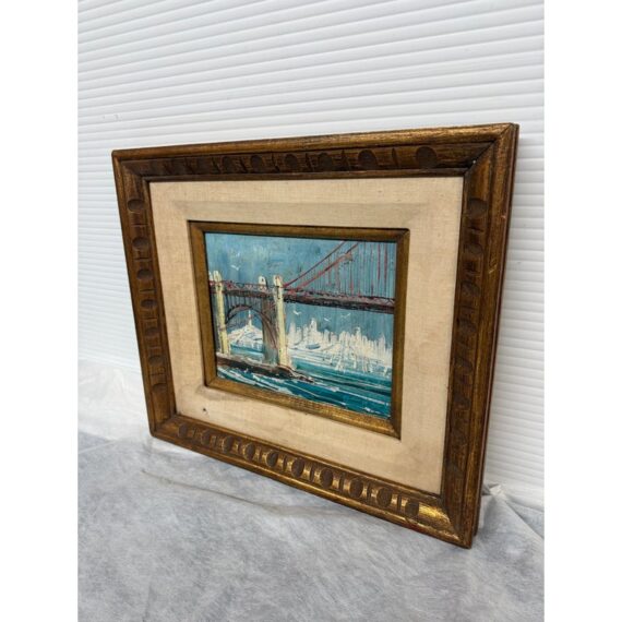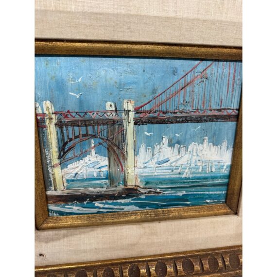 Absolutely beautiful mid century oil painting by renowned artist John Leonard Checkly (1922-1991). This painting features textured gesso on canvas board and features a scene of Fort Point and Golden Gate Bridge in San Francisco. It is signed at the lower right corner by the artist. It appears to be in the original frame. It is in good vintage condition.