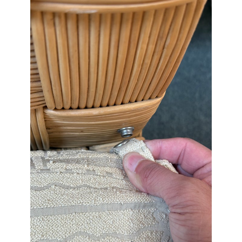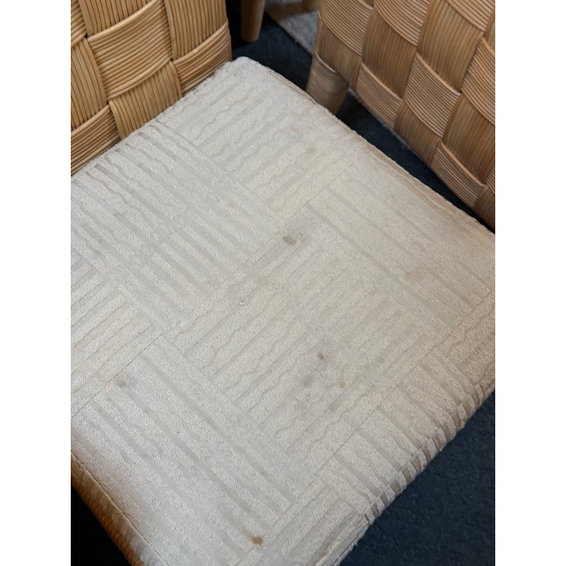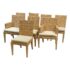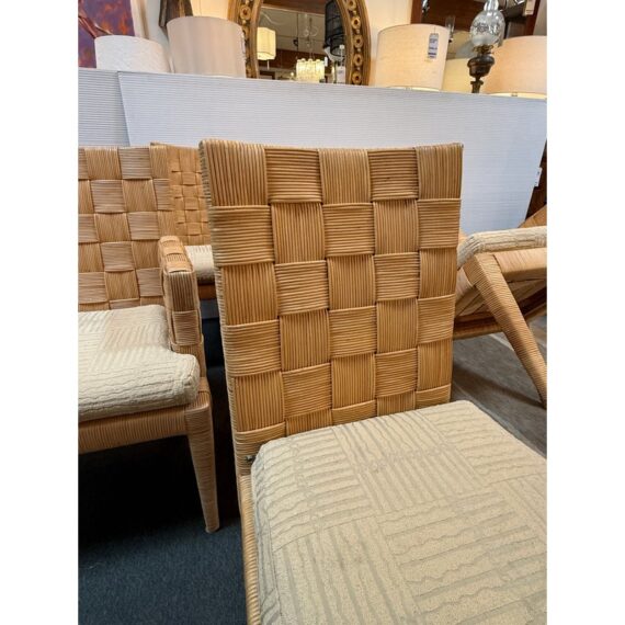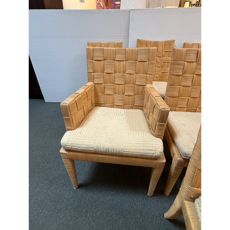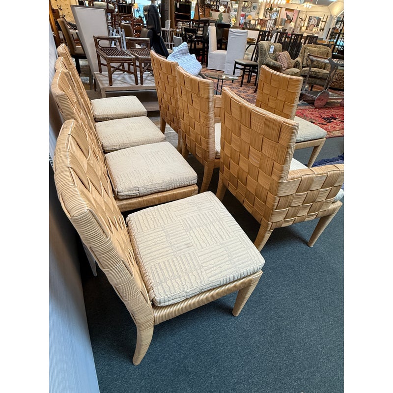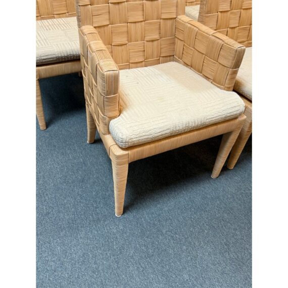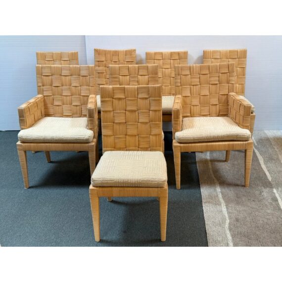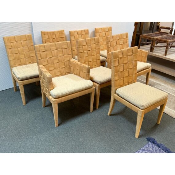 Design Plus Gallery presents a Set of Eight Block Island Dining Chairs by Donghia. From the limited production Block Island collection created by John Hutton (1947-2006) for Donghia, circa 1995. Each chair bears a stamp on its underside. This design is Hutton’s graphic, highly textured interpretation of the work of Jean-Michel Frank. This stunning set of eight dining chairs (two with arms) is handcrafted from solid oak framework overlaid with an intricate basket-woven design using cane rattan in a light natural finish. Custom, welted seat cushions in a contemporary textured jacquard with zippers (for cleaning or replacement) snap to the frame to fit snugly. Fabric shows soil and wear; frames are in good condition for age and use.