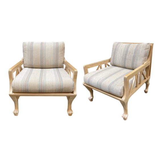 Design Plus Gallery presents the John Hutton Pair of “Thebes” Chairs for Randolph & Hein. Colorful striped fabric with ribbed texture covers the cushions. The frame is a light finished wood, and the legs are shaped like paws. The “Thebes” chair was designed in an Egyptian Revival style by San Francisco native John Hutton in 1976 for Randolph & Hein.