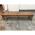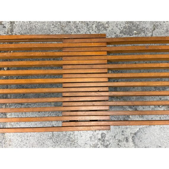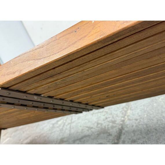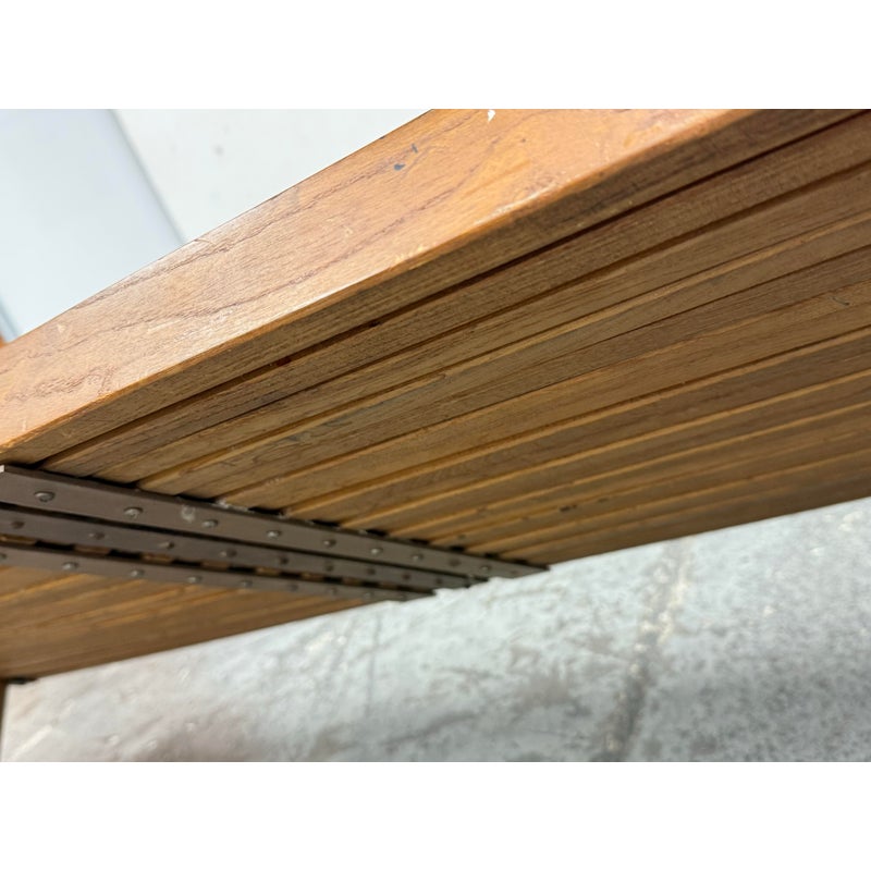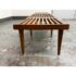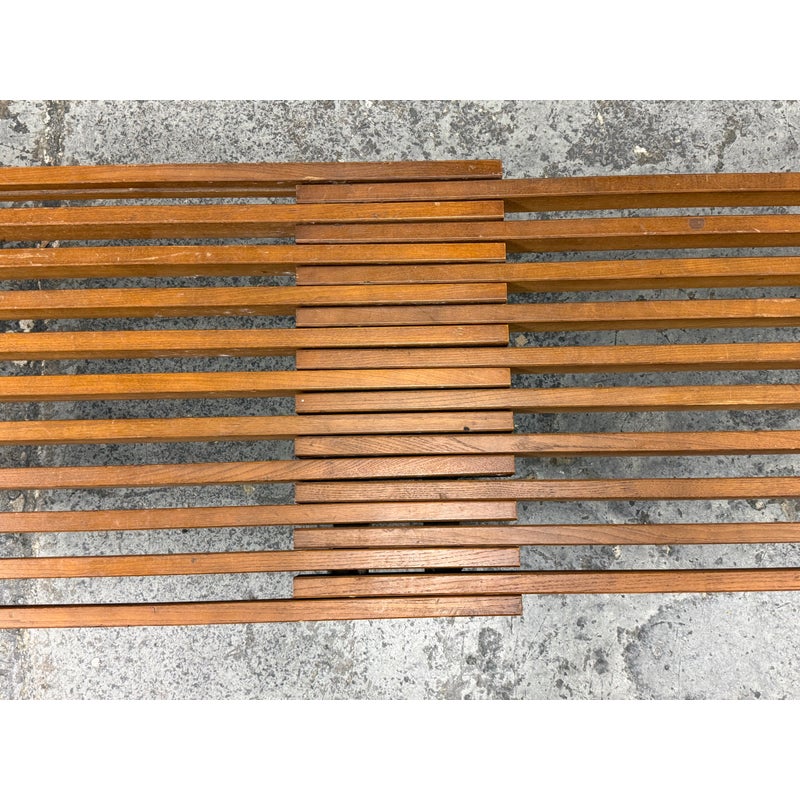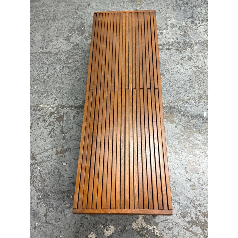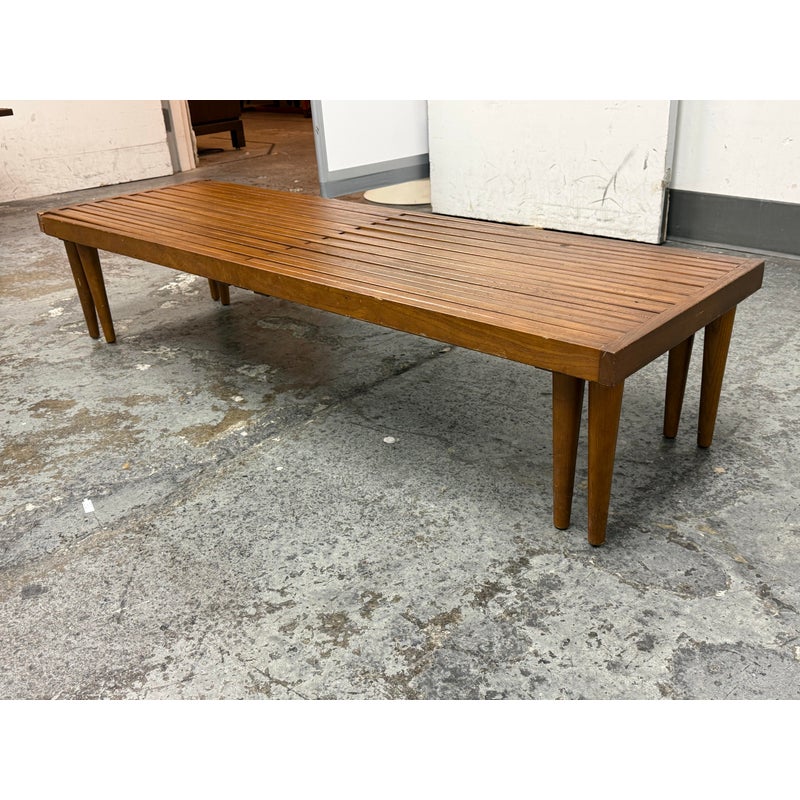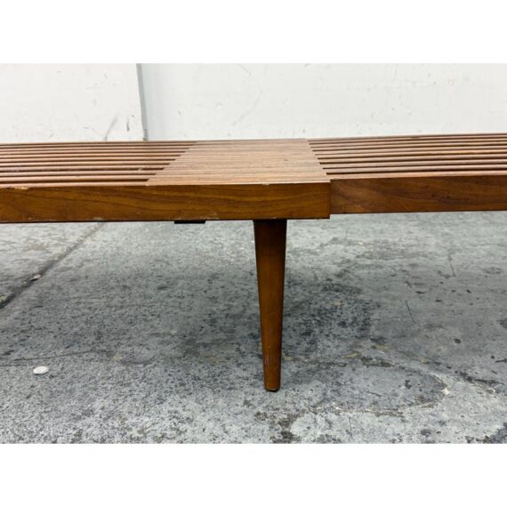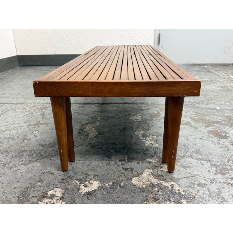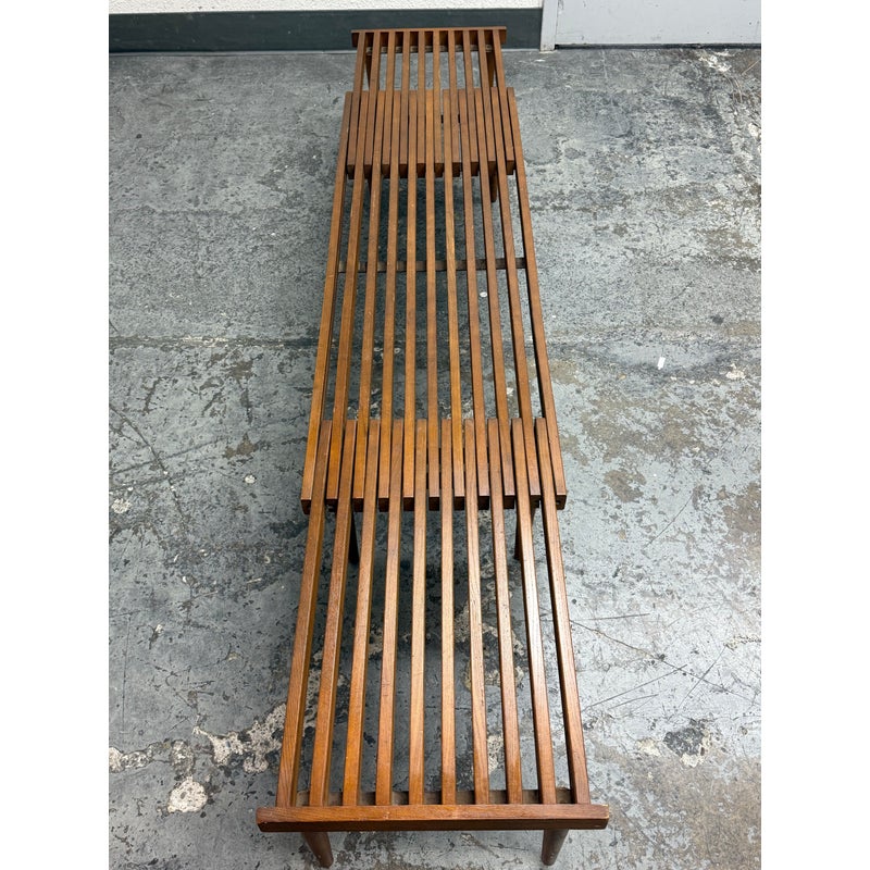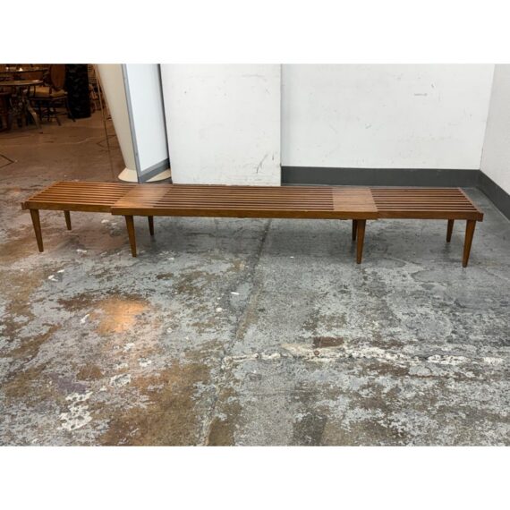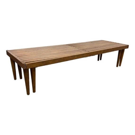 Design Plus Gallery presents an Expandable Slat Bench by John Keal for Brown Saltman. This bench has two ends that pull-out extending to over 7ft long creating a versatile solid oak walnut-stained bench, coffee table, plant table, etc. Features classic mid-century rounded tapered legs, dark oak wood, and clean minimal lines. It is in good condition for its vintage age. Doe does not have a logo label, Made in the 1960’s and in the USA.