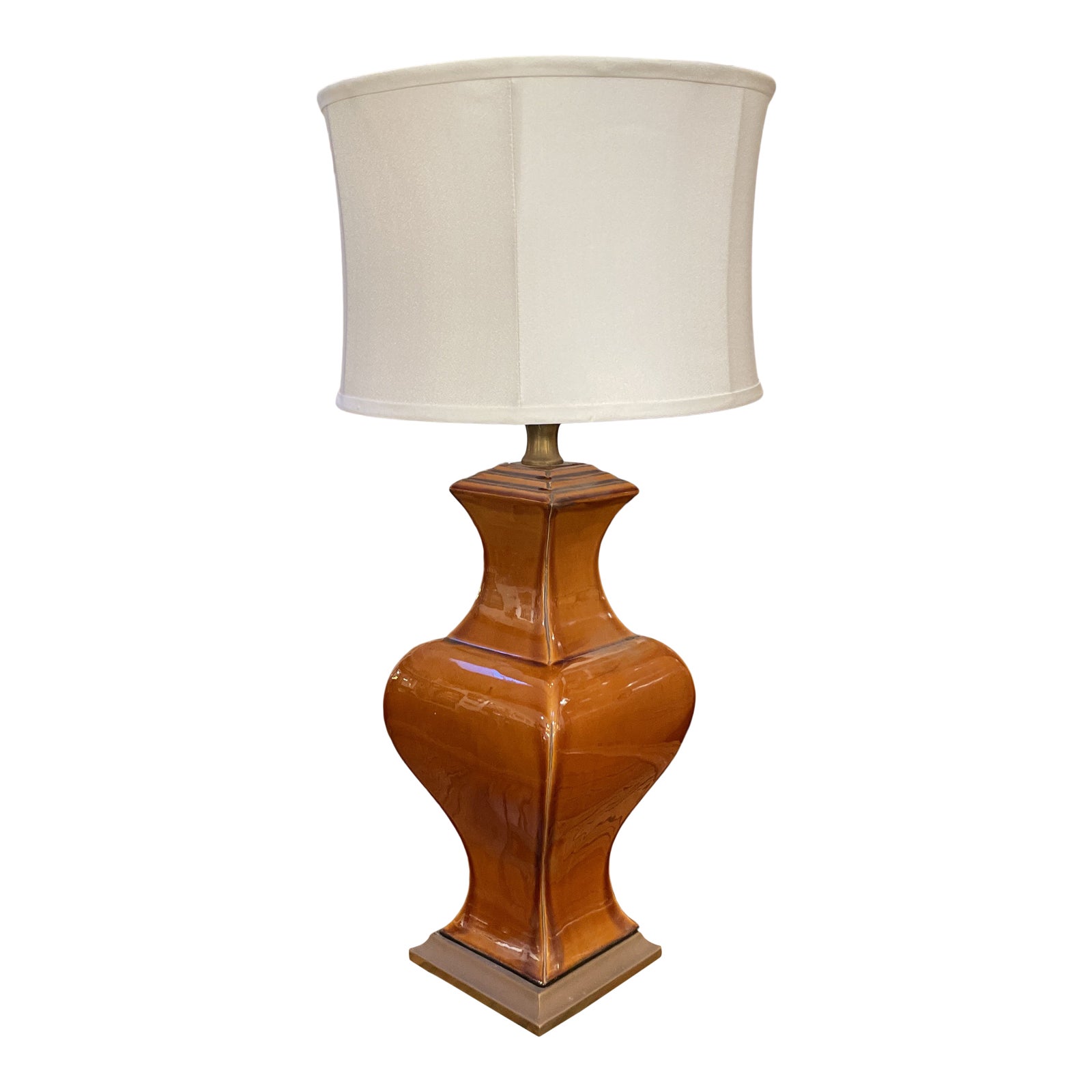 Design Plus Gallery presents a John Richard Amber Ceramic Table Lamp. Lamp sits atop a bronze finished metal base. Sculptural urn form has a slender silhouette with a rich and deep glaze. Comes with a small white barrel shade. Minor wear.