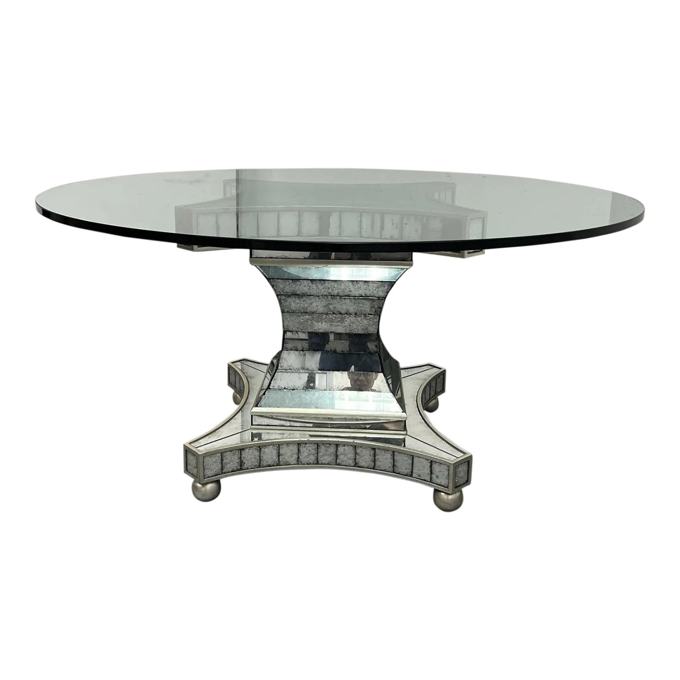 Design Plus Gallery presents a John-Richard Collection Erlinda Dining Table. A single mirrored pedestal is inlaid with eglomise strips and tiles. Frame is trimmed with wood in an aged champagne finish. A light and airy bevelled round glass complements the reflective and elegant quality of the base. There is minor wear through out, dining table is in good condition. John Richard works with a world of inspiration, channeling cultural + historical influences. Known for skillfully blending the past with the best of that is in fashion with home design making for pieces which blends with an array of styles.