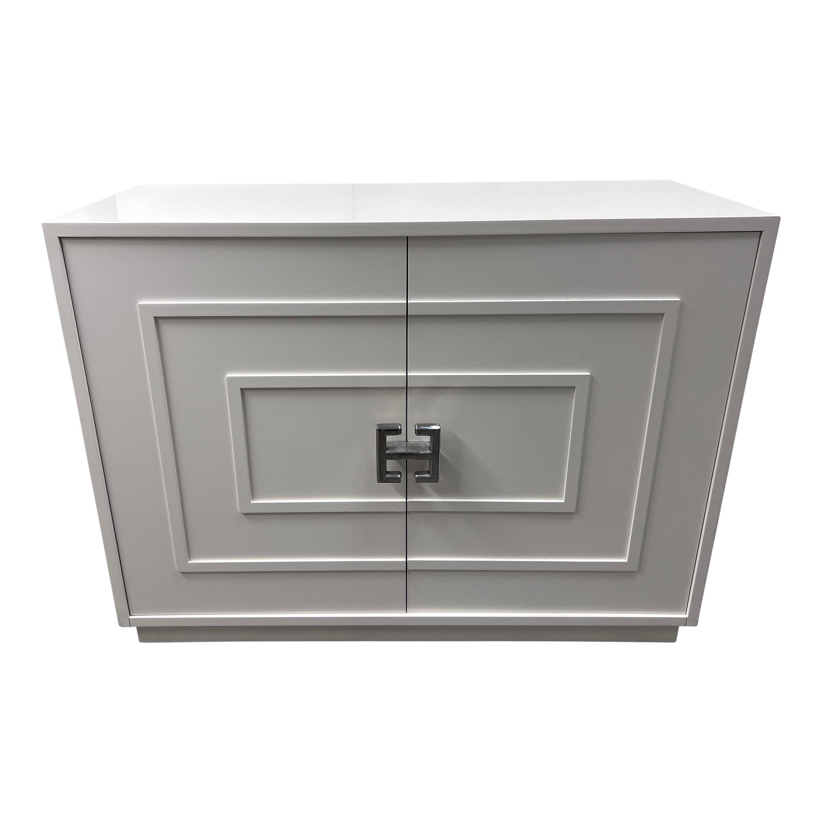 Design Plus Gallery presents A Elizabeth Alabaster Cabinet by John Richard. A stunning piece that will instantly capture attention in any room. It is elegantly painted in alabaster white, creating a crisp and clean look. The front of the cabinet features a unique raised square geometric motif, adding dimension and texture to the design. The dynamic chrome finish hardware on the doors adds an element of modernity and sophistication. This cabinet is not only aesthetically pleasing, but also highly functional. It features two doors that open to reveal a spacious interior. Inside, there is one adjustable single shelf that allows for flexible storage solutions. This makes it perfect for storing a variety of items, whether you need it for organizing your living room, dining room, bedroom, or office space.In Good Condition, visible and minor wear form usage + age. Made in Vietnam.