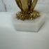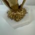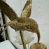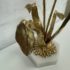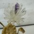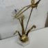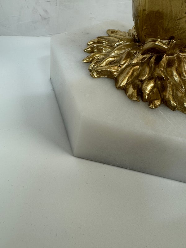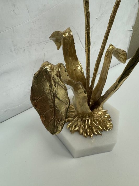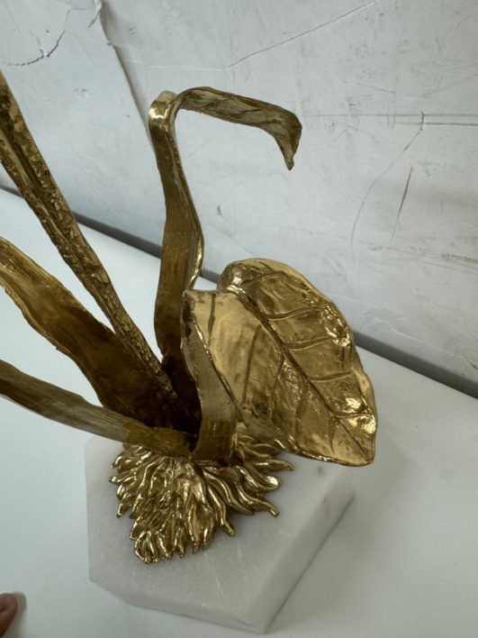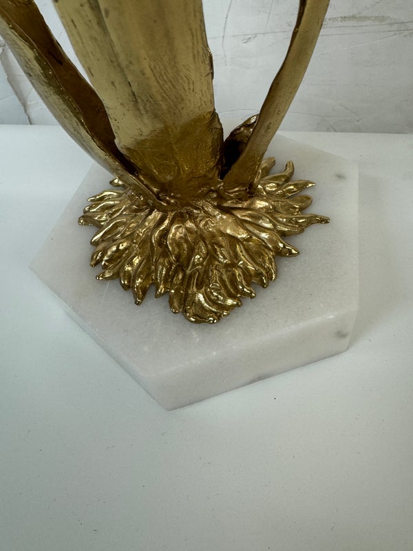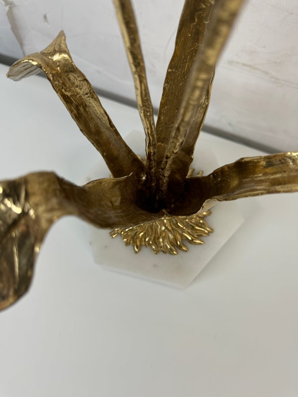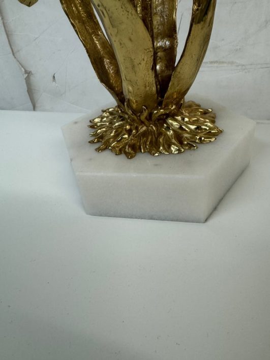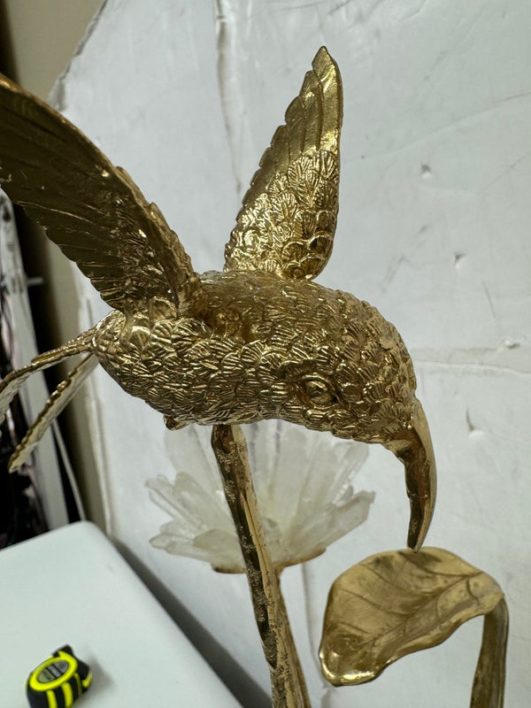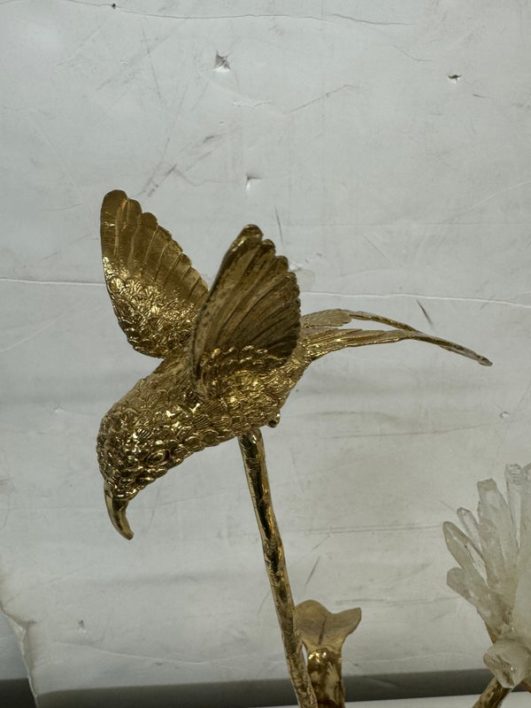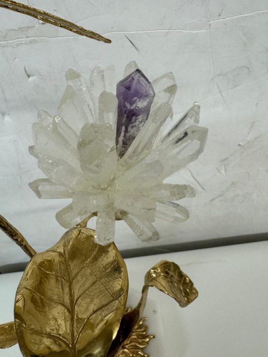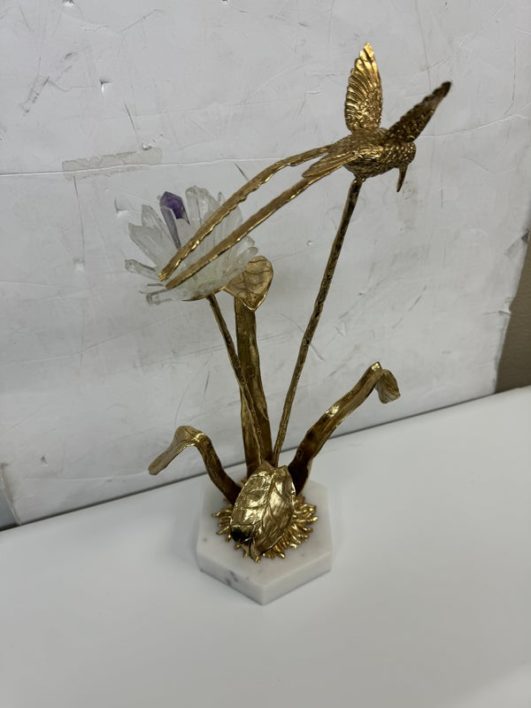 Design Plus Gallery presents a Flower & Hummingbird Sculpture by John Richard. An ethereal sculpture featuring a white quartz flower with purple center blooming from its lovely solid brass plant, while a curious hummingbird hovers above. The sculpture is supported on a white marble base. Little evidence of wear; conditions are good for age.