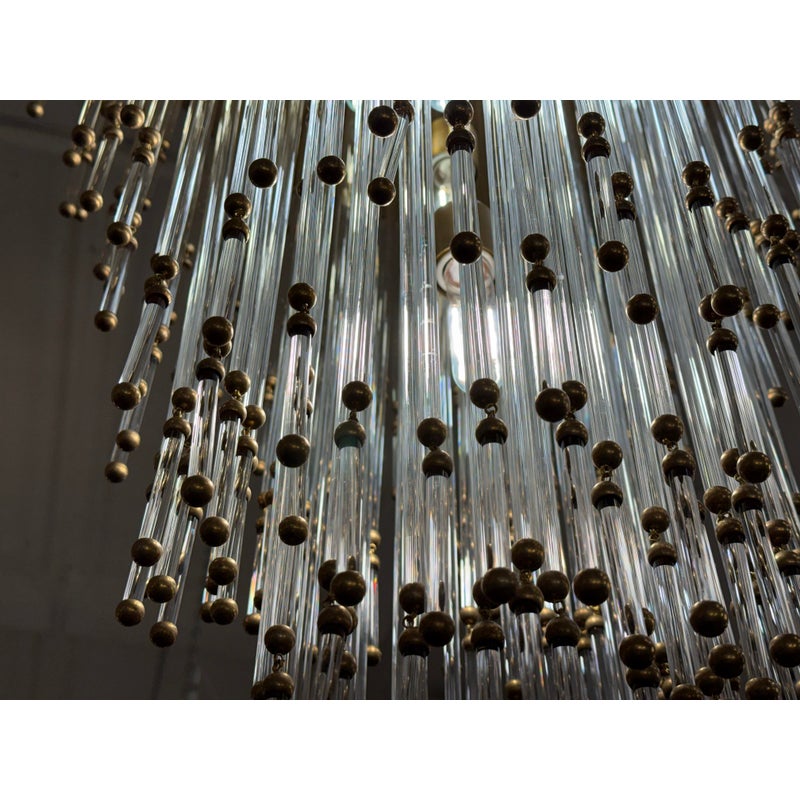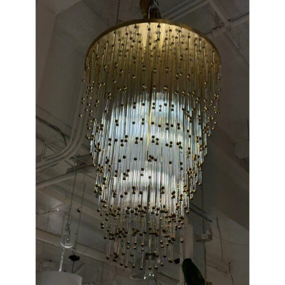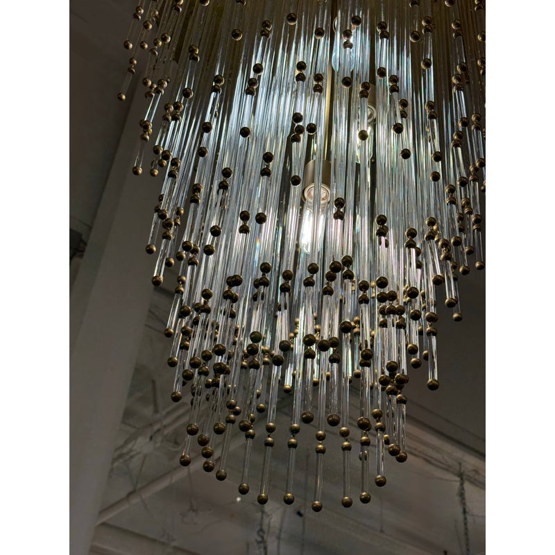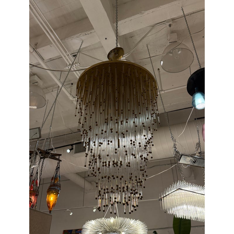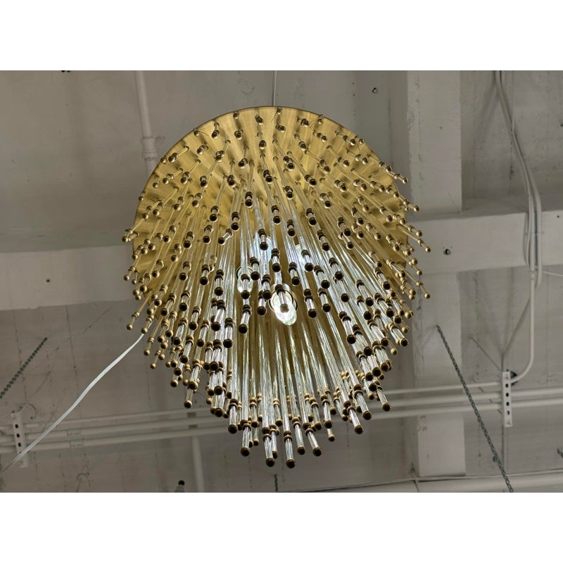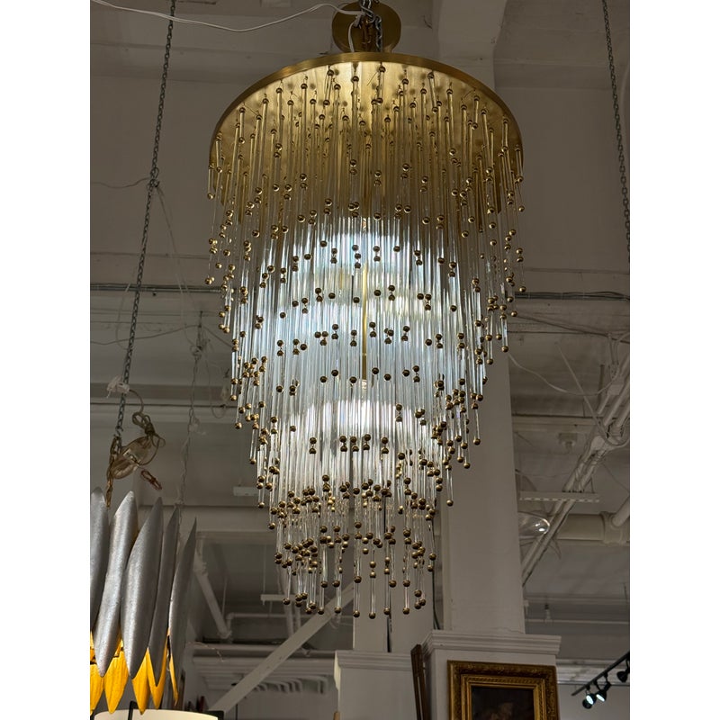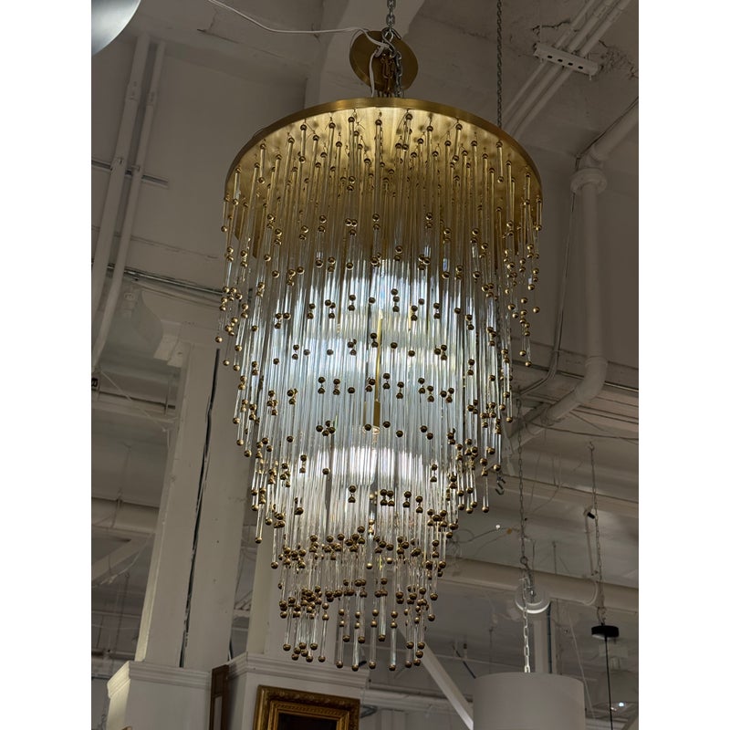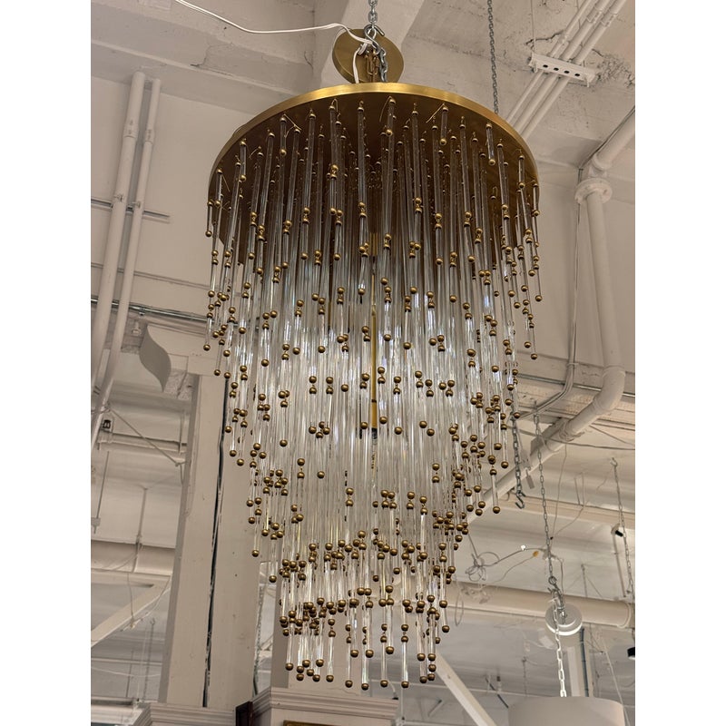Design Plus Gallery presents the Mia Chandelier by John Rosselli for Visual Comfort Signature Collection. The chandelier offers a blend of timeless glamour with modern refinement. The fixture is dripping with dozens of slender clear glass rods tipped in warm brass accents that creates a cascading silhouette. Its layered form subtly nods to Old Hollywood elegance, while the clean, tapered shape keeps the design feeling fresh and contemporary. Finished in hand-rubbed antiqued brass, the Mia chandelier casts a warm, inviting glow and will captivate all that comes across its grandeur. The chandelier is no longer in production with the brand and is in good condition, minimal wear from usage.