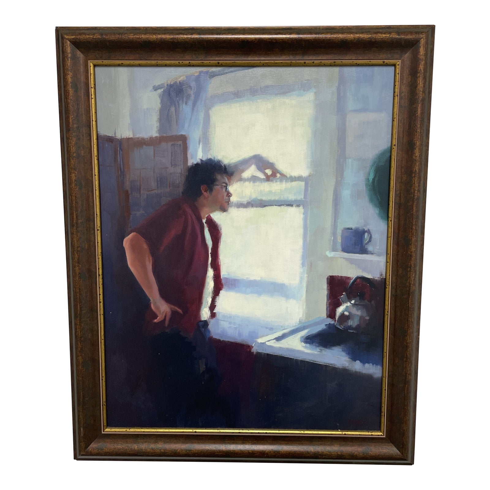 Design Plus Gallery presents a John Wentz Self Portrait Oil Painting. Signed by the artist on the back of frame and on the lower right corner. Beautifully framed with a gold gilt finish wood beveled frame. The artist portrays himself looking out a bright window in a contemplative mode. The light source iluminates the rich and deep shadows of the interior space with a predominately cool palette with anchoring navy and maroon tones. Little evidence of wear, good condition. Oil paint adds a subtle sheen which furthers the reflective state.