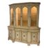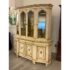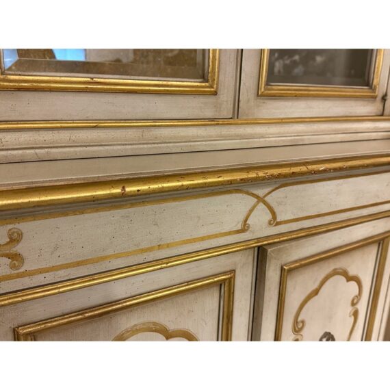 Design Plus Gallery presents a Louis XVI China Cabinet by John Widdicomb. The vintage cabinet encapsulates the style and grandeur of Louis XVI styling. The entire cabinet has a parchment toned finish with golden details around the abundant molding. There are four glass doors on the top portion of the two piece cabinet. The doors open out to reveal a lighted cavity with glass shelving, dividing the space into thirds. The base portion also has four doors that open to reveal a single wood shelf each to diving the space in half. There is an old fashioned piece of paper of type write on the backside with the cabinet information, directly from the vendor many decades ago. It is in good condition for its vintage age + use. Made in the United State of America.