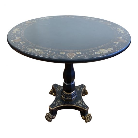 Design Plus Gallery presents an occasional side table for John Widdicomb Company. Designed by the Renowned Designer Mario Buatta for the Mario Buatta Collection. A round beveled edge top that sits on a claw foot pedestal base. Hand painted accents on the surface and frame. Visible wear from usage and age.