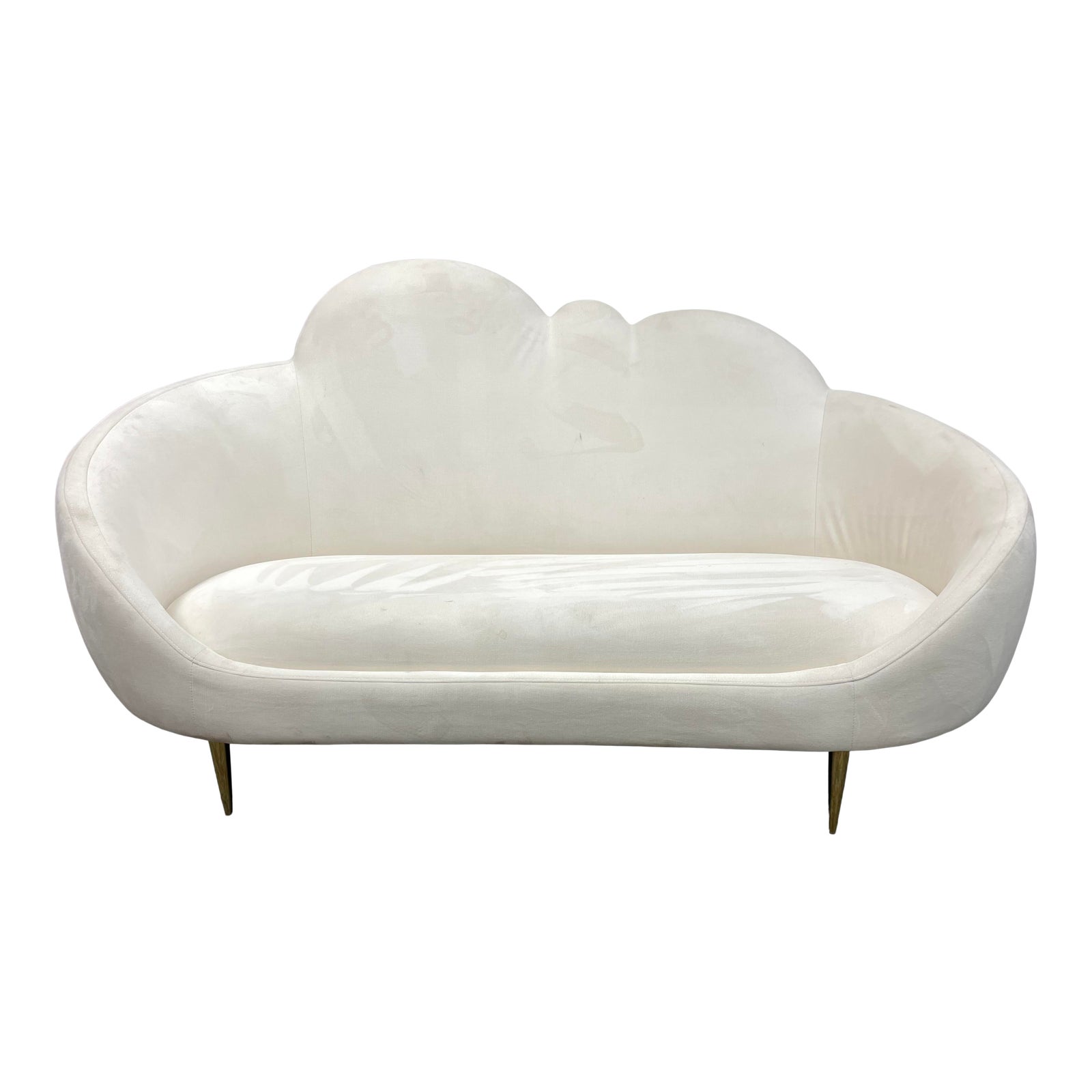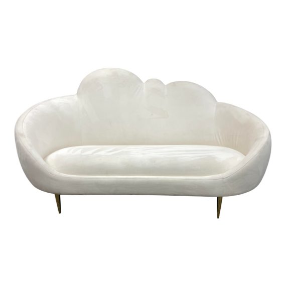 Design Plus Gallery presents a Ether Cloud Settee by Jonathan Adler. Low, loungey, and trés comfortable, a simple genesis story: JA wanted to create a settee that looks and feels like heaven. The chic cloud silhouette and lozenge-like form are enveloping and inviting, while gleaming brass stiletto legs add lift and polish fit for a formal parlor. Finished in luxe ivory velvet, it’s ethereal, edgy, and oozing elegance. Visible wear on fabric. Will need a professional cleaning.