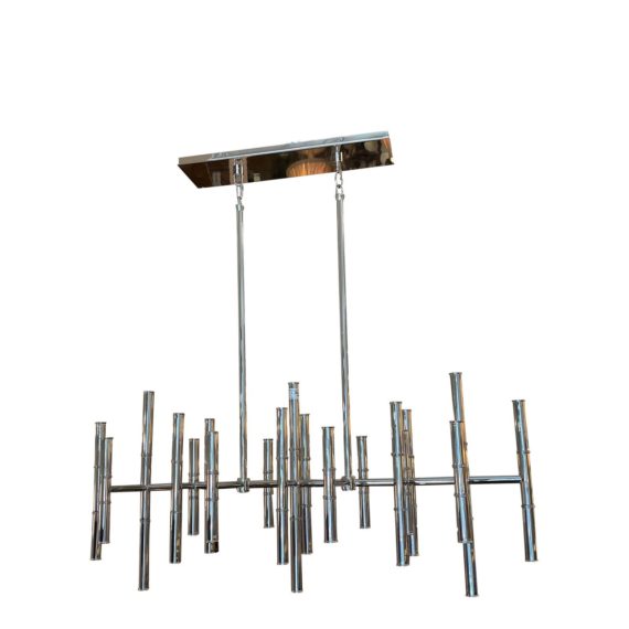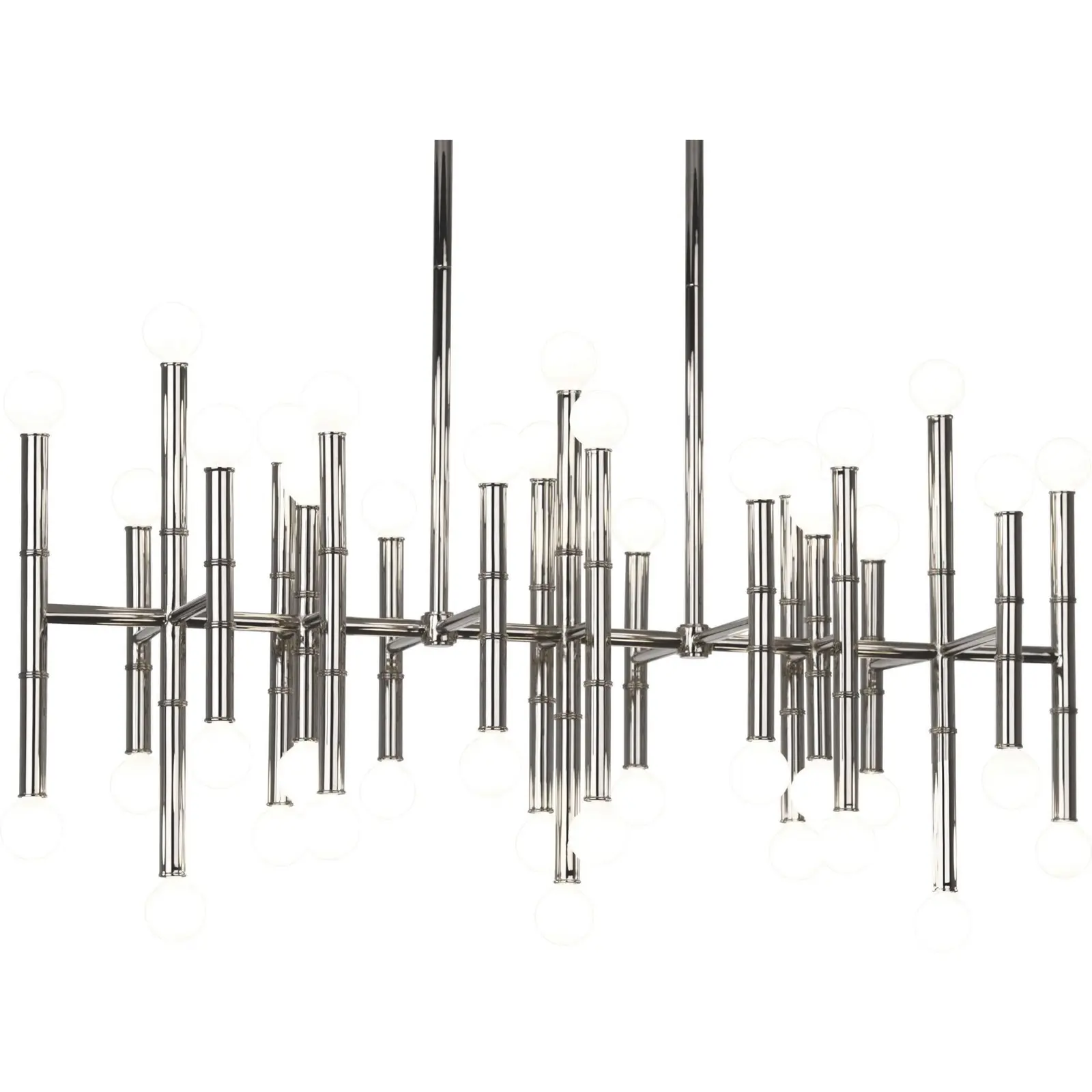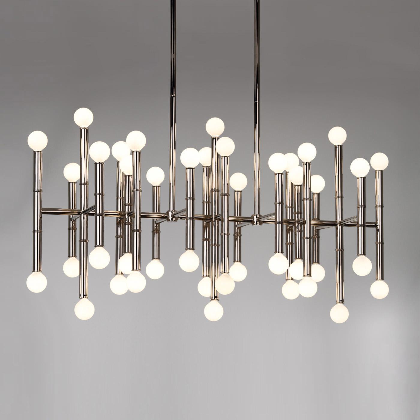 Design Plus Gallery presents a Jonathan Adler 42 Light Meurice Sputnik Chandelier. The iconic collection by Jonathan Adler is a Hollywood Regency staple. A myriad of steel tubes creates a striking composition for the contemporary forty-two-light chandelier. Minor wear, good condition. Bulbs not included.