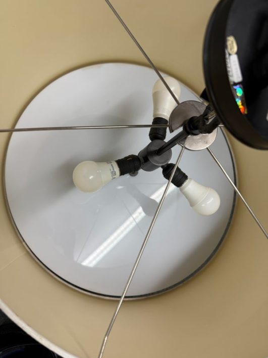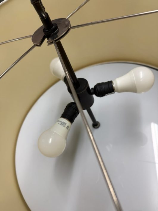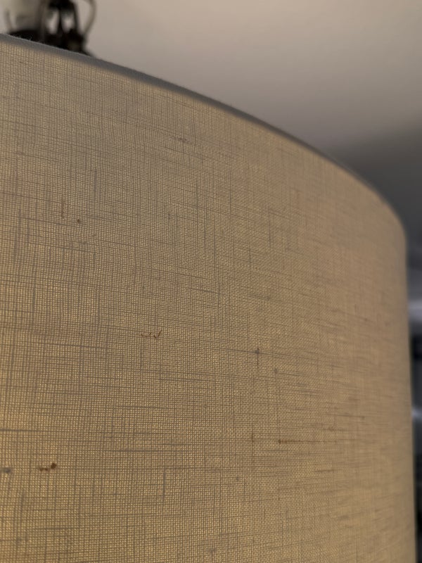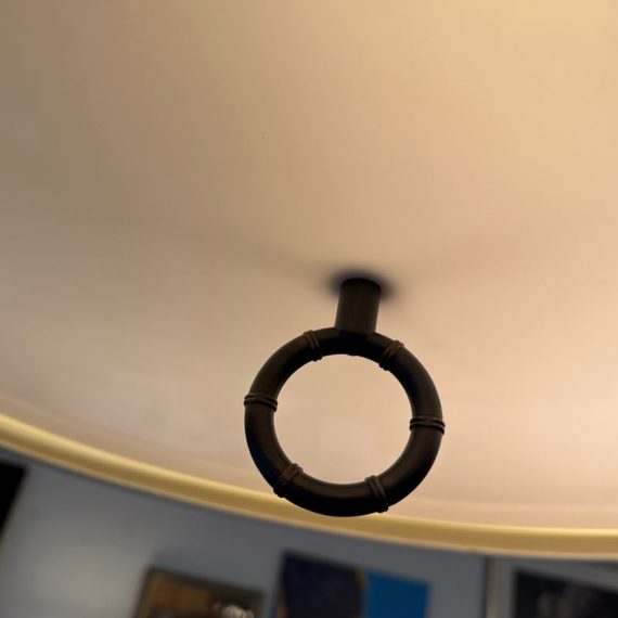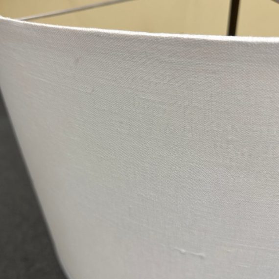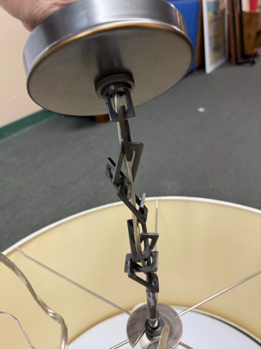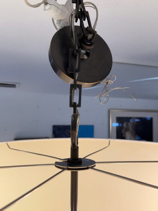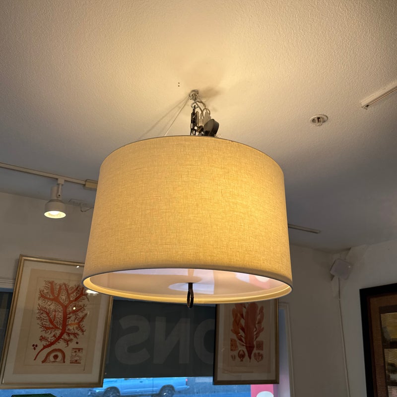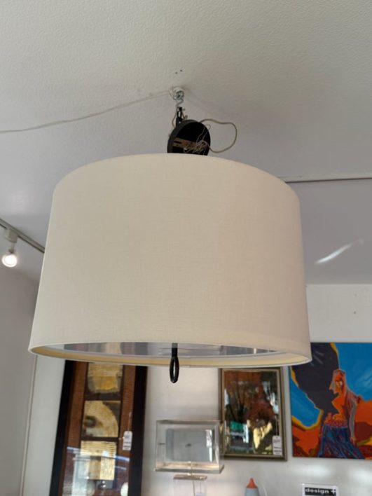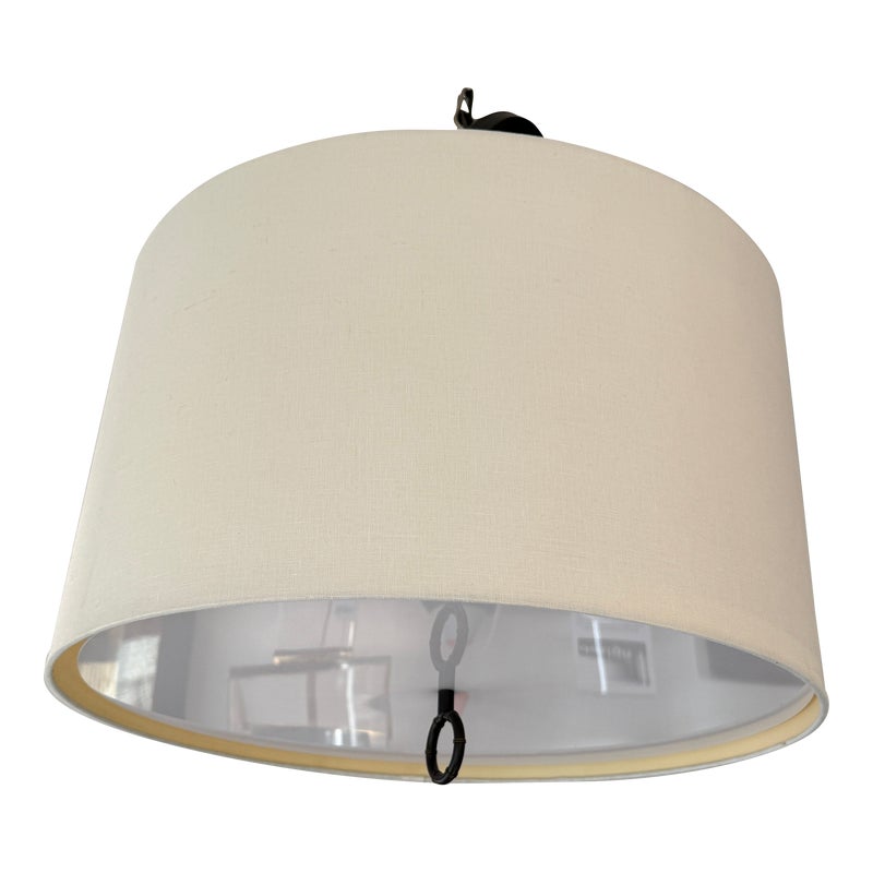 Design Plus Gallery presents the Meurice Pendant by Jonathan Adler. This modern references are simple silhouette contrasted with antiqued bronze metal finishes.. A crisp white drum shade finishes the look, diffusing three bulb glow. Little evidence of surface wear; condition is consistent with age and use.