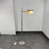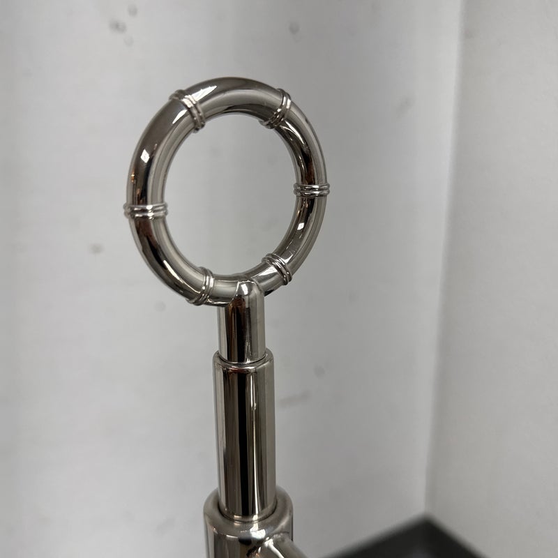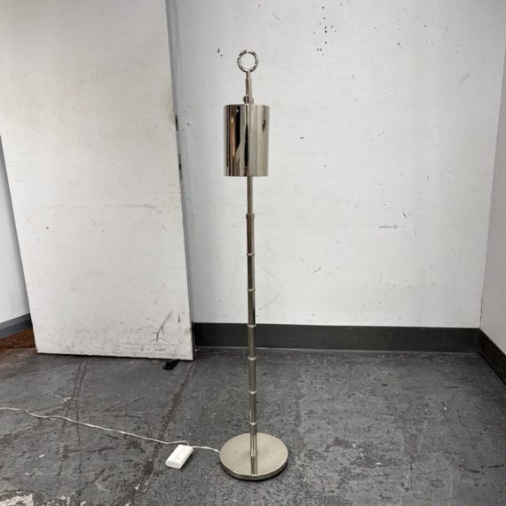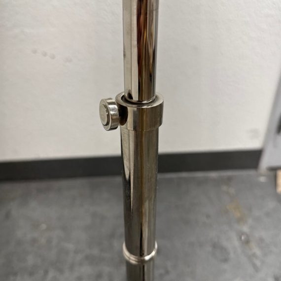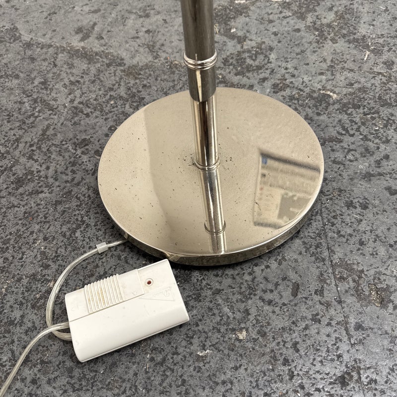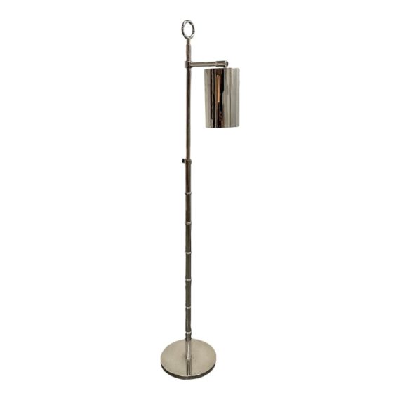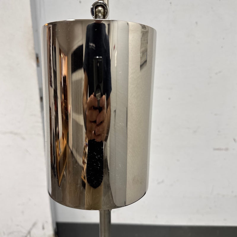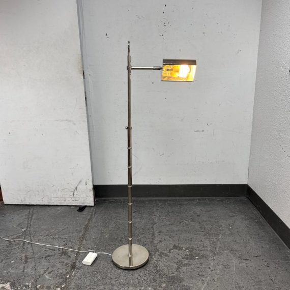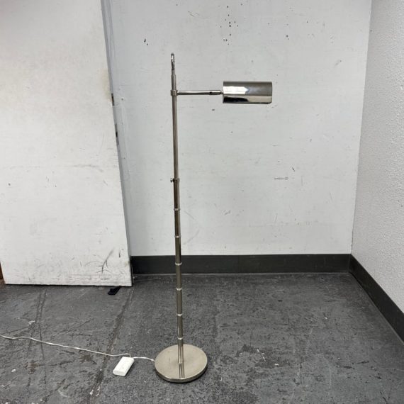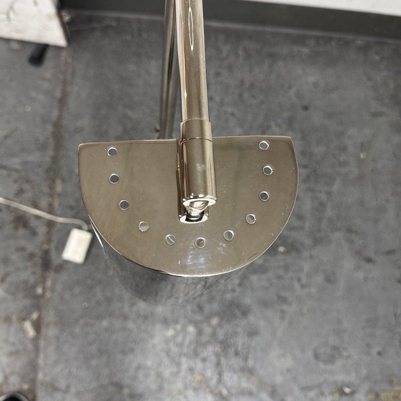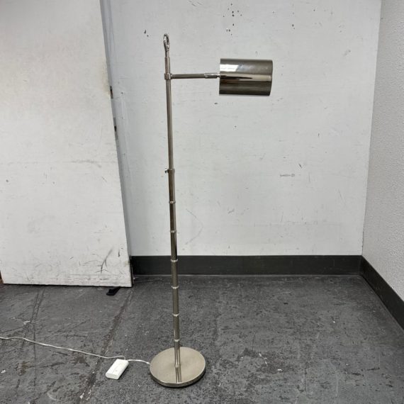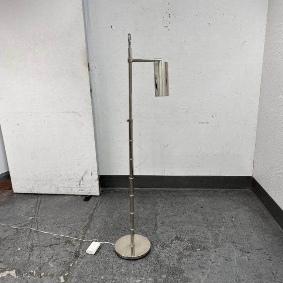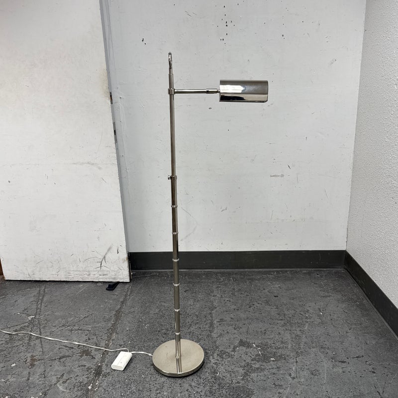Design Plus Gallery presents a Meurice Modern Chrome Finish Adjustable Height Pharmacy Floor Lamp by Jonathan Adler for Robert Abbey. A classic pharmacy style floor lamp. Modern chrome finish. Steel construction. Cast metal shade.In good condition, visible minimal wear from usage + age. This is a discontinued finish.
