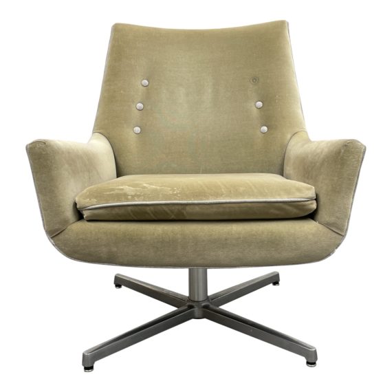 Design Plus Gallery presents a Mrs. Godfrey Swivel Chair by Jonathan Adler. A small profile, but a big presence. Armed with an elegant swoop and slight pitch, it brings maximum comfort to a cozy space. Piped edges and buttons at the back are the tailored touches that look right at home in a Park Avenue penthouse or Bermuda beach house. Upholstered in a dark cream velvet. Visible wear and stains on the fabric all over chair. One tufted button is missing. Made in USA.