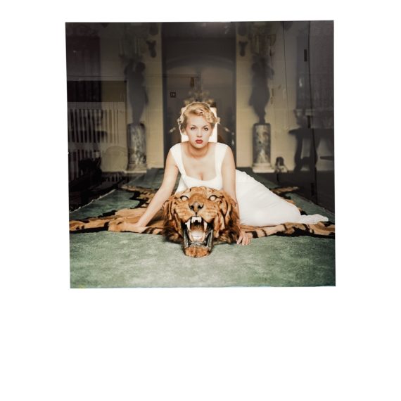 Design Plus Gallery presents a Jonathan Adler Slim Aarons “Beauty + the Beast” Photo. Iconic 1959 image from photographer Slim Aarons captures Lady Daphne Cameron on a tiger-skin rug in socialite Laddie Sanford’s Palm Beach home. Printed on a luxurious glossy metal. The back has an integrated cleat for wall hanging and floats from the wall for a modern and minimalist effect. Minor wear on surfaces, art piece is in good condition.