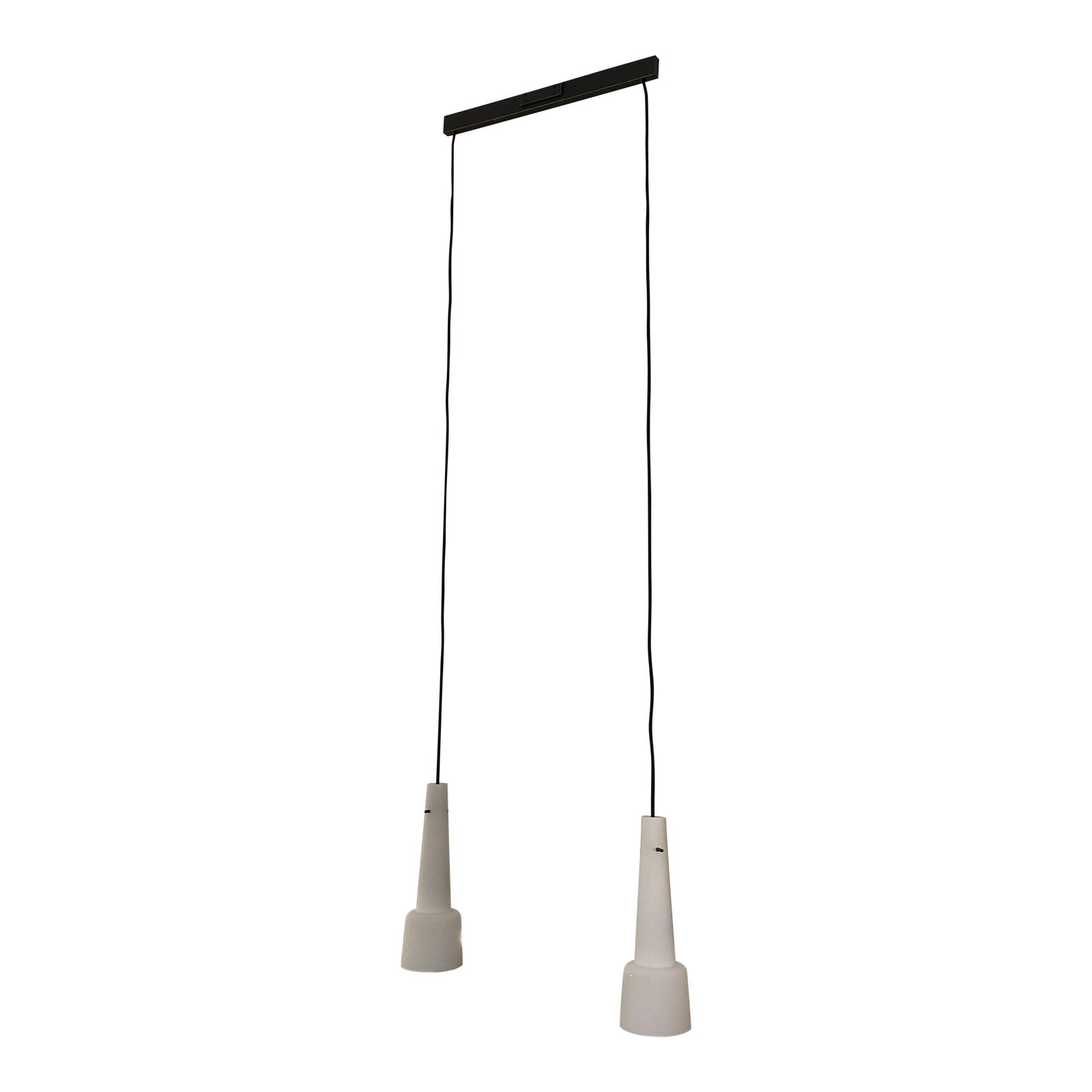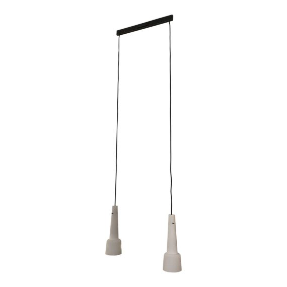 Design Plus Gallery presents a NEW Kalmar Werkstaetten Keule Double Pendant by Jonathan Browning Studios. Originally designed by Kalmar Werkstaetten of Austria in the 1940’s, the Keule Double Pendant has shades of Opalglass Satinmatte. The ceiling plate and stem have been machined by hand. All parts are hand polished and plated. The textile wire is woven with kevlar. The cords are the original length, can be adjusted.