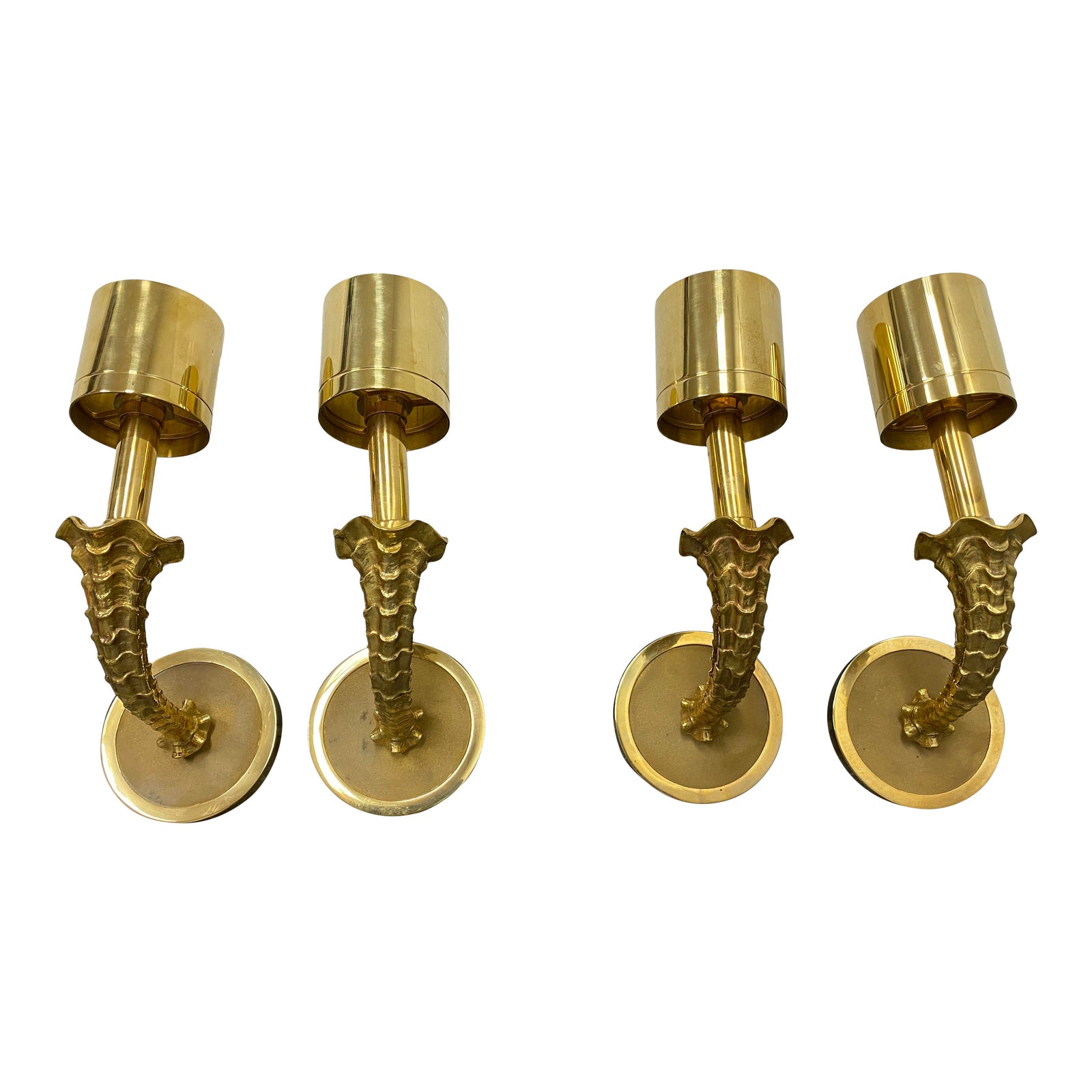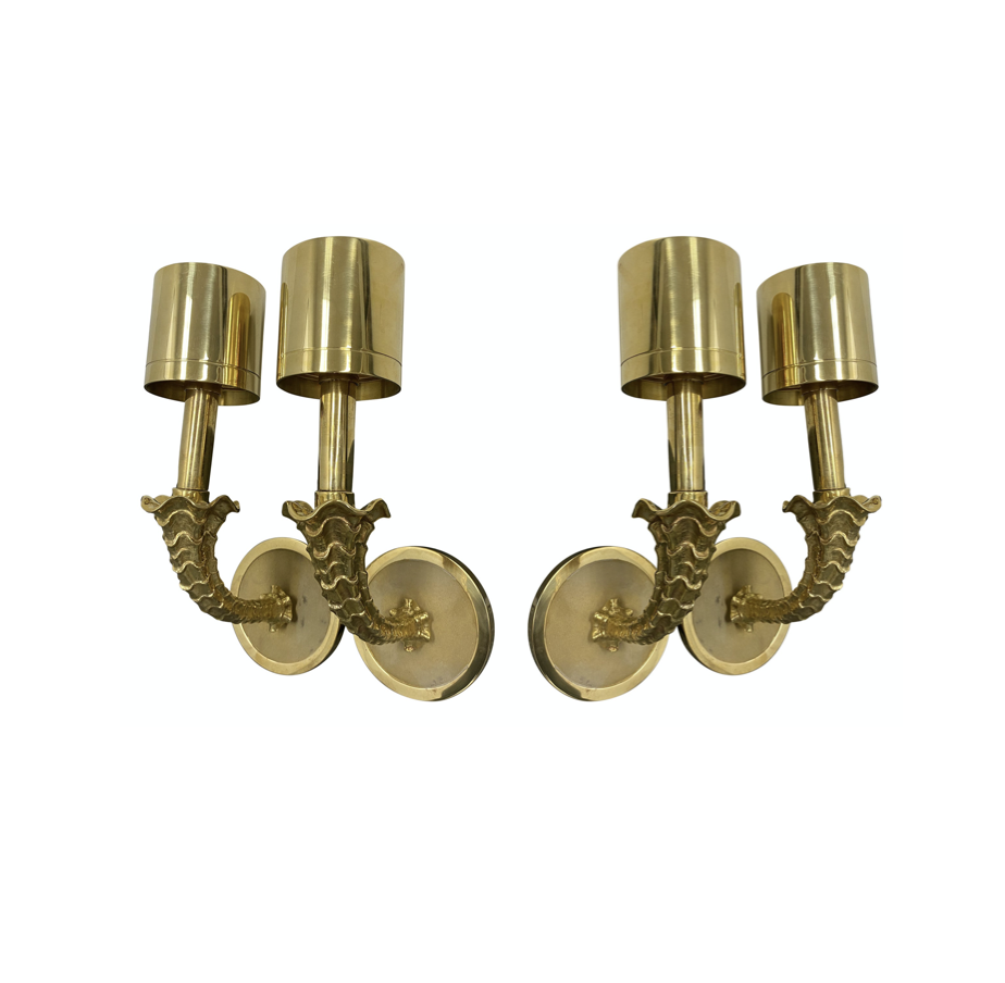 Design Plus Gallery presents a set of Four of Martim Wall Sconces by Jonathan Browning Studios. Crafted of solid bronze with a polished gold finish. Its parts have been individually cast from master carvings using the investment cast process. The back plate has been machined by hand. All parts are hand polished and plated. The metal shade is turned on a lathe.