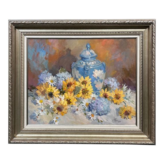 Design Plus Gallery presents ‘Sunflowers in Ginger Jar’ an Oil Painting By Joyce Lee Pike. A lovely tableau that invites the viewer to stop for a moment and enjoy. A blue and white porcelain ginger jar waits to display a bouquet of vibrant sunflowers and delicate hydrangeas. The painting is of beautiful composition and will be a well deserved addition to your home. Is in good condition with wear that is consistent with age + use. Signed by artist in lower right. Custom matted and framed in silver finished wood.