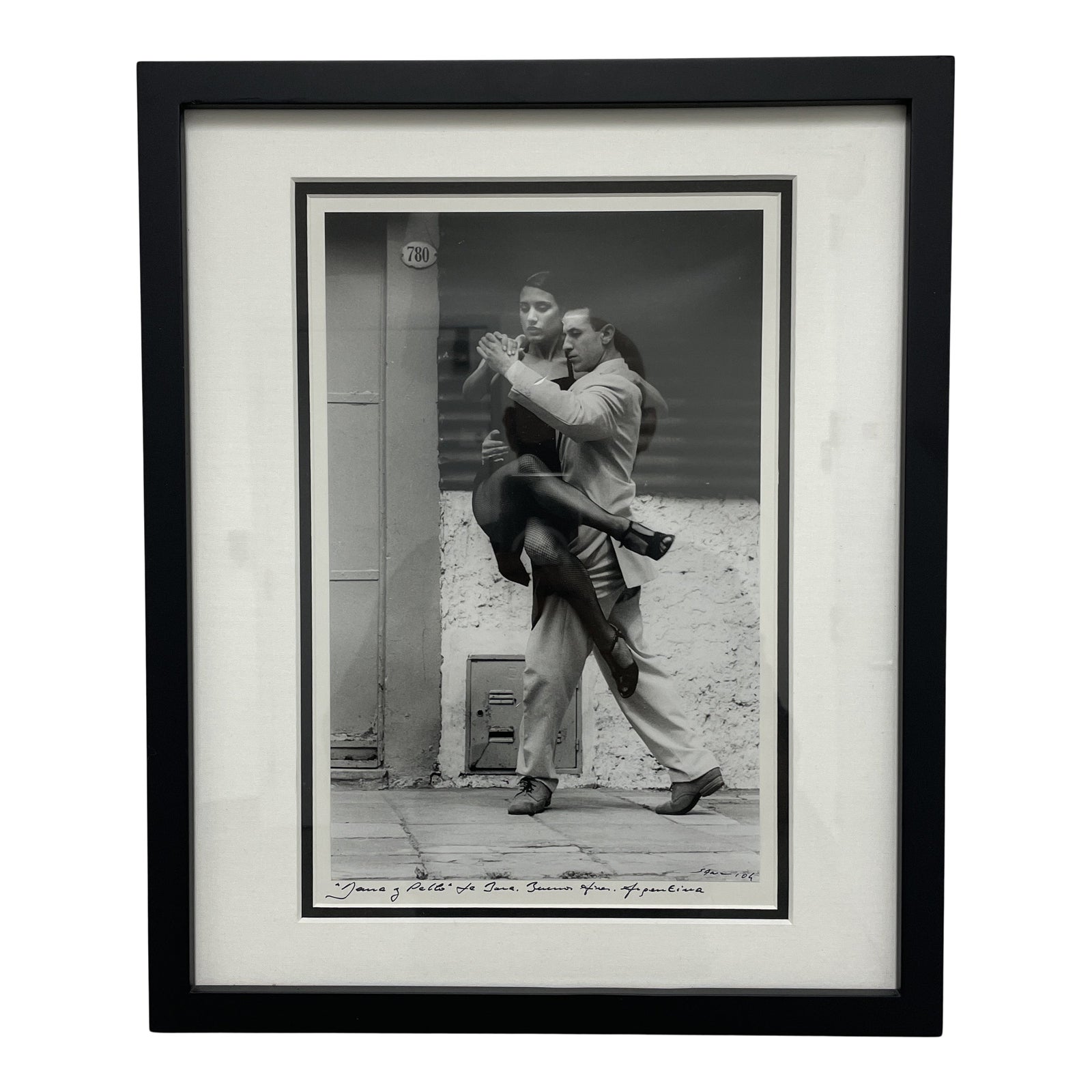 Design Plus Gallery presents a Signed Tango Black & White Photo “Juan & Pello.” Custom framed with a graphic black and ivory matte. Photo portrays two dancers in mid motion on a street.